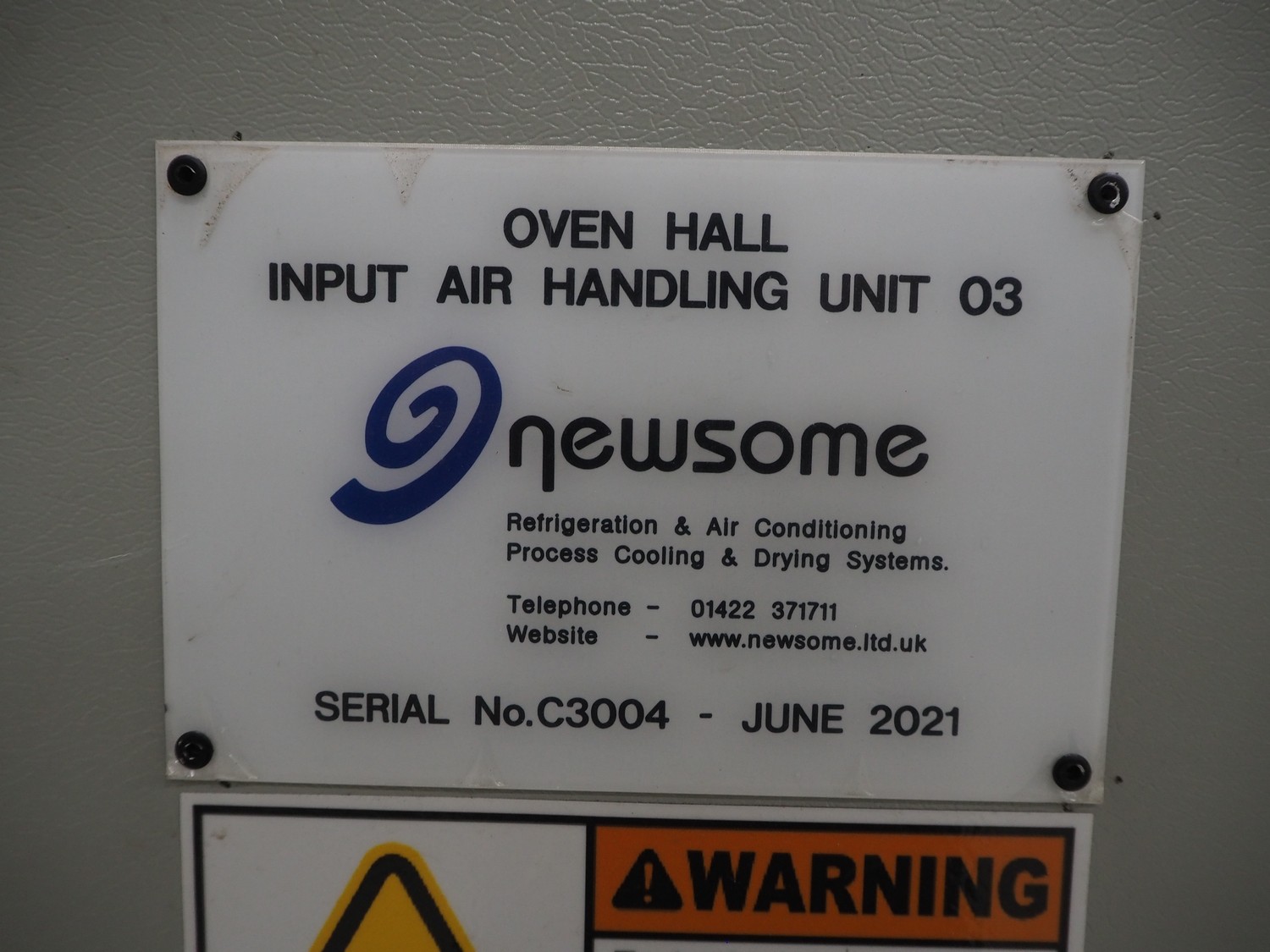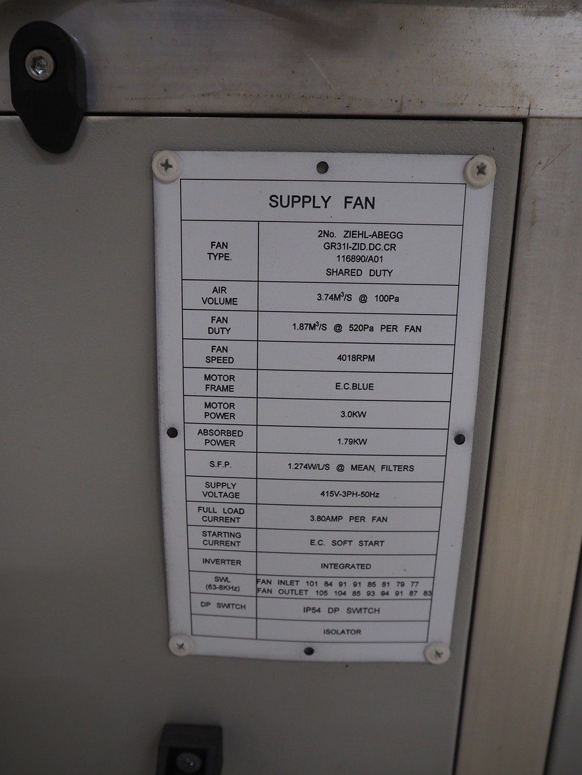 Newsome air handling unit, serial number: C3004, year of construction: 06/2021, 415 V, 3 Ph, 50 Hz, 3.80 A, 3.0/1.79 kW, 4018 rpm, dimensions: 1500 mm x 1200 mm x 2400 mm.