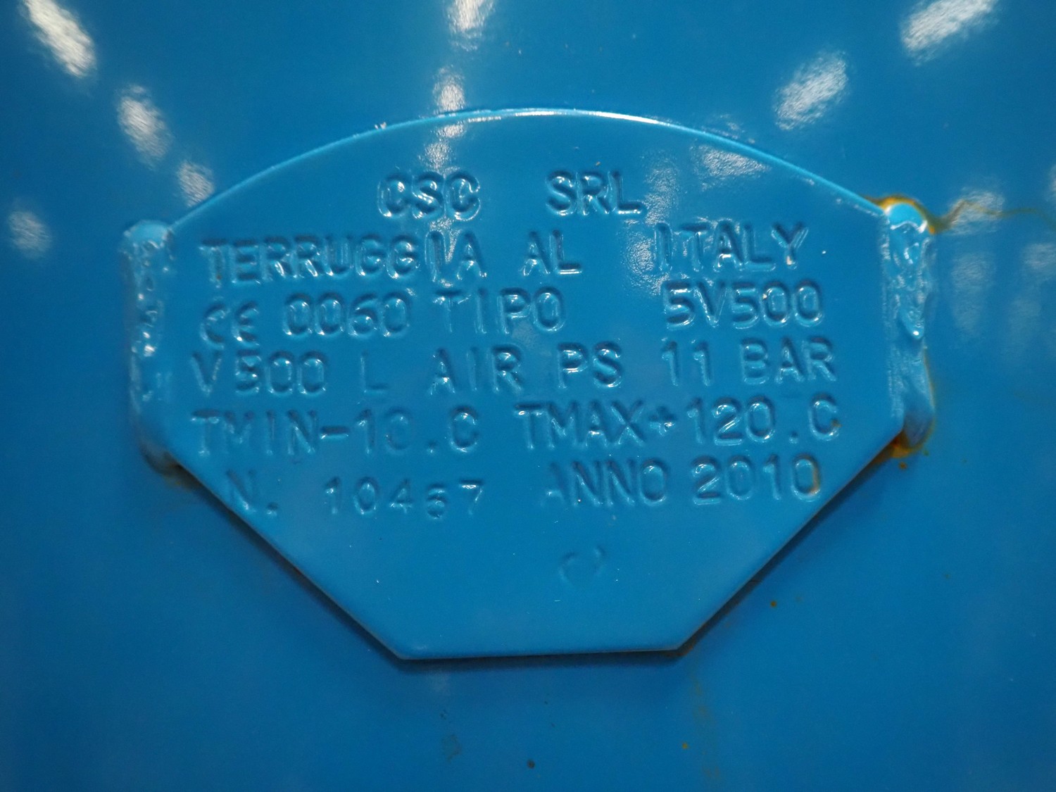 CSL SRL pressure tank, type: 0060, number: 10467, year of construction: 2010, volume: 500 liter, max pressure: 11 bar, max temperature: 120 C°, dimensions: Ø 600 mm x 2170 mm.