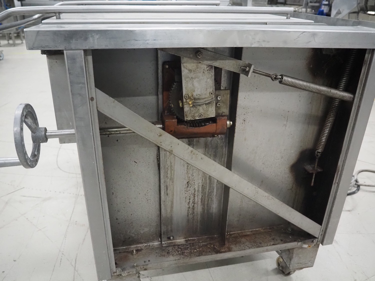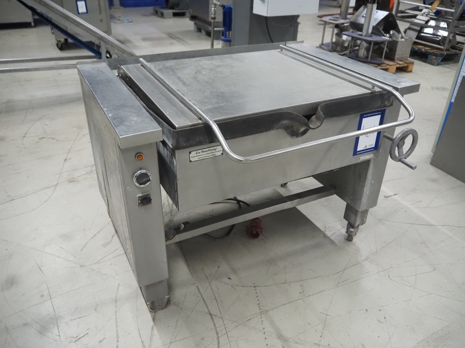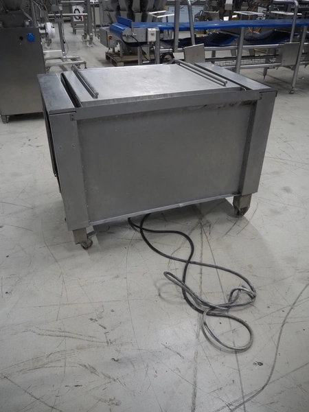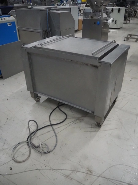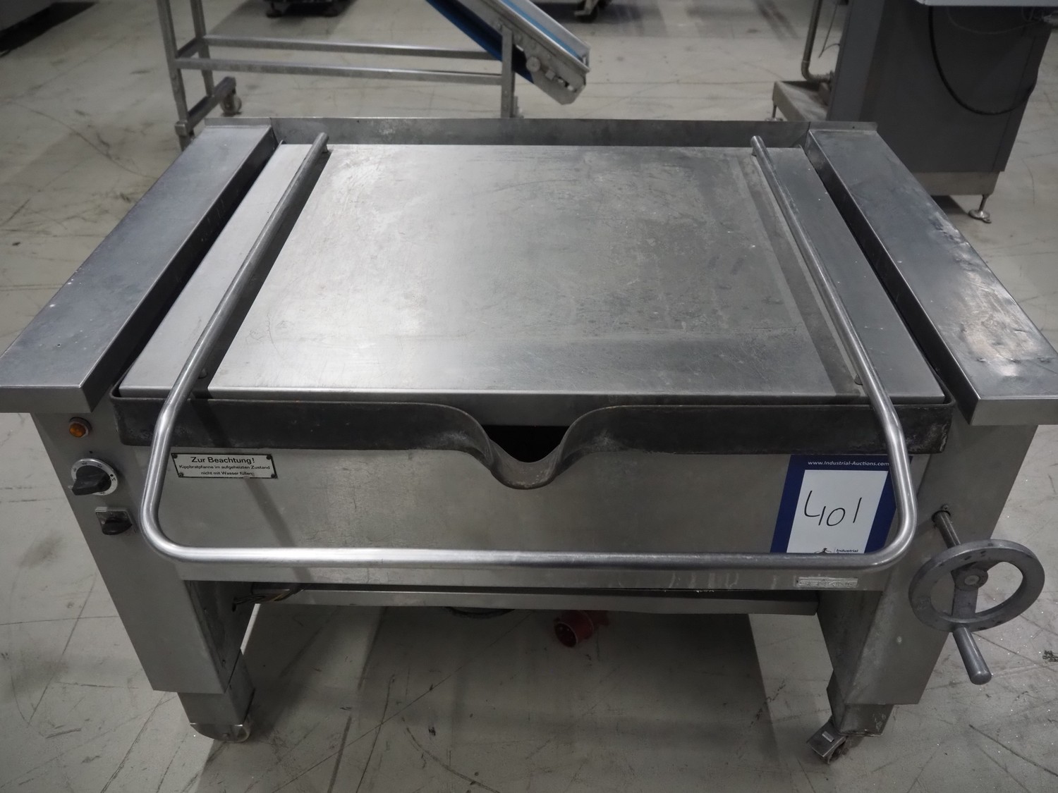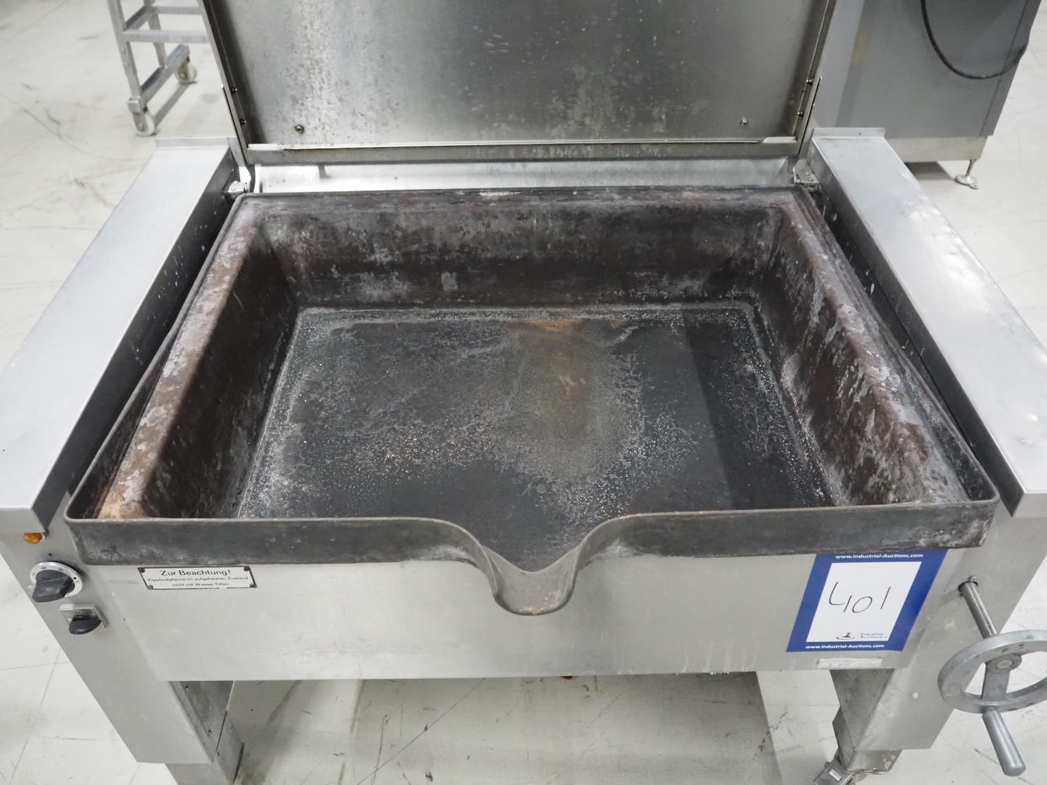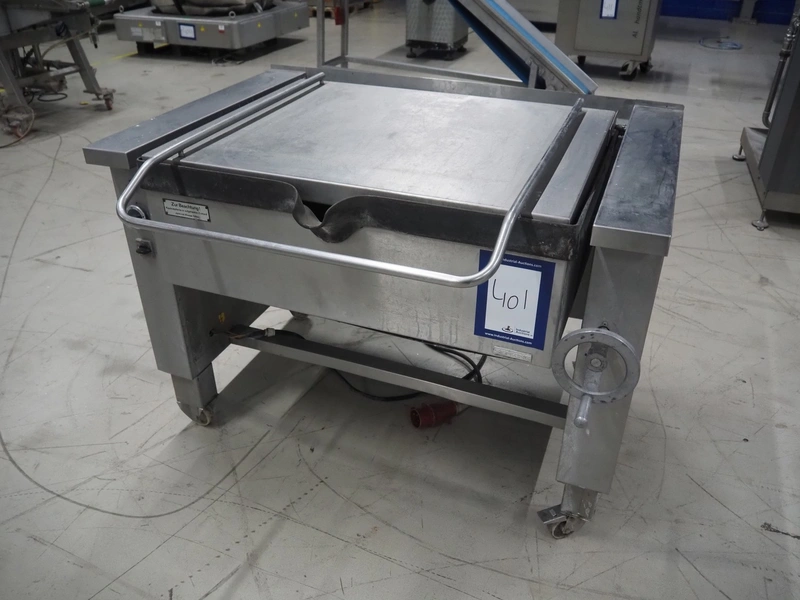 Senking mobile tiltable braising pan, inside dimensions: 870 mm x 760 mm x 180 mm, total dimensions: 1070 mm x 1300 mm x 970 mm.