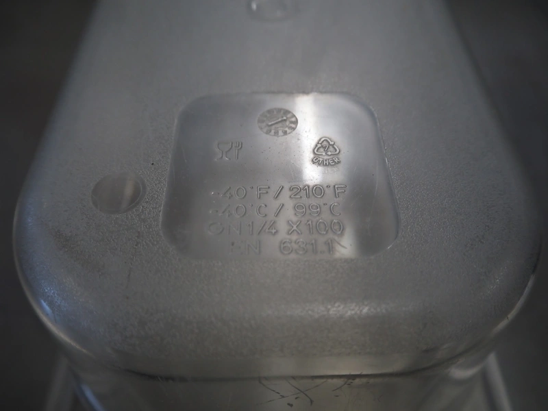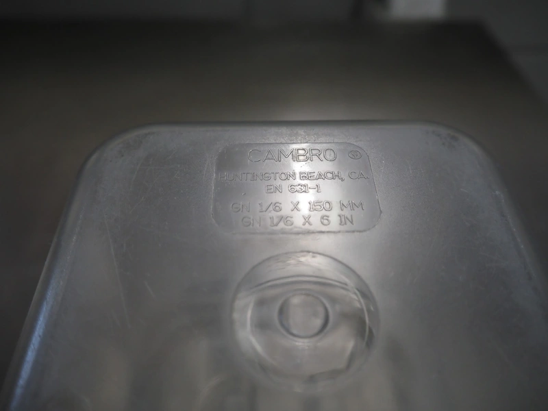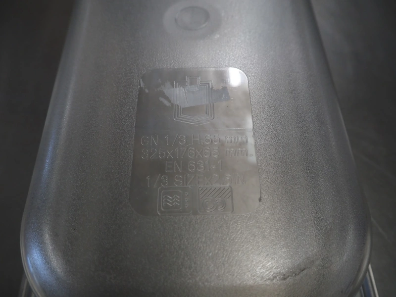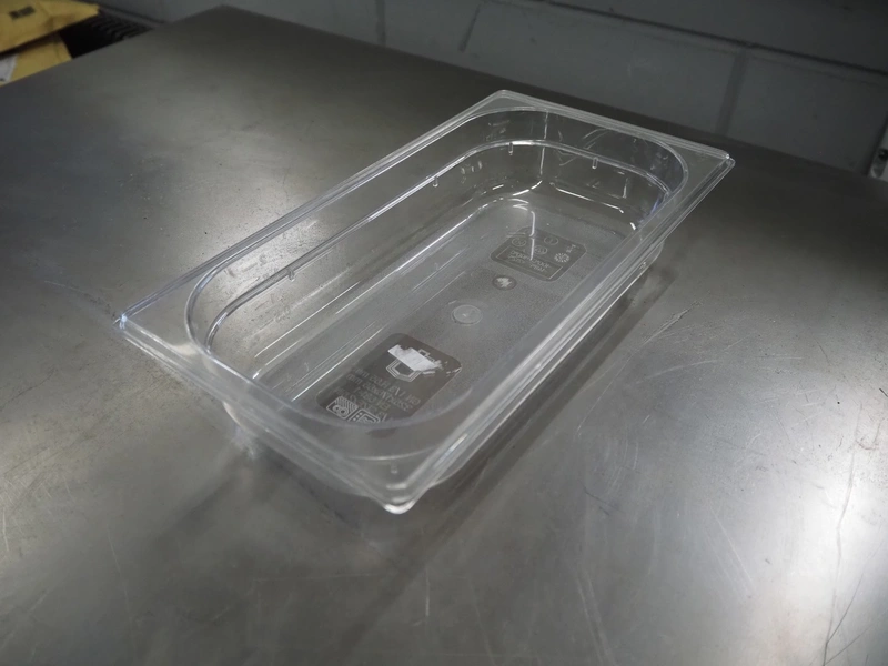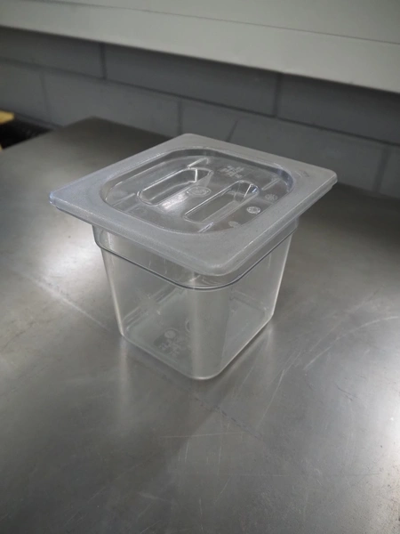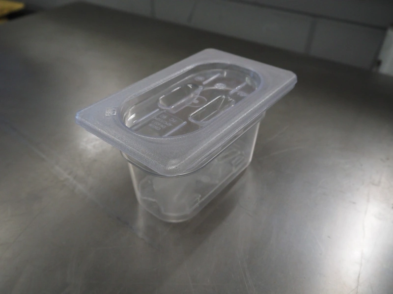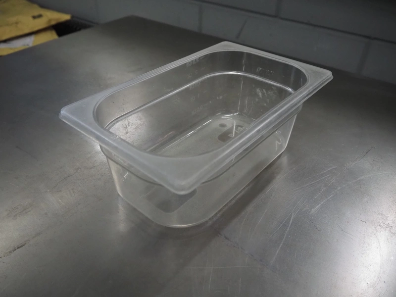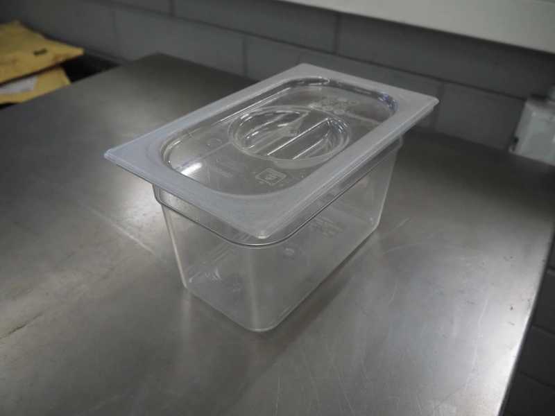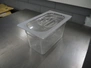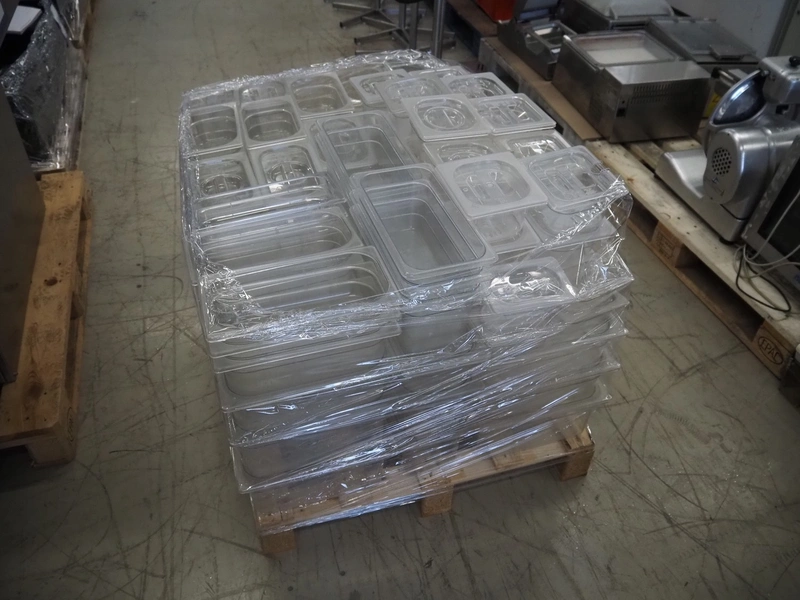 Pallet with large amount of plastic gastronorm bins, gastronorm bin sizes, (3x) 1/9 65 mm with lids, (1x) 1/9 100 mm with lids, (3x) 1/3 65 mm, (10x) 1/3 100 mm, (10x) 1/3 150 mm with lids, (5x) 1/3 150 mm, (2x) 1/2 100 mm, (7x) 1/2 150 mm with lids, (16x) 1/4 100 mm, (15x) 1/4 150 mm with lids, (26x) 1/6 100 mm with lids, (12x) 1/6 mm with lids, total dimensions: 1200 mm x 800 mm x 700 mm.