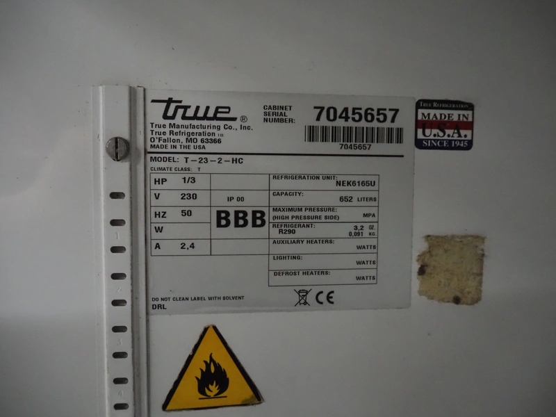 True Manufacturing Co., Inc. mobile refrigerator, model: T-23-2-HC, serial number: 7045657, 230 V, 50 Hz, 2.4 A, refrigerant: R290, dimensions: 760 mm x 680 mm x 2070 mm.
