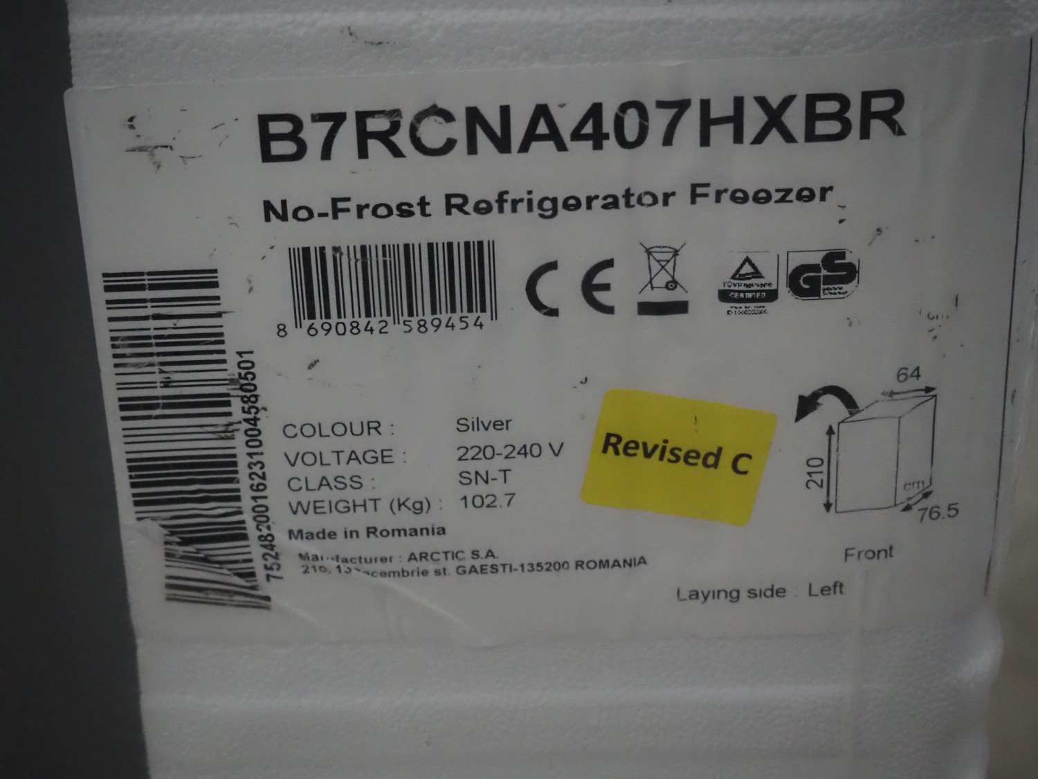 Beko No-Frost refrigerator/freezer, type: B7RCNA407HXBR, 220-240 V, dimensions: 600 mm x 750 mm x 2100 mm.