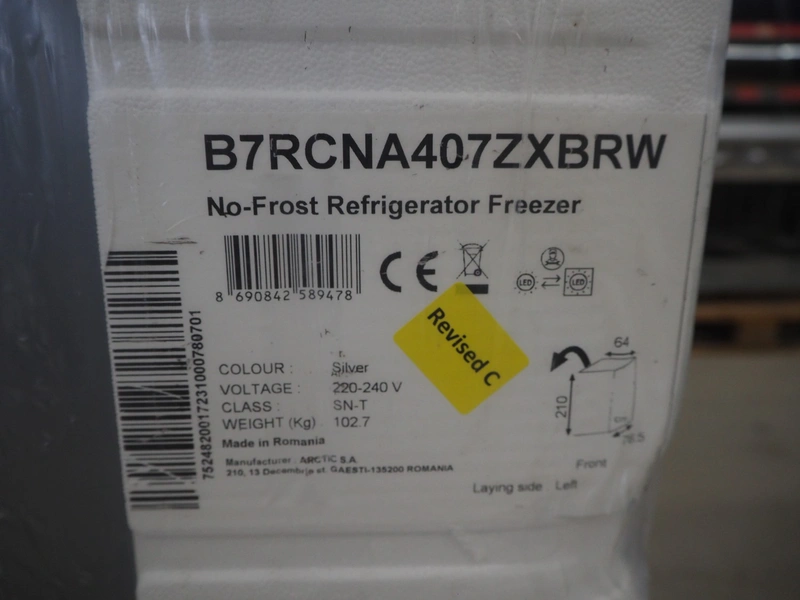 Beko No-Frost refrigerator/freezer, type: B7RCNA407ZXBRW, 220-240 V, dimensions: 600 mm x 750 mm x 2100 mm.