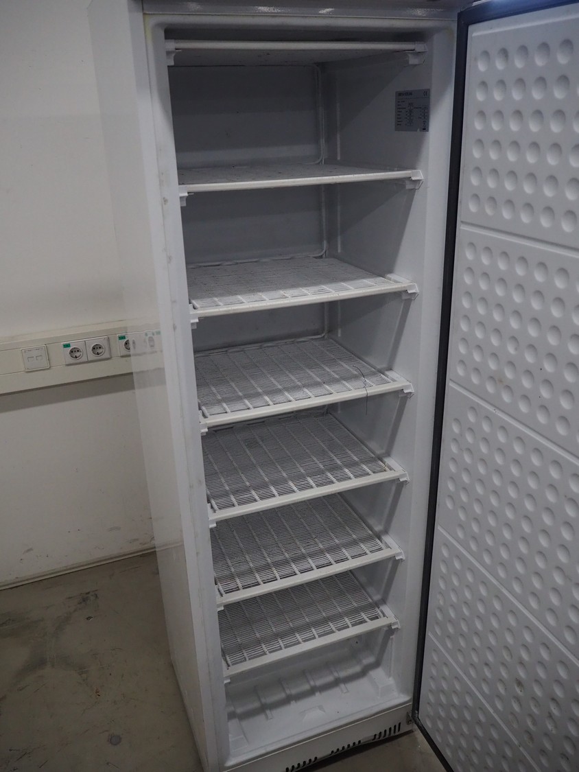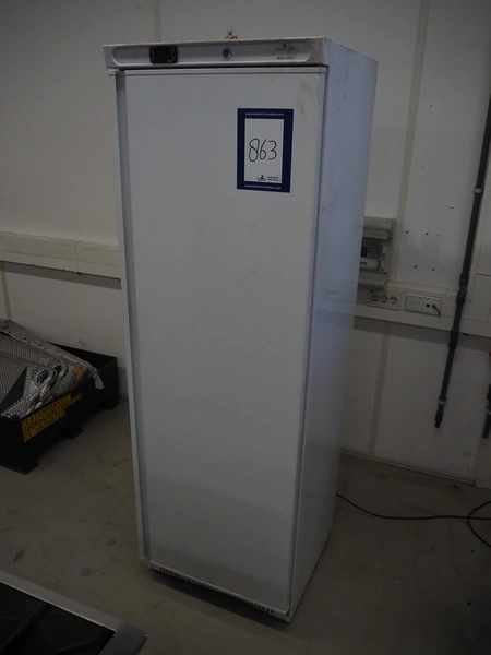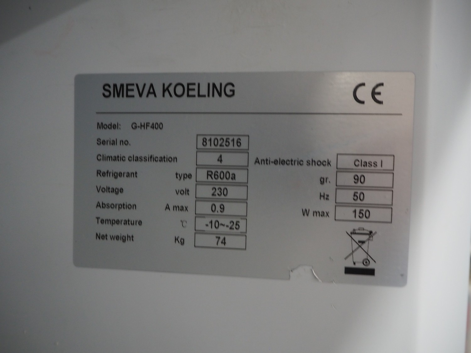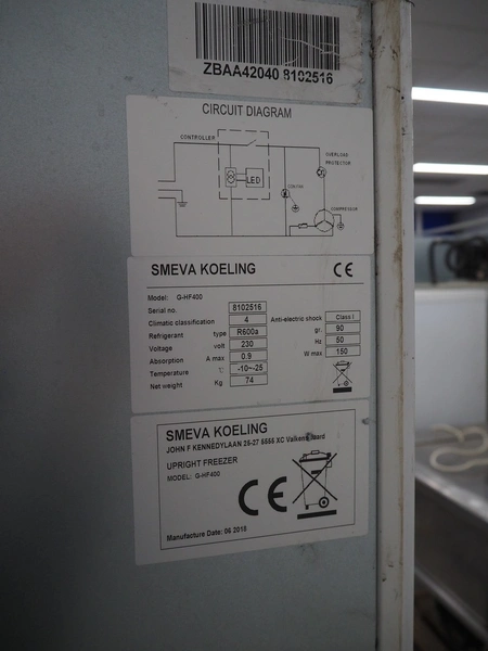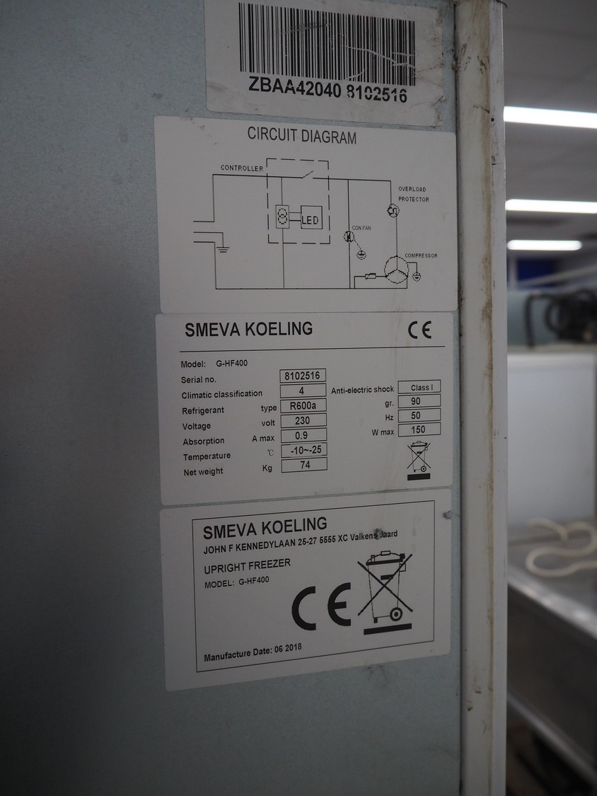 Smeva refrigerator, model: G-HF400, serial number: 8102516, 230 V, 50 Hz, 0.9 A, refrigerant: R600a / 90 g, weight: 74 kg, dimensions: 600 mm x 600 mm x 1850 mm.