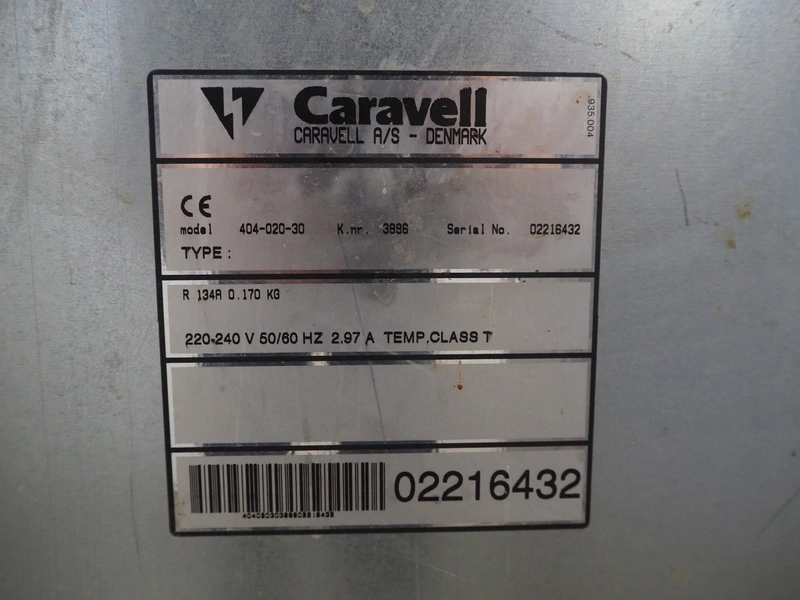 Caravell refrigerator, model: 404-020-30, serial number: 02216432, 220-240 V, 50/60 Hz, 2.97 A, refrigerant: R134a, 0.170 kg, dimensions: 700 mm x 620 mm x 1860 mm.
