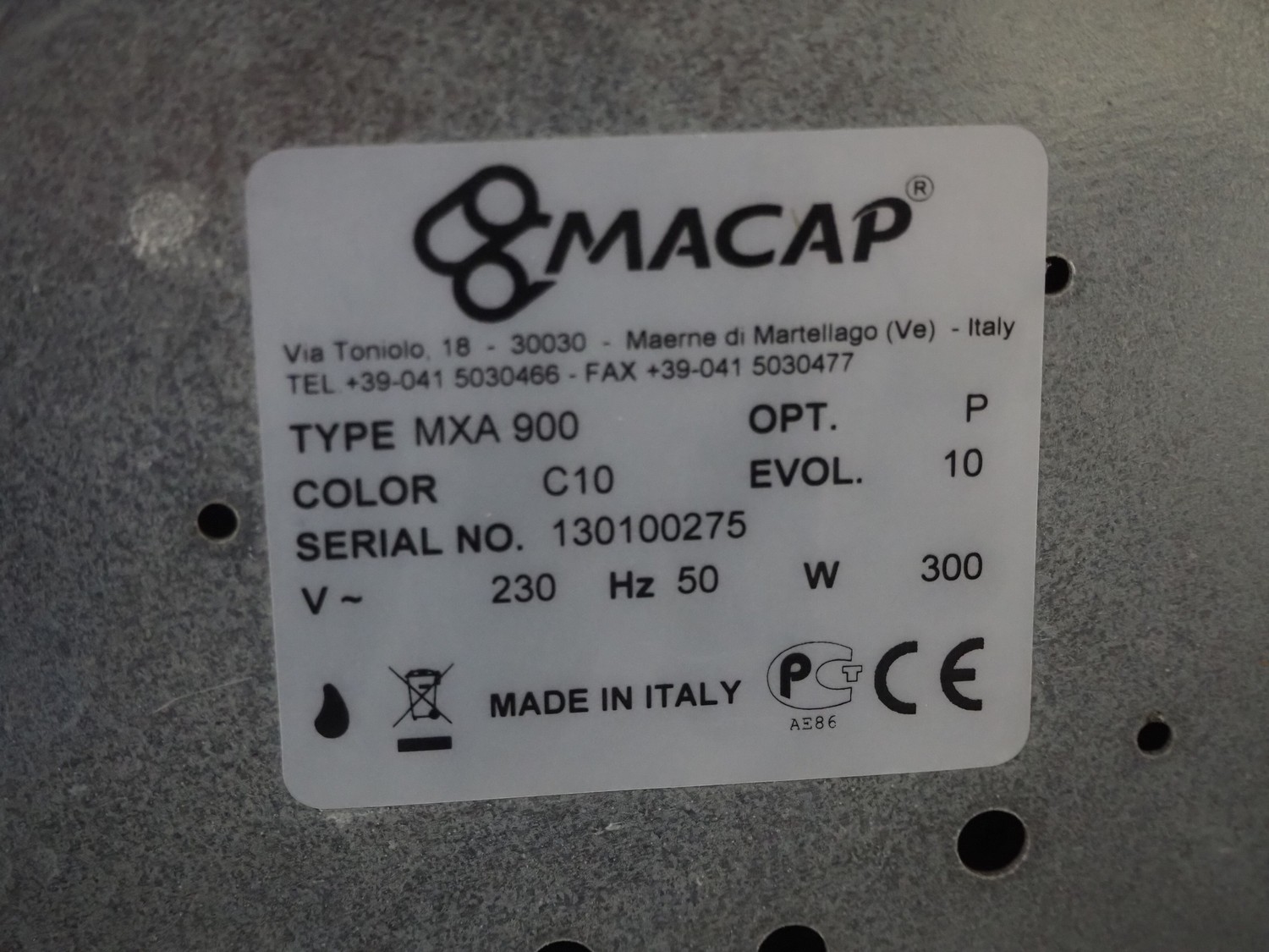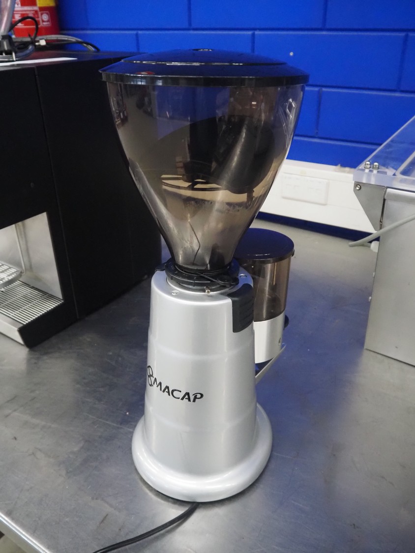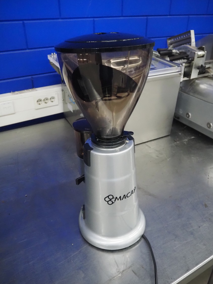 Macap coffee bean grinder, type: MXA 900, serial number: 130100275, 230 V, 1 Ph, 50 Hz, 300 W, dimensions: 360 mm x 230 mm x 600 mm.