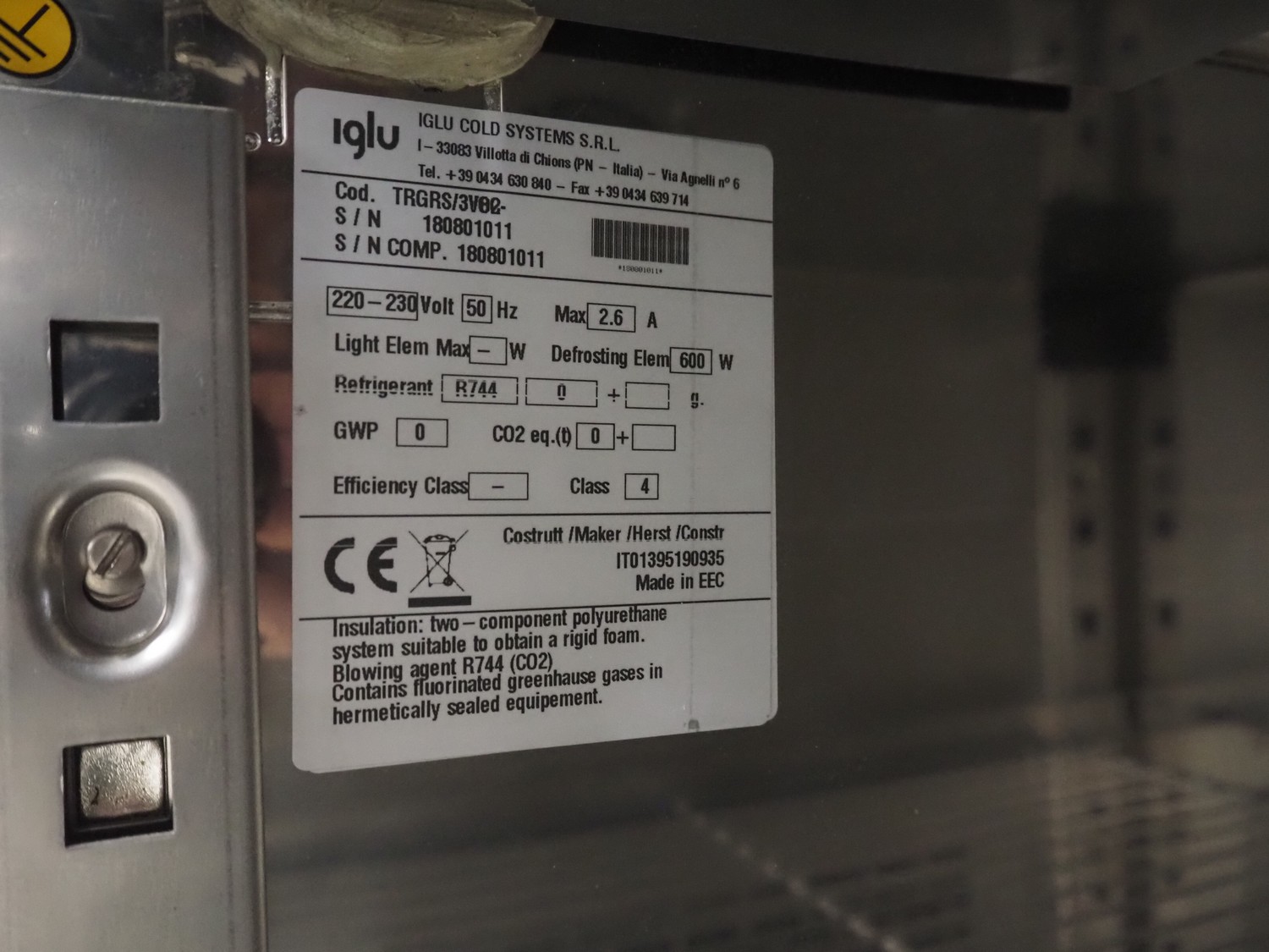 Iglu Cold Systems S.R.L. refrigerated counter, serial number: 180801011, 220/230 V, 50 Hz, 2.6 A, 600 W, refrigerant: R744, dimensions: 1500 mm x 700 mm x 900 mm.