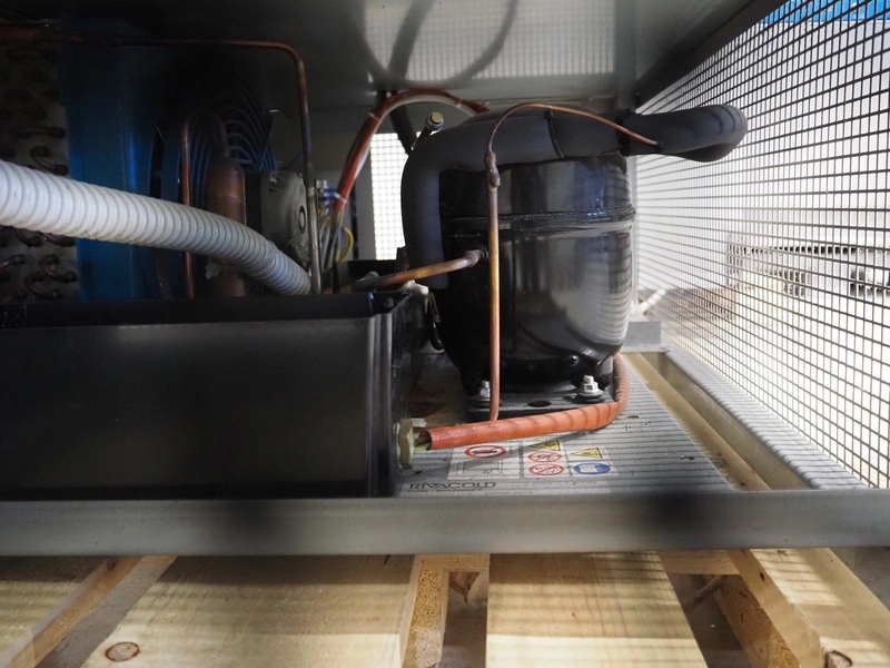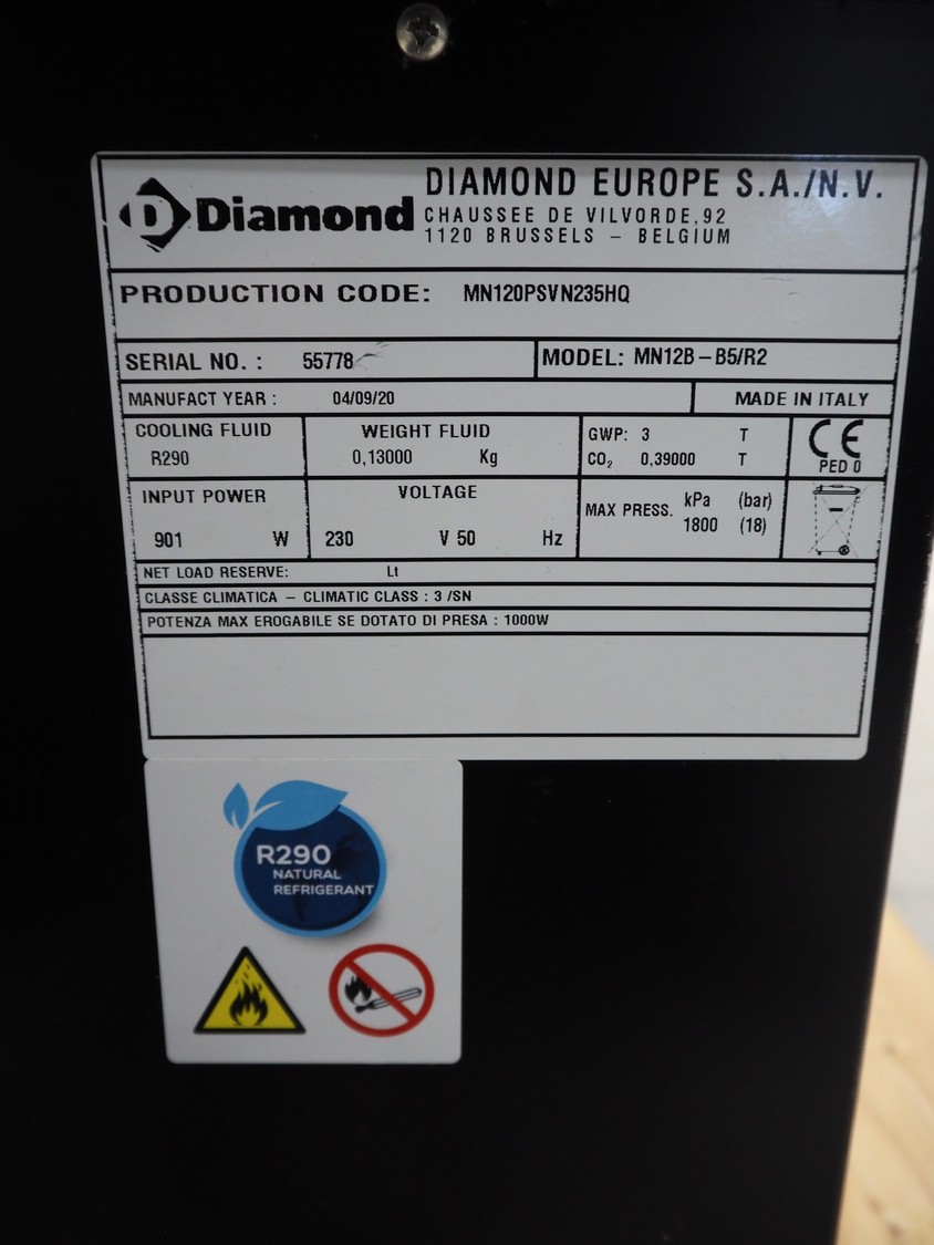 Diamond refrigerated display with Rivacold cooling compressor, model: MN12B-B5/R2, serial number: 55778, year of construction: 04/09/20, 230 V, 50 Hz, 901 W, refrigerant: R290, 0.13 kg, dimensions: 1200 mm x 760 mm x 1350 mm.