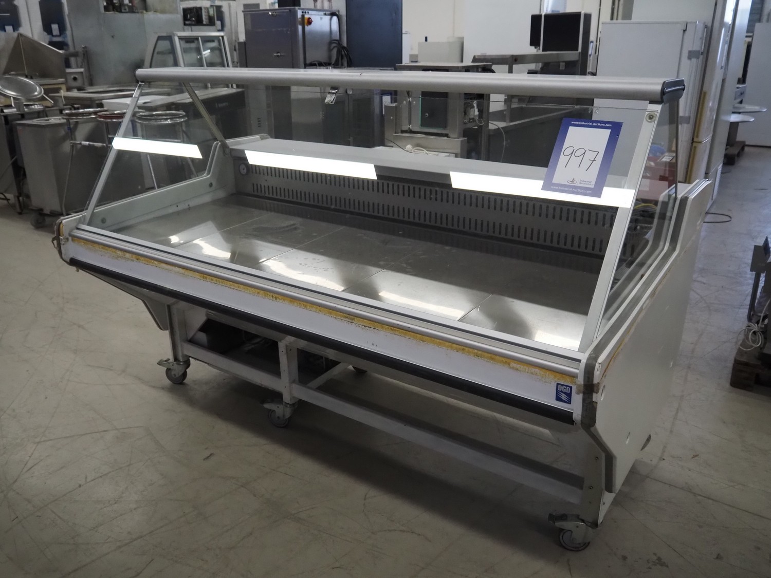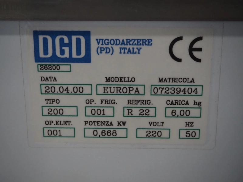 DGD refrigerated showcase, model: EUROPA, serial number: 07239404, year of construction: 20.04.00, 220 V, 50 Hz, dimensions: 2050 mm x 1150 mm x 1400 mm.
