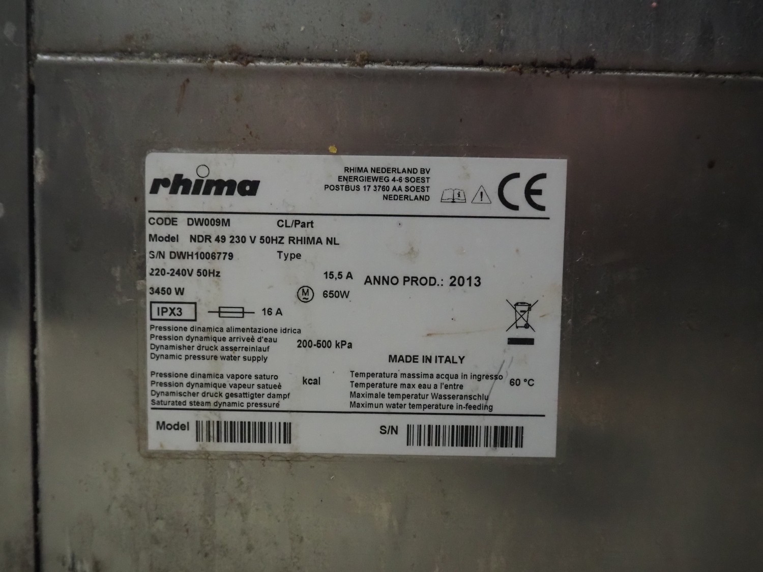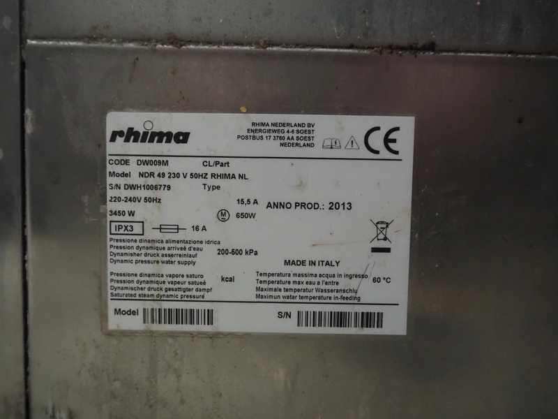Rhima dishwasher, model: NDR 49, serial number: DWH1006779, year of construction: 2013, 220/240 V, 50 Hz, 15.5 A, 650 W, dimensions: 600 mm x 600 mm x 850 mm.