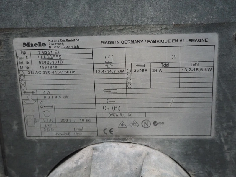 Miele dryer, type: T 6251 EL, fabrication number: 46611995, 380/415 V, 3 Ph, 50 Hz, 24 A, 13.2/15.5 kW, volume: 250 liter, dimensions: 900 mm x 820 mm x 1440 mm.