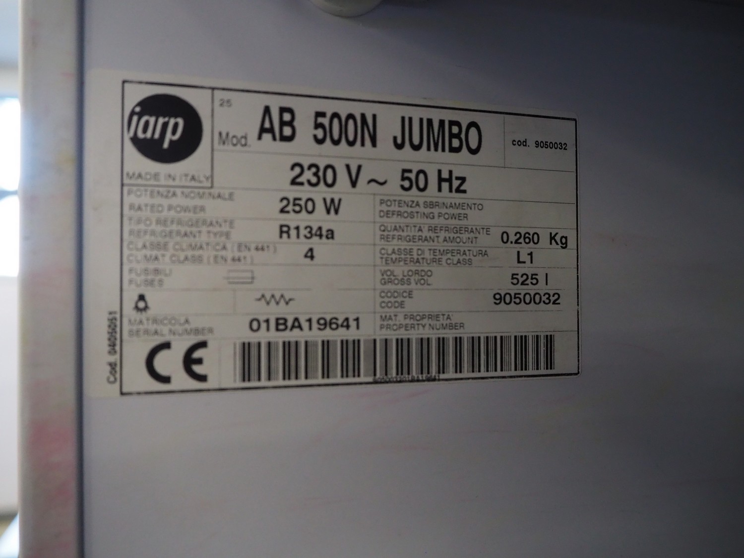 Iarp freezer, model: AB 500N JUMBO, serial number: 01BA19641, 230 V, 50 Hz, 1.9 A, 250 W, volume: 525 liter, refrigerant: R134a / 0.260 kg, dimensions: 780 mm x 730 mm x 1710 mm.