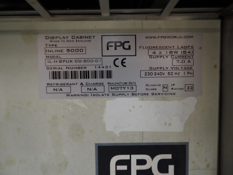 FPG World heated showcase, type: INLINE 5000, model; IL-H-BPUK-CU-1200-01, serial number: 13240, 230-240 V, 1 Ph, 50 Hz, 14.4 A, dimensions: 1200 mm x 800 mm x 1430 mm.