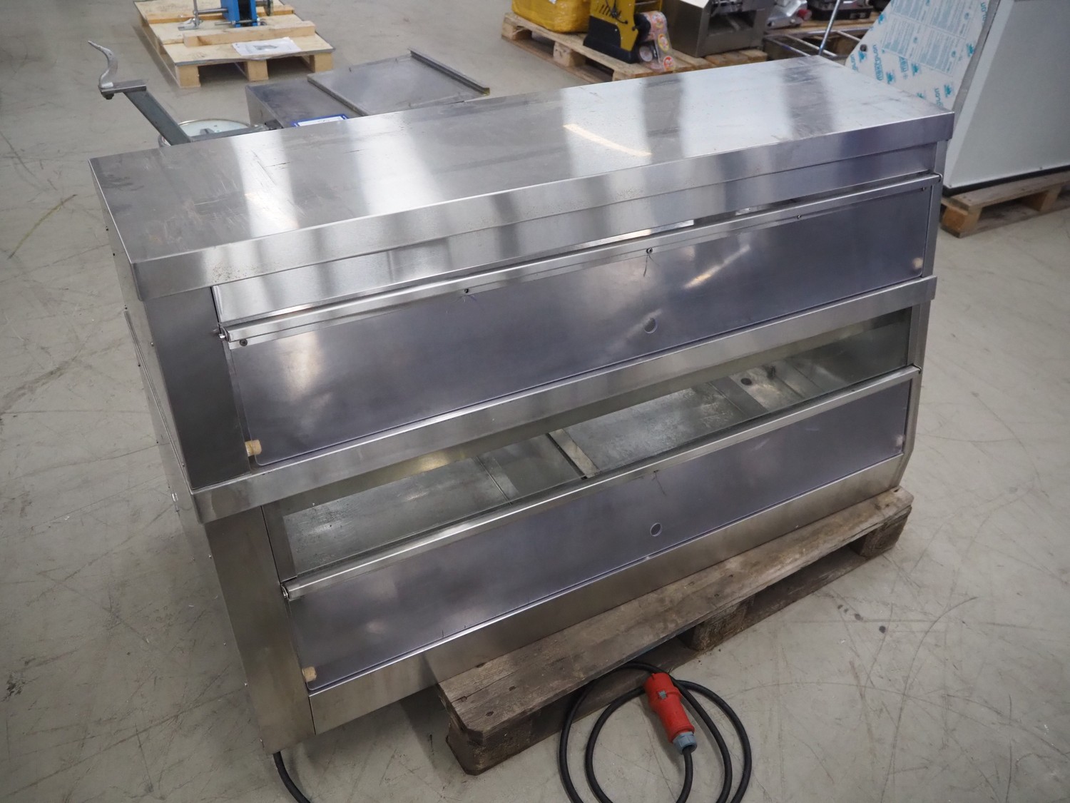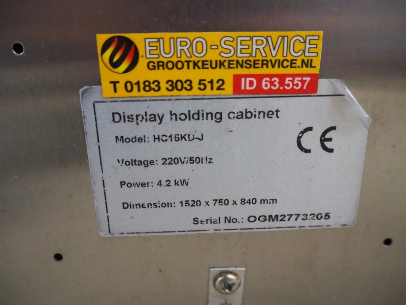 Heated display cabinet, model: HC15KD-J, serial number: OGM2773205, 220 V, 50 Hz, 4.2 kW, dimensions inside: 1400 mm x 200 mm, total dimensions: 1520 mm x 800 mm x 830 mm.