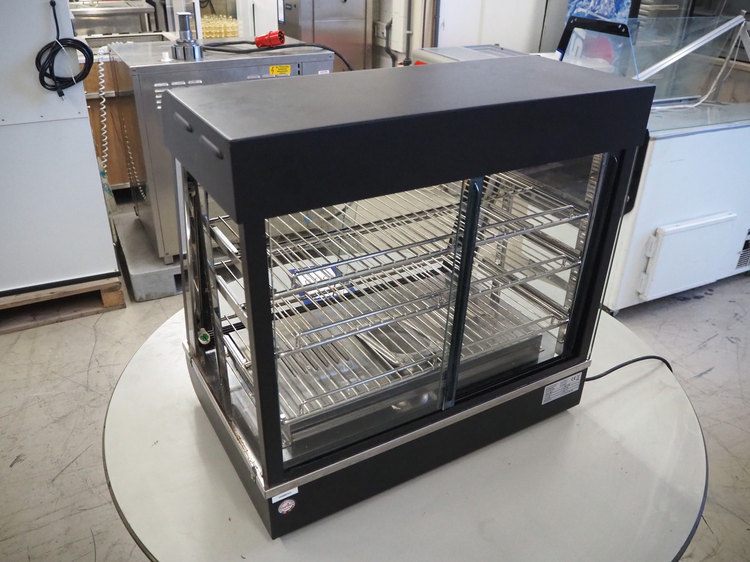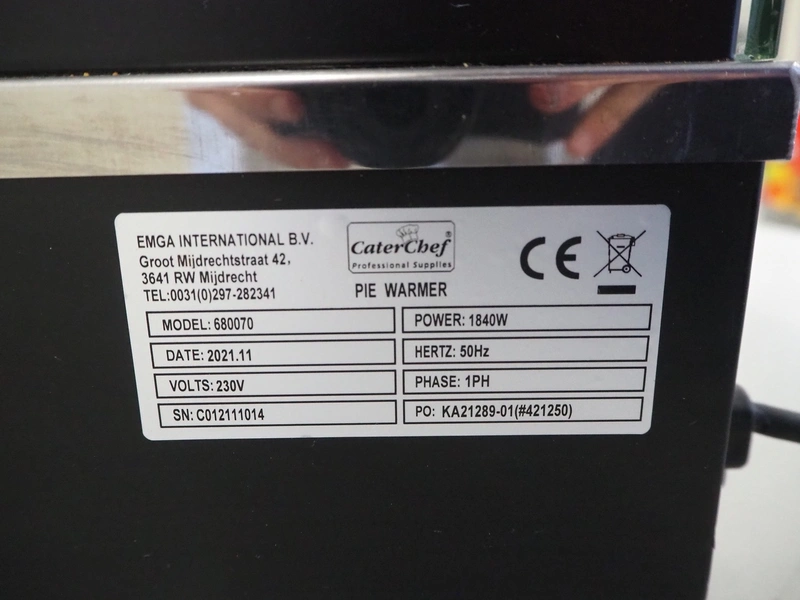 Emga International pie warmer, model: 680070, serial number: C012111014, year of construction: 11.2021, 230 V, 1 Ph, 50 Hz, 1840 W, dimensions: 660 mm x 400 mm x 640 mm.
