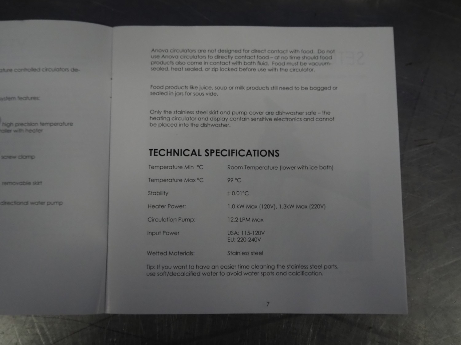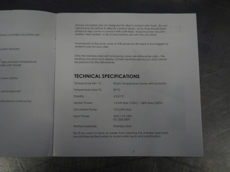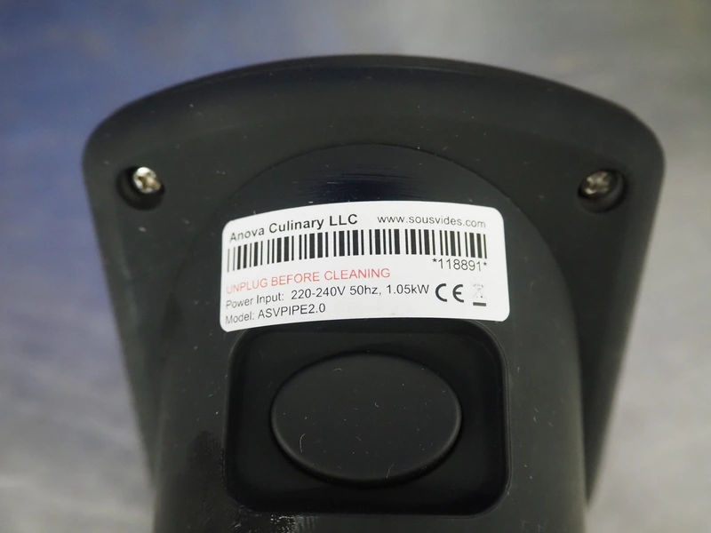 Anova sous vide stick, model: ASVPIPE1.2, 220/240 V, 60 Hz, 1.3 kW, dimensions: 450 mm x 250 mm x 110 mm.