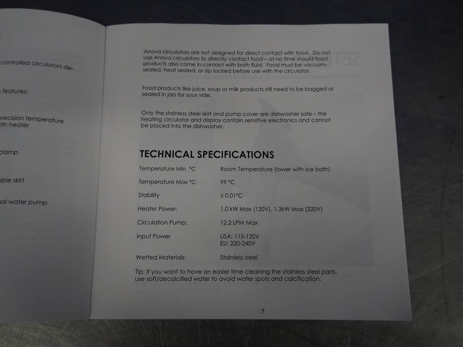 Anova sous vide stick, model: ASVPIPE1.2, 220/240 V, 60 Hz, 1.3 kW, dimensions: 450 mm x 250 mm x 110 mm.