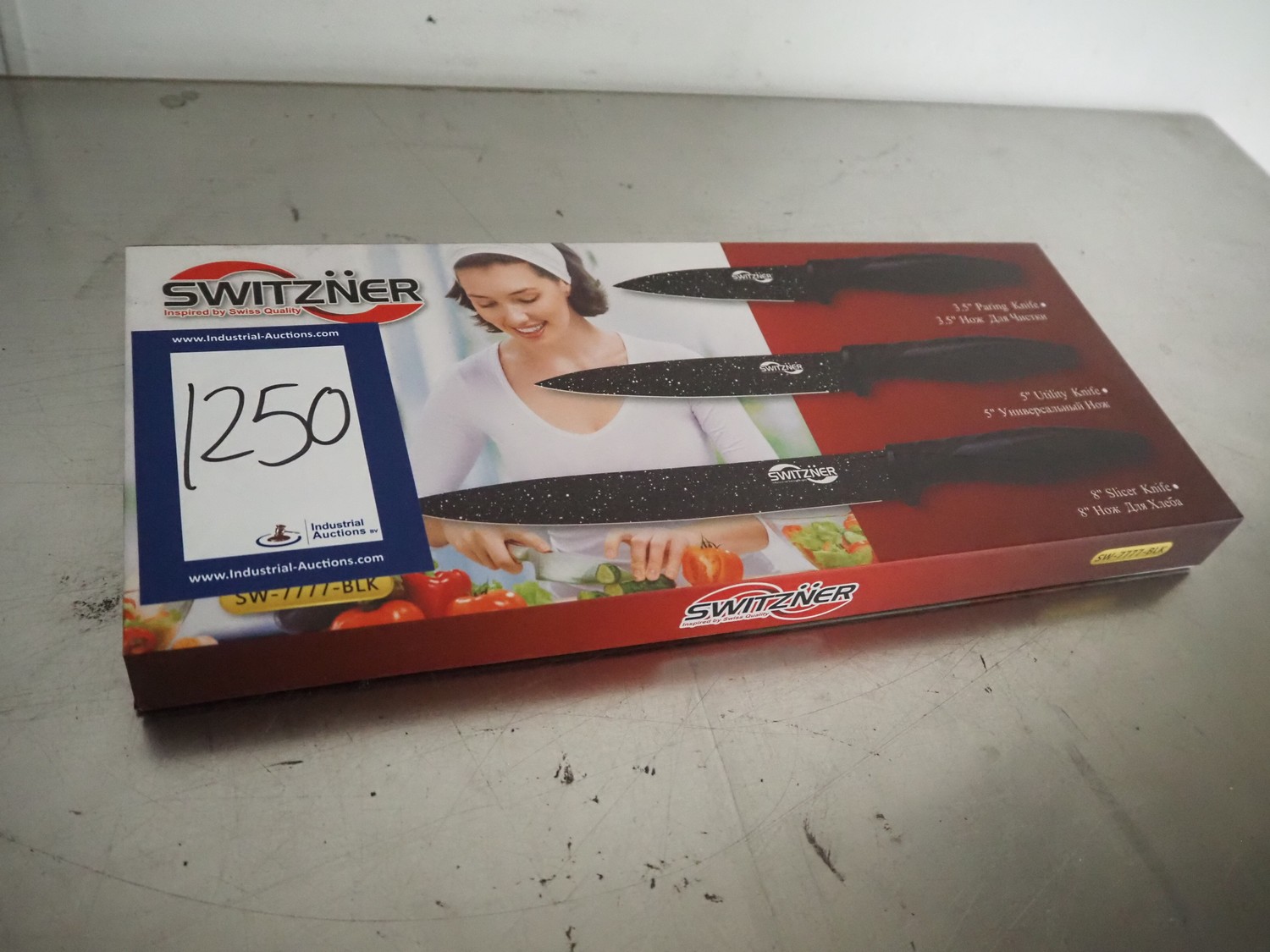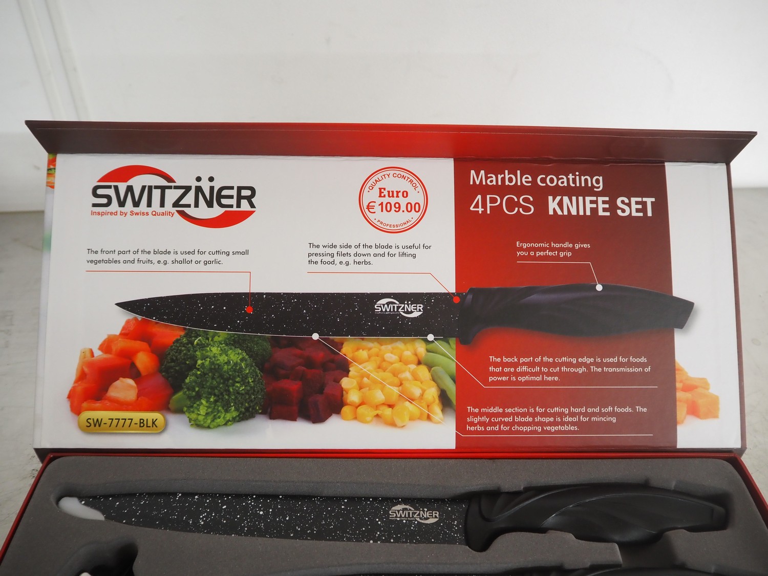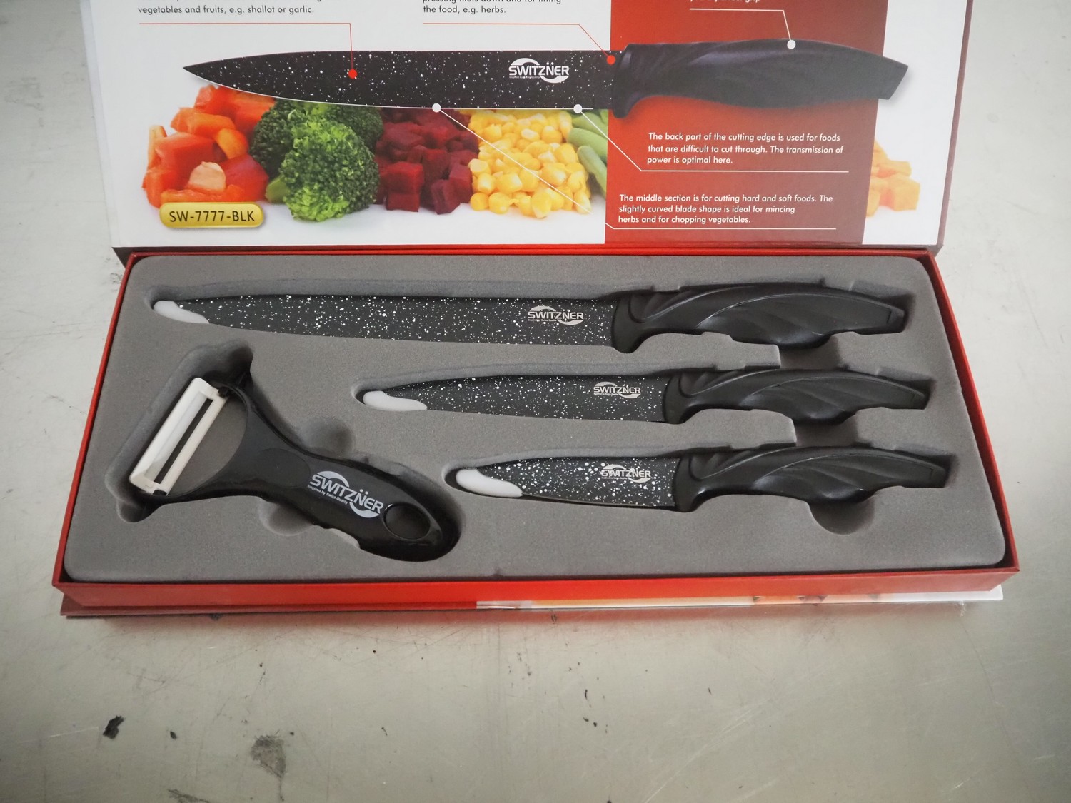 Switzner kitchen knife set, dimensions: 370 mm x 140 mm x 30 mm.