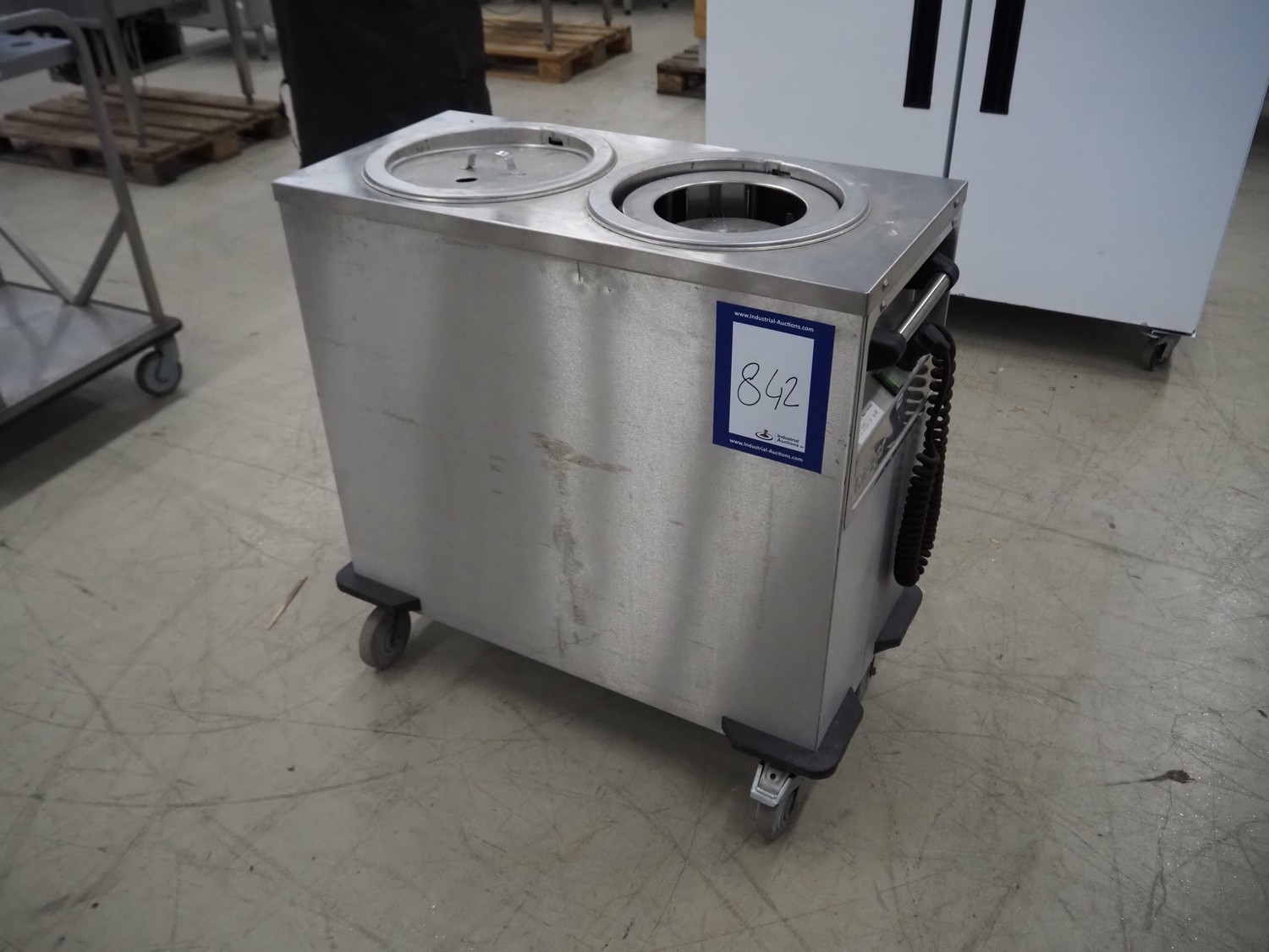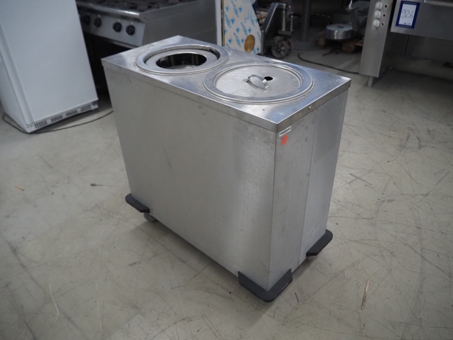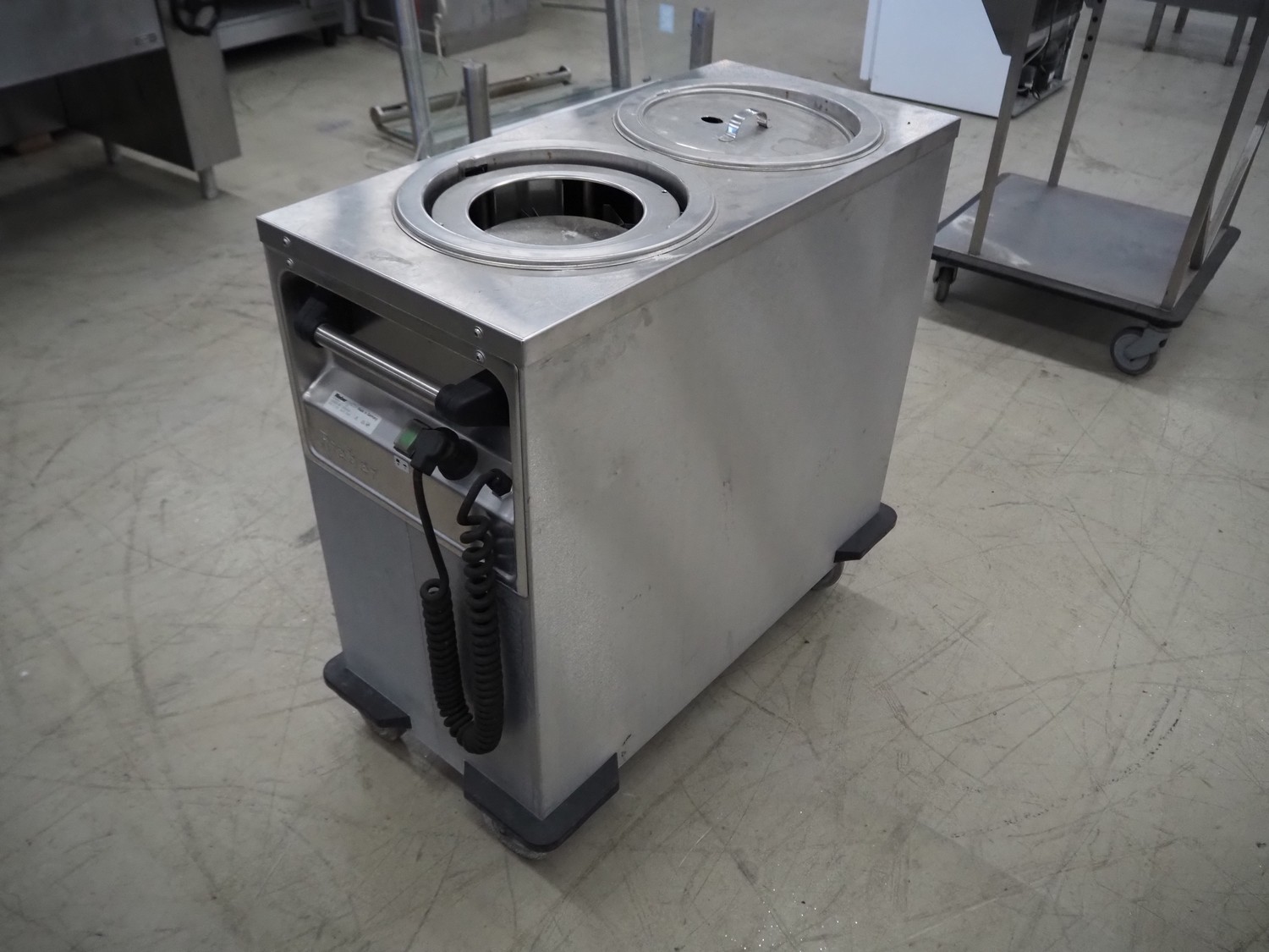 Rieberwerke mobile plate dispenser, type: RRH-2, number: 5603056, 220 V, 1340 Watt, plate diameter: 300 mm, total dimensions: 940 mm x 480 mm x 910 mm.