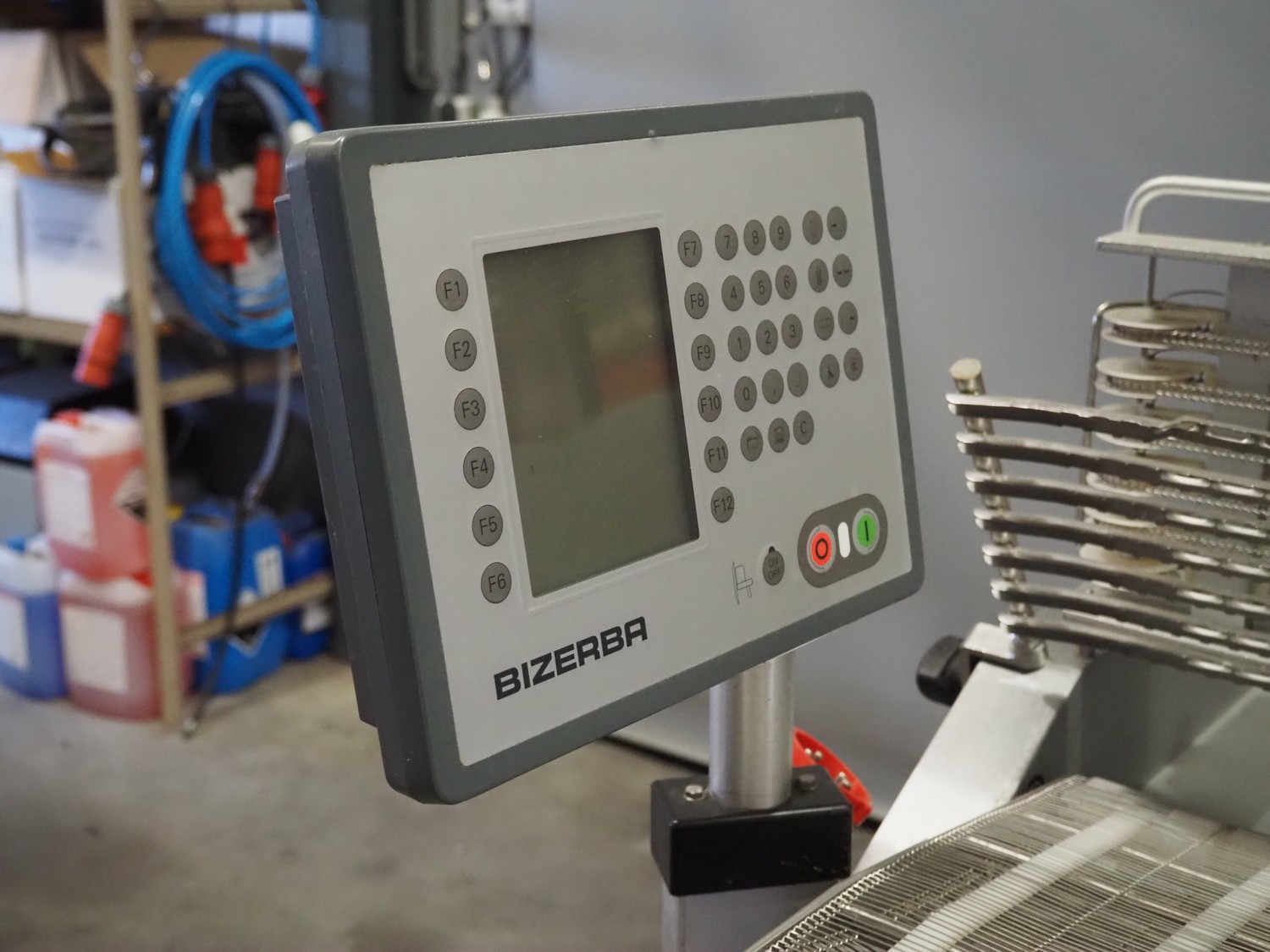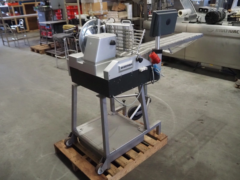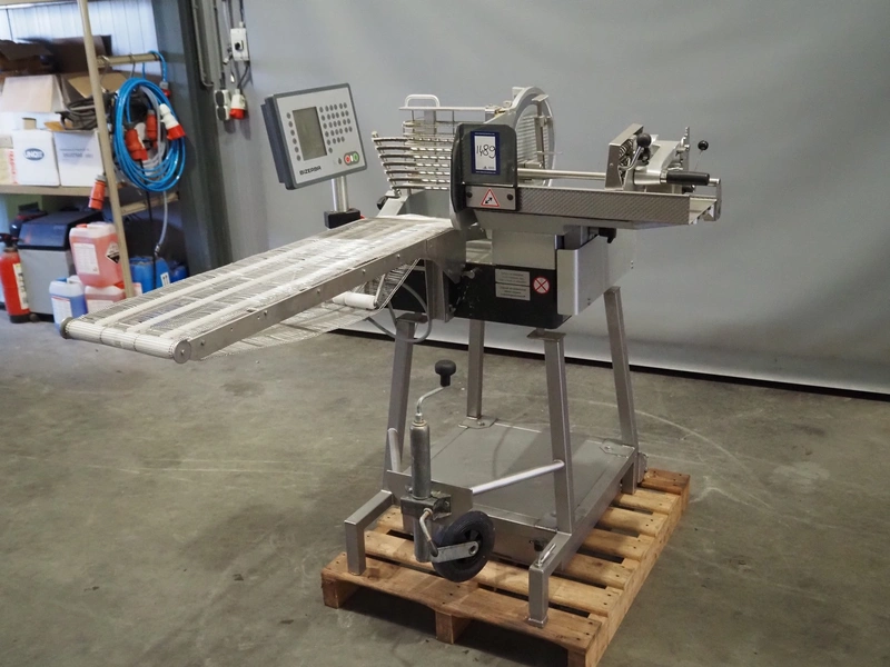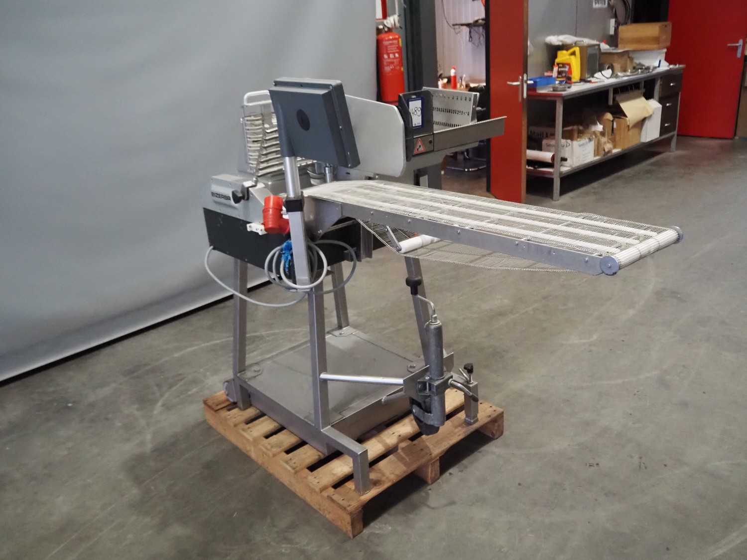 Bizerba mobile automatic slicer, model: A 404 FB, number: 10832880, year of construction: 2012, 230/400 V, 3 Ph, 50 Hz, 2.5/1.4 A, s/s mesh belt, belt width: 250 mm, total dimensions: 980 mm x 930 mm x 1350 mm.