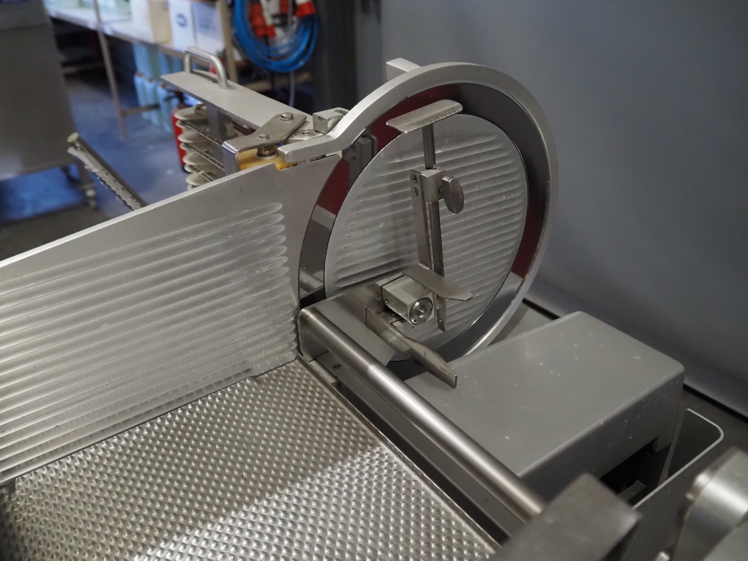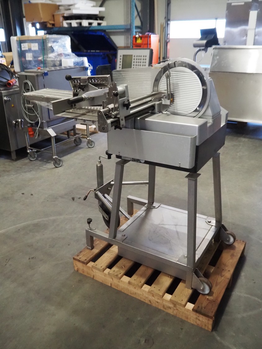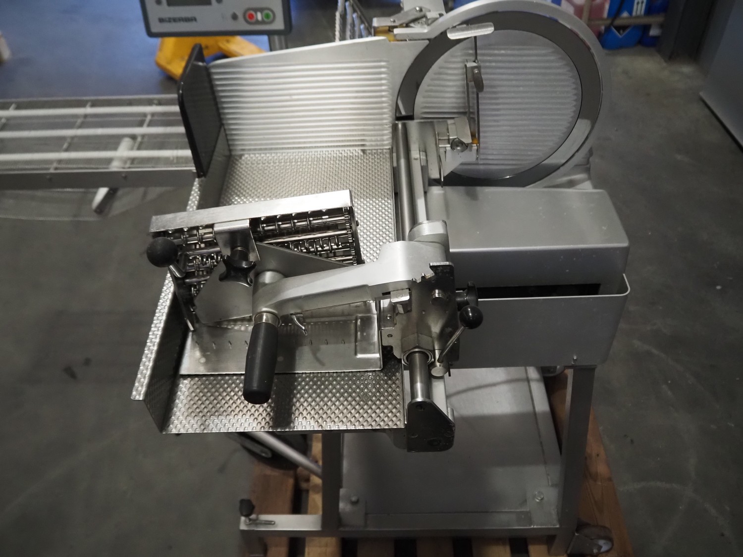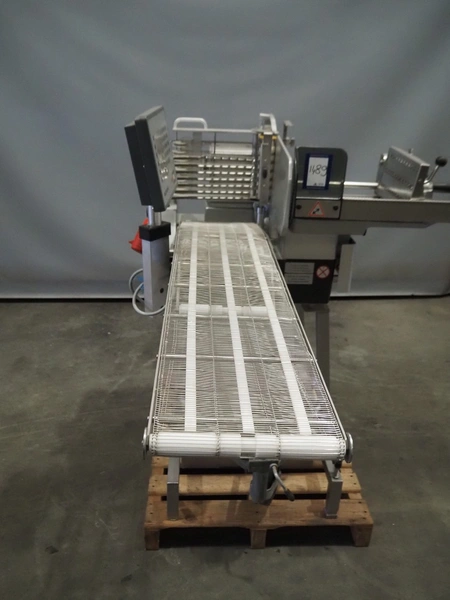 Bizerba mobile automatic slicer, model: A 404 FB, number: 10832880, year of construction: 2012, 230/400 V, 3 Ph, 50 Hz, 2.5/1.4 A, s/s mesh belt, belt width: 250 mm, total dimensions: 980 mm x 930 mm x 1350 mm.