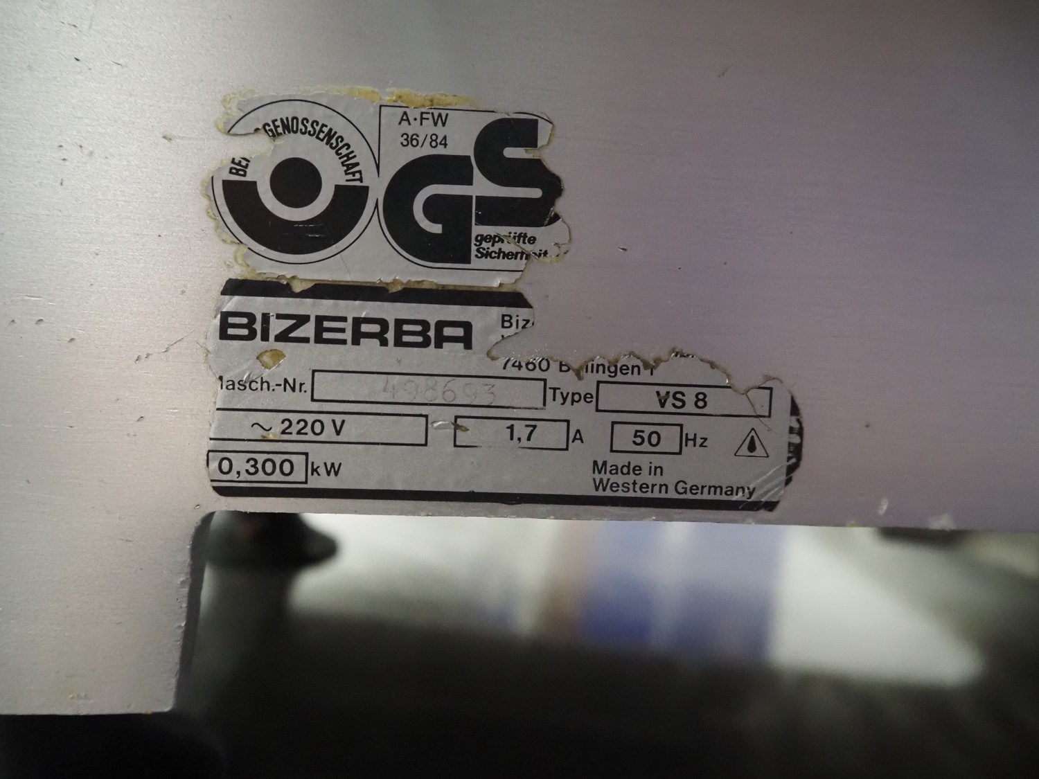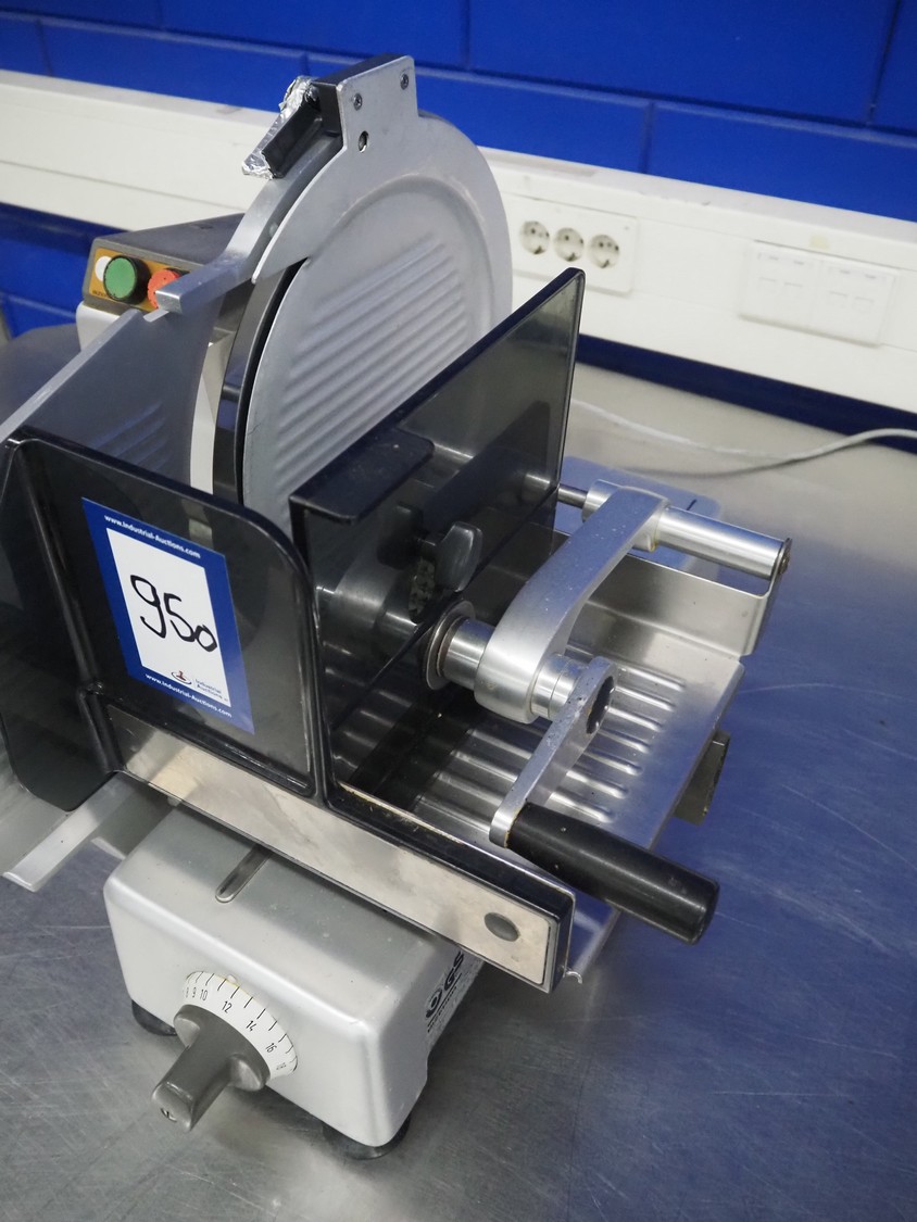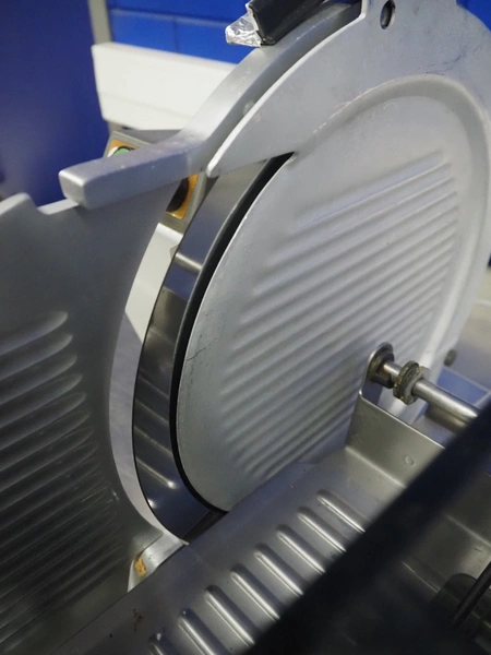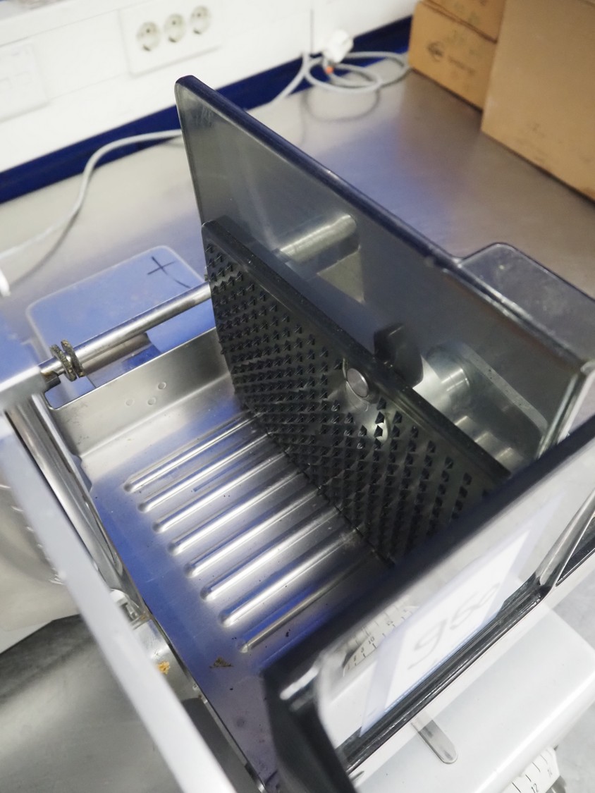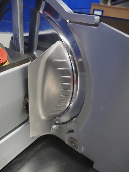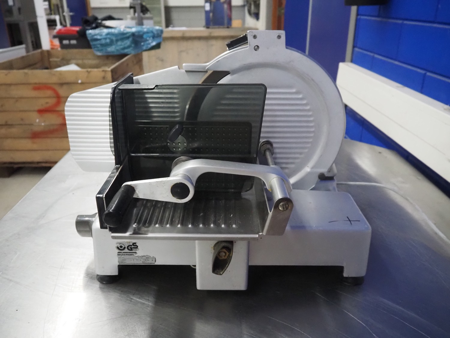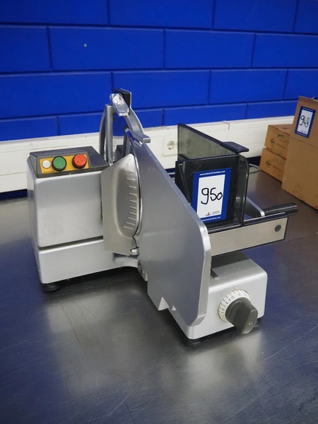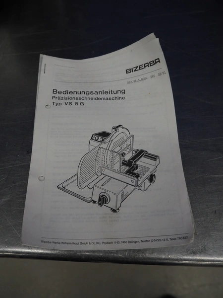 Bizerba slicer, type: VS 8, number: 498693, 220 V, 1 Ph, 50 Hz, 1.7 A, 0.300 kW, dimensions: 600 mm x 550 mm x 450 mm. Including knife sharpener.