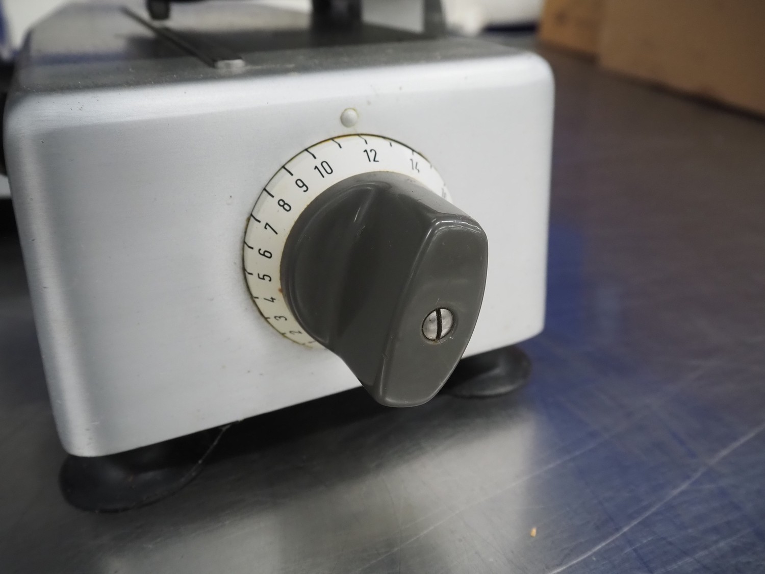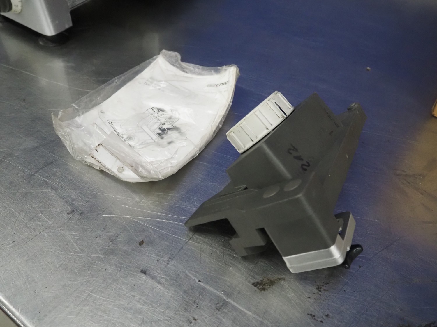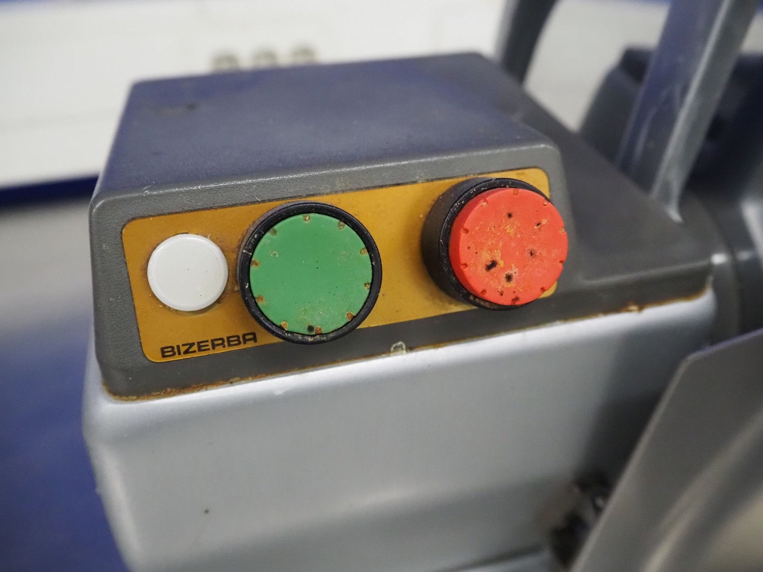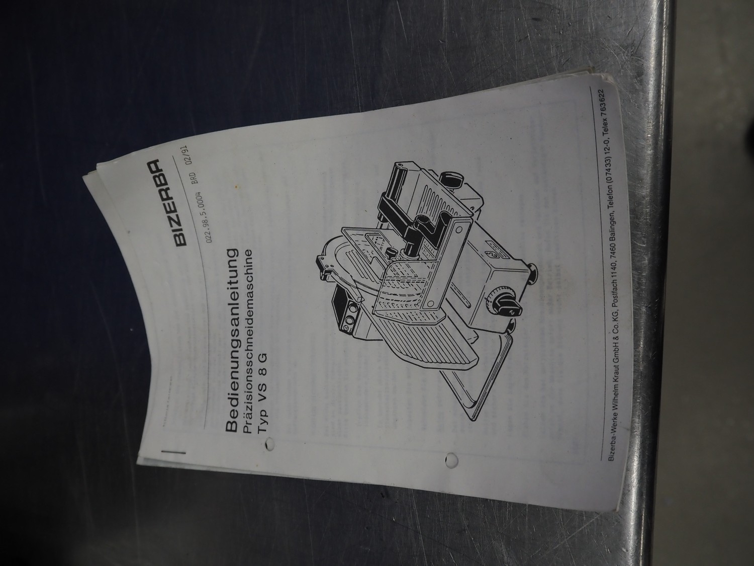 Bizerba slicer, type: VS 8, number: 498693, 220 V, 1 Ph, 50 Hz, 1.7 A, 0.300 kW, dimensions: 600 mm x 550 mm x 450 mm. Including knife sharpener.