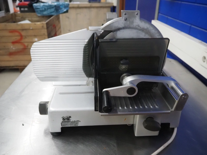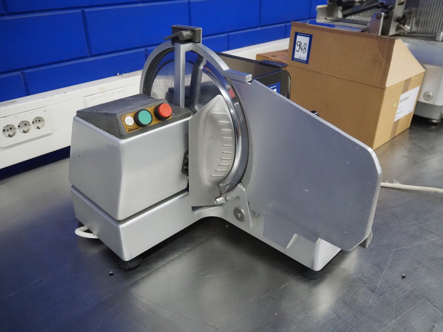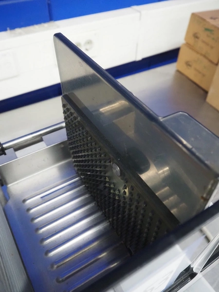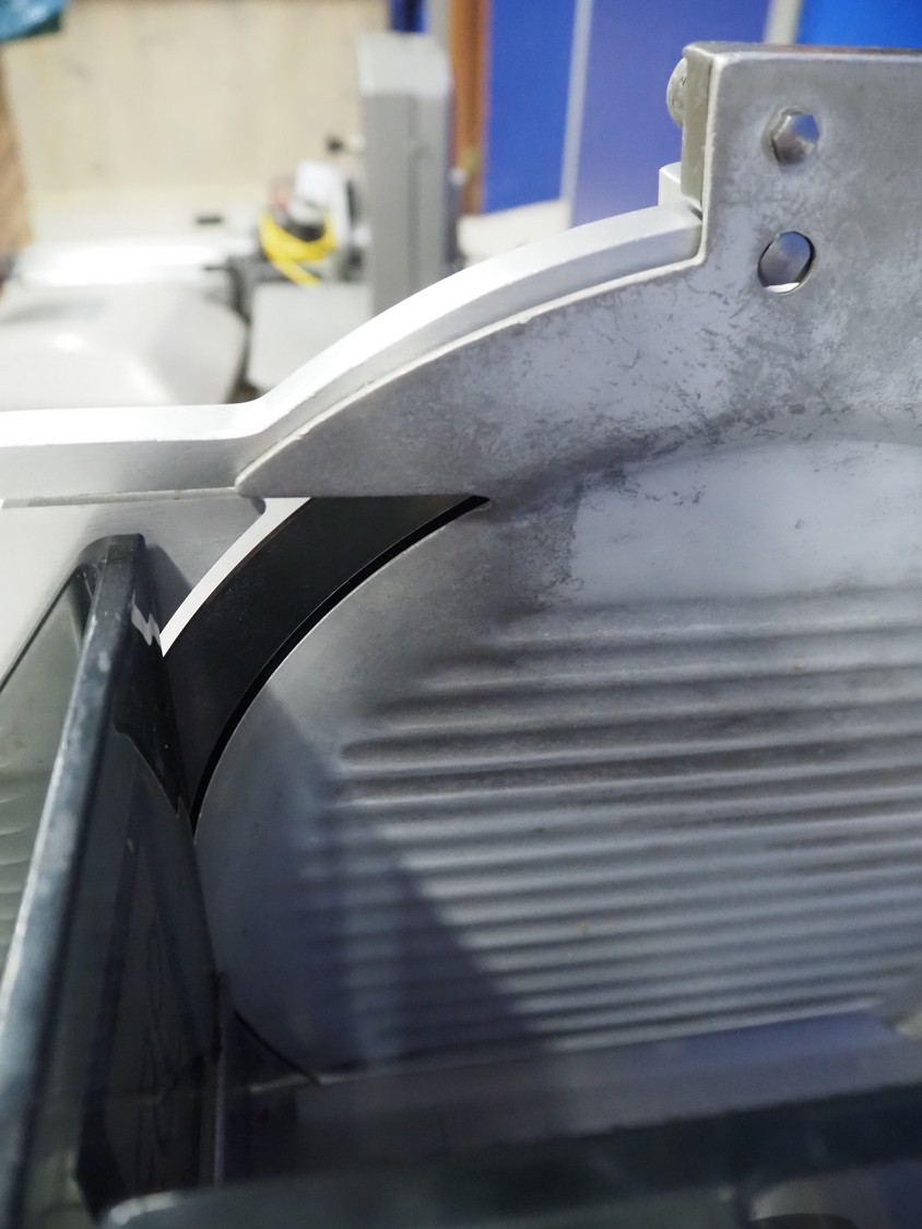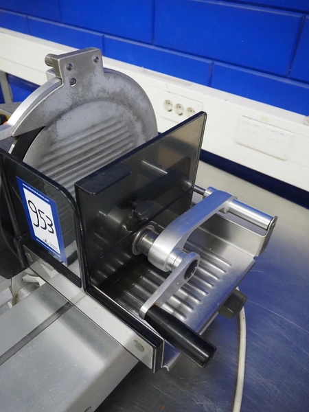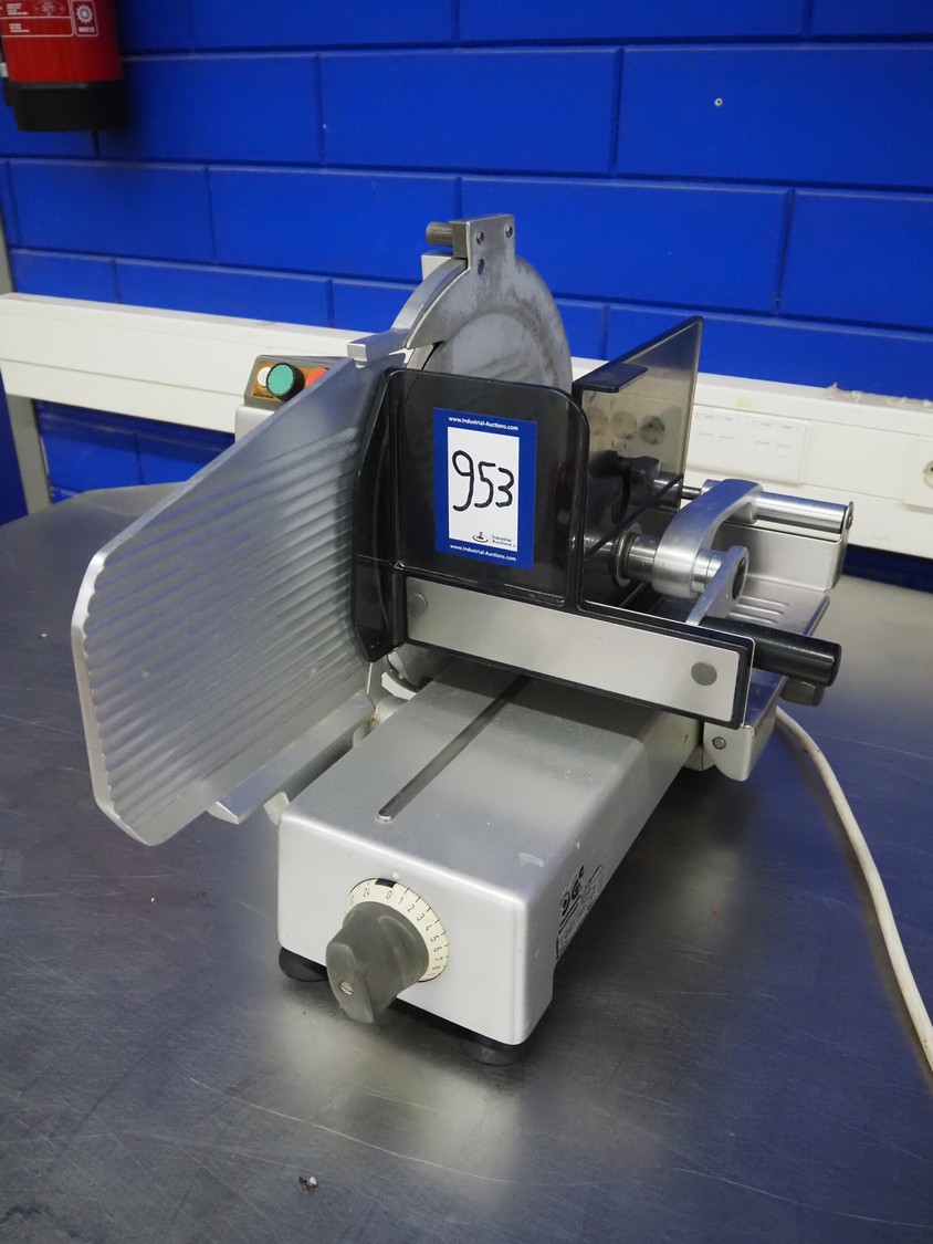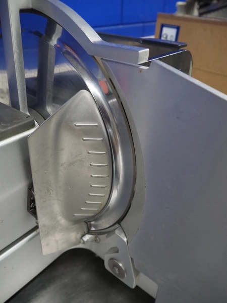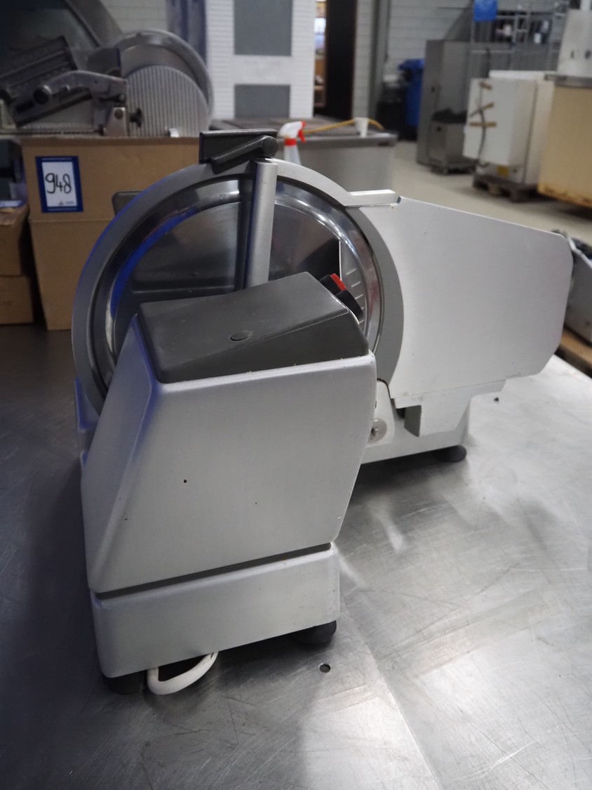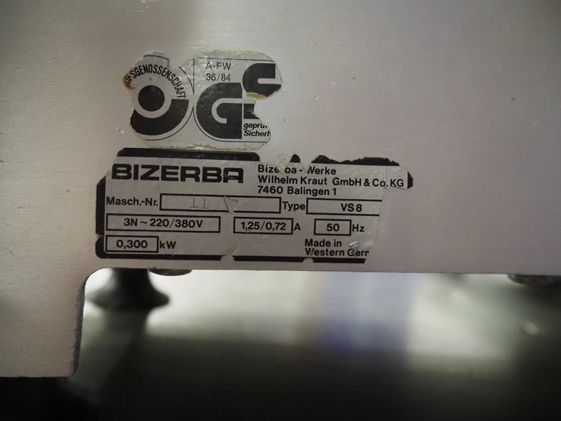 Bizerba slicer, type: VS 8, 220/380 V, 3 Ph, 50 Hz, 1.25/0.72 A, 0.300 kW, dimensions: 620 mm x 550 mm x 450 mm. Including knife sharpener.