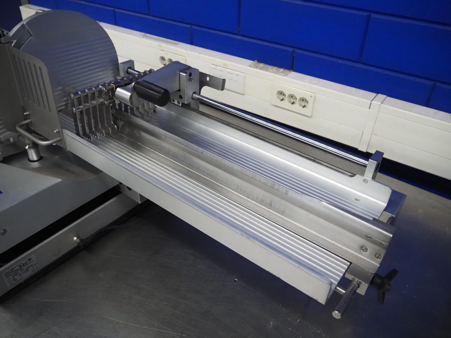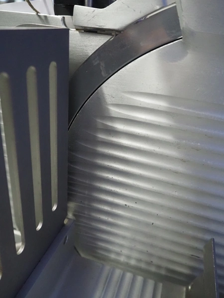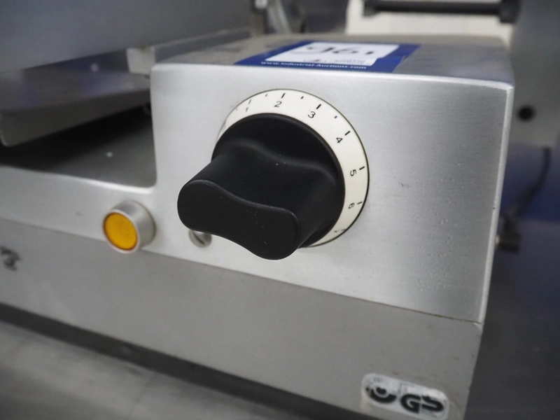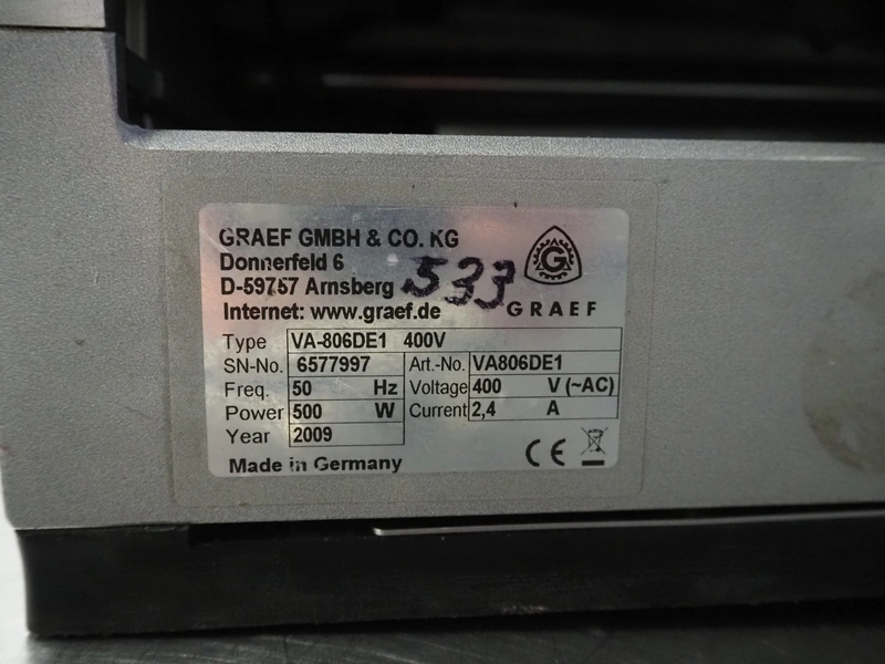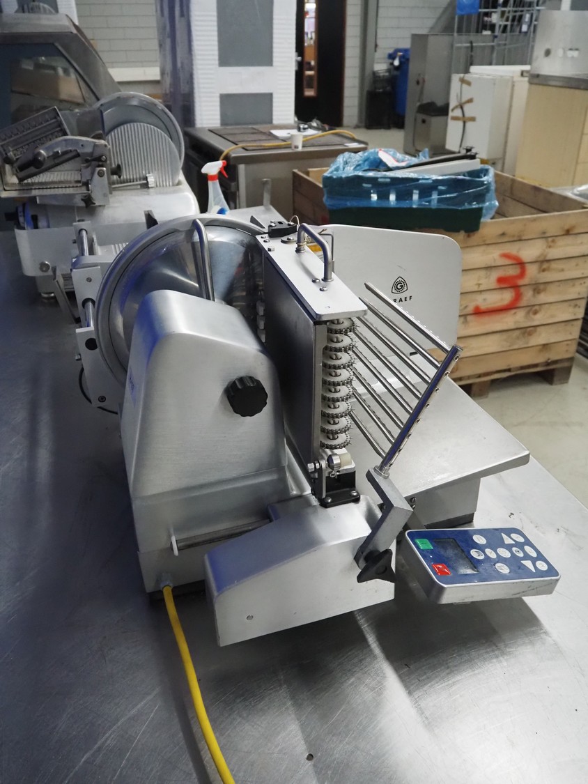 Graef GmbH & Co. KG automatic slicer, type: VA-806DE1, serial number: 6577997, year of construction: 2009, 400 V, 50 Hz, 2.4 A, 500 W, dimensions: 1320 mm x 670 mm x 500 mm. Including knife sharpener.