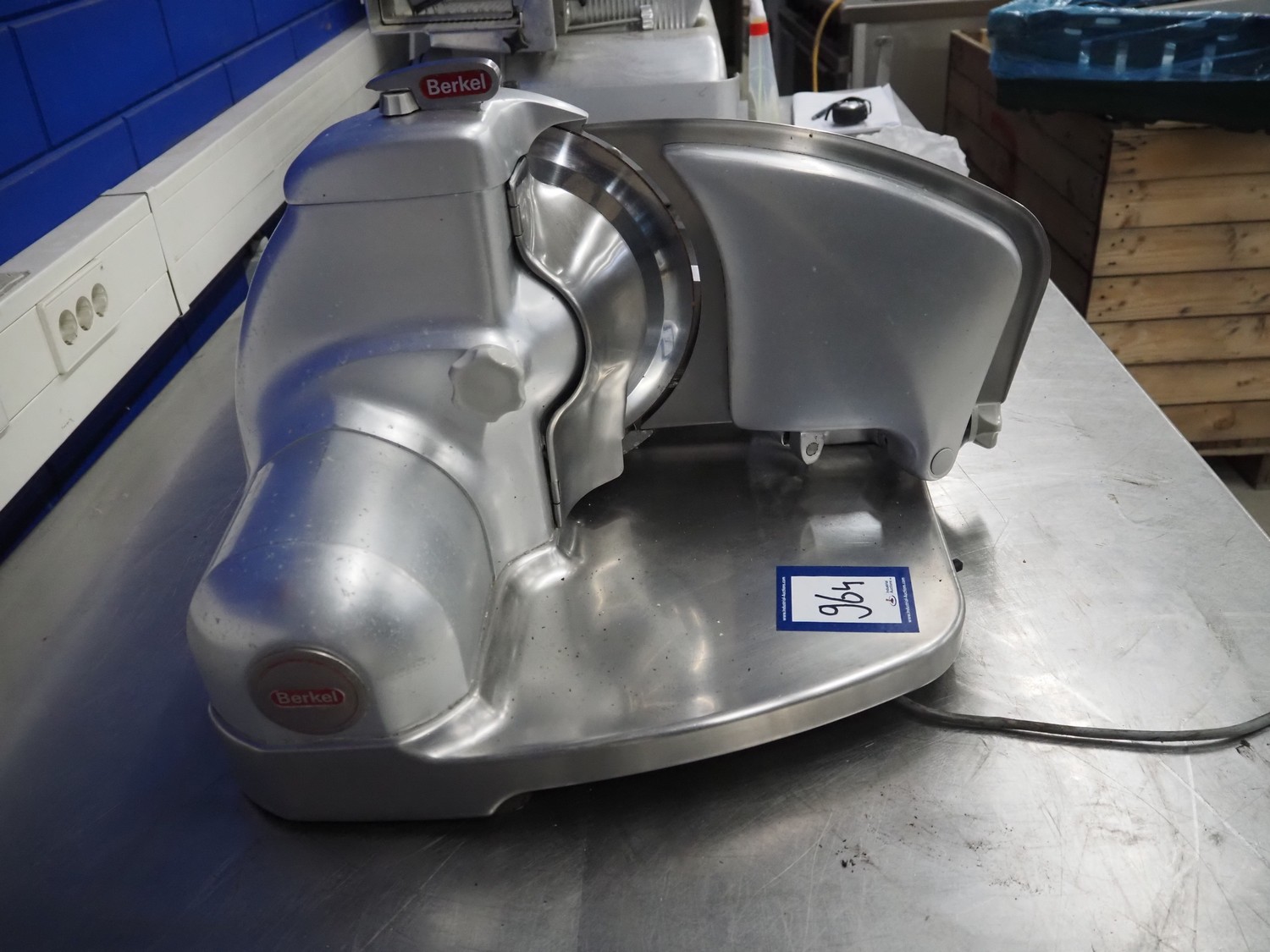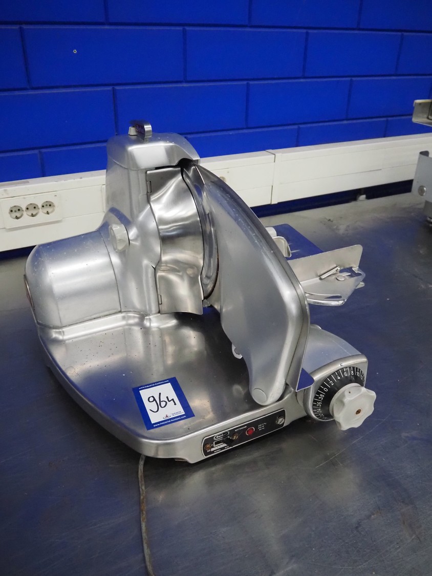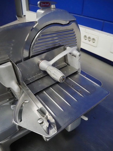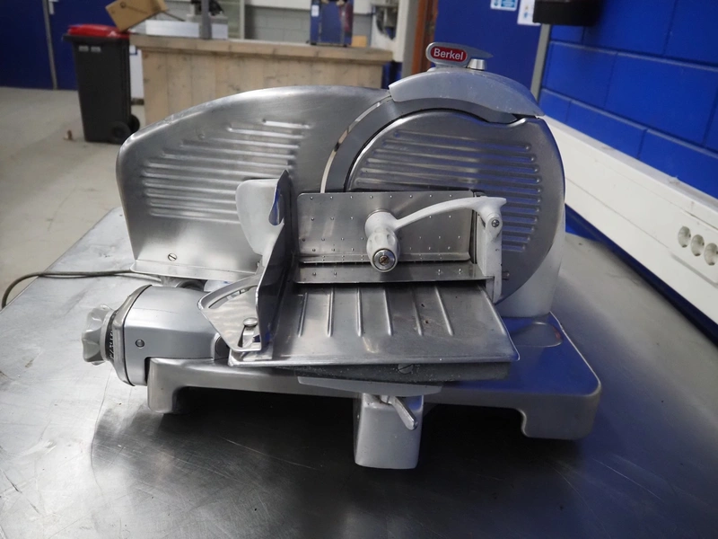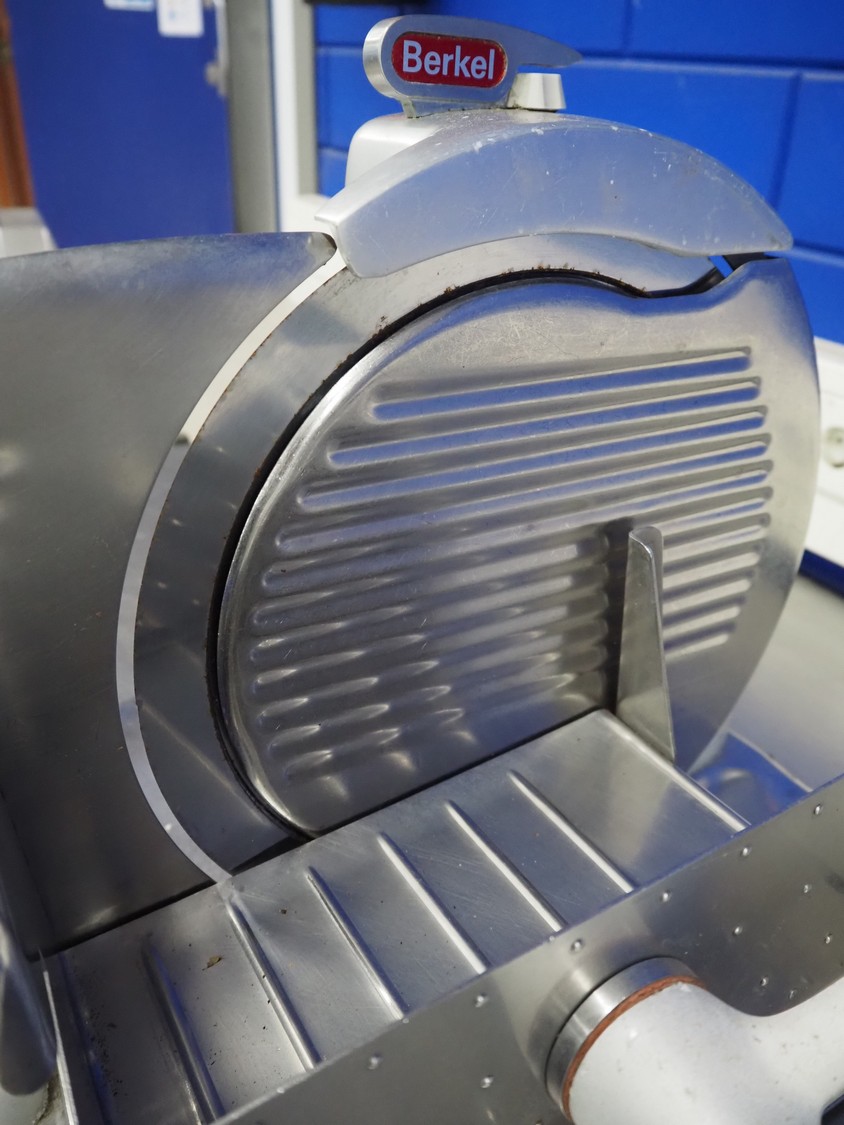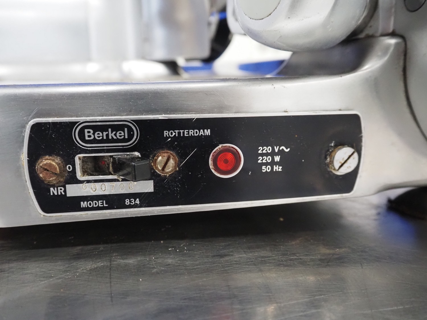 Berkel slicer, model: 834, number: 600780, 220 V, 1 Ph, 50 Hz, 220 W, dimensions: 630 mm x 550 mm x 450 mm.