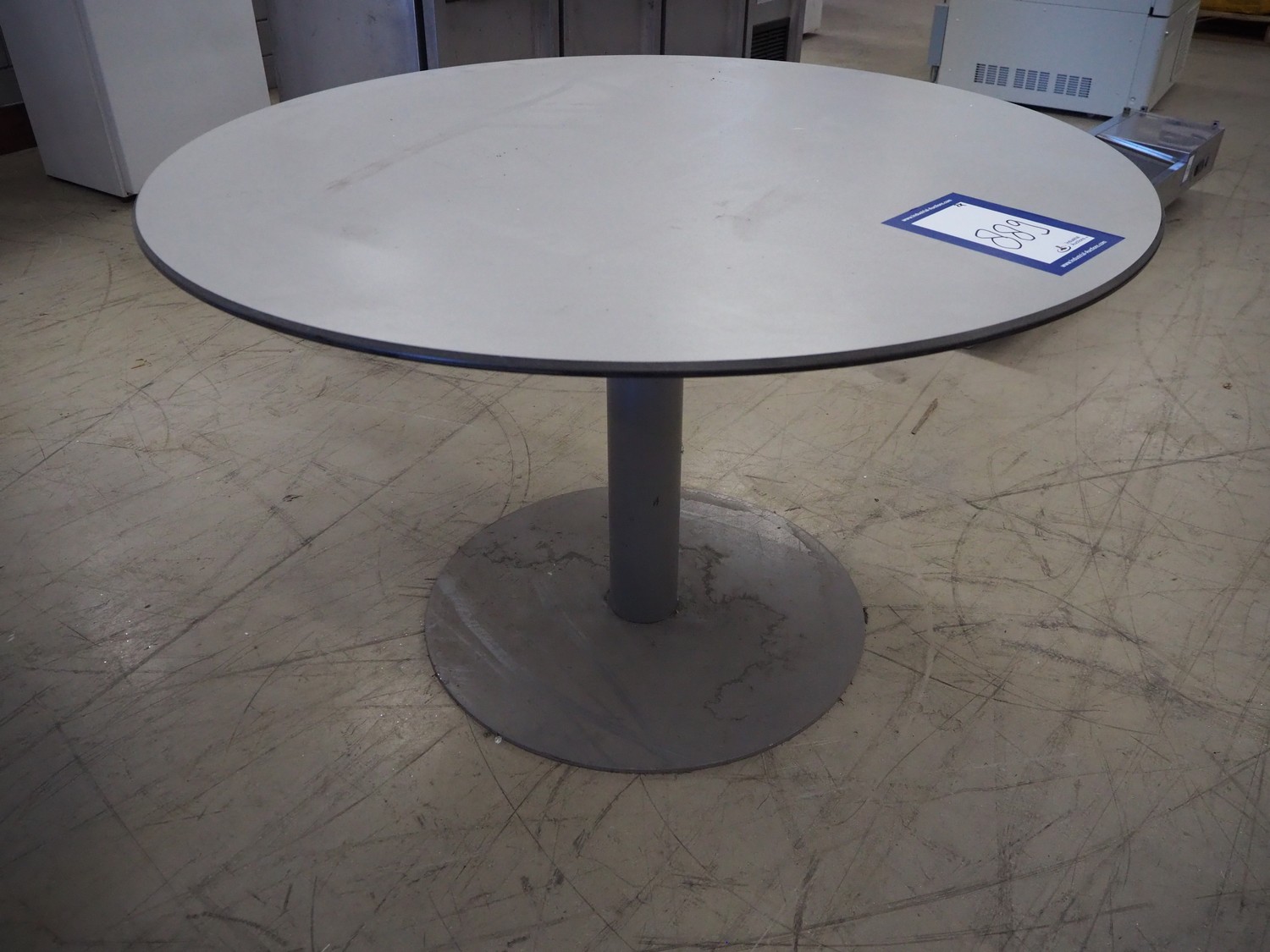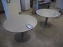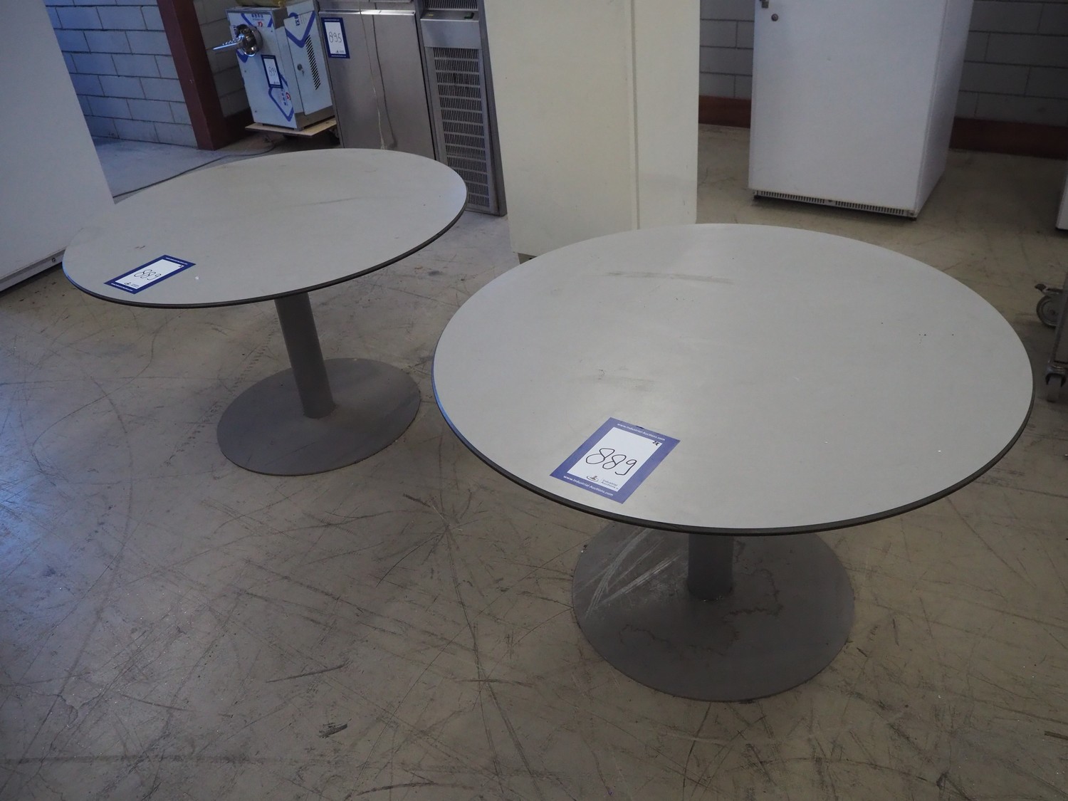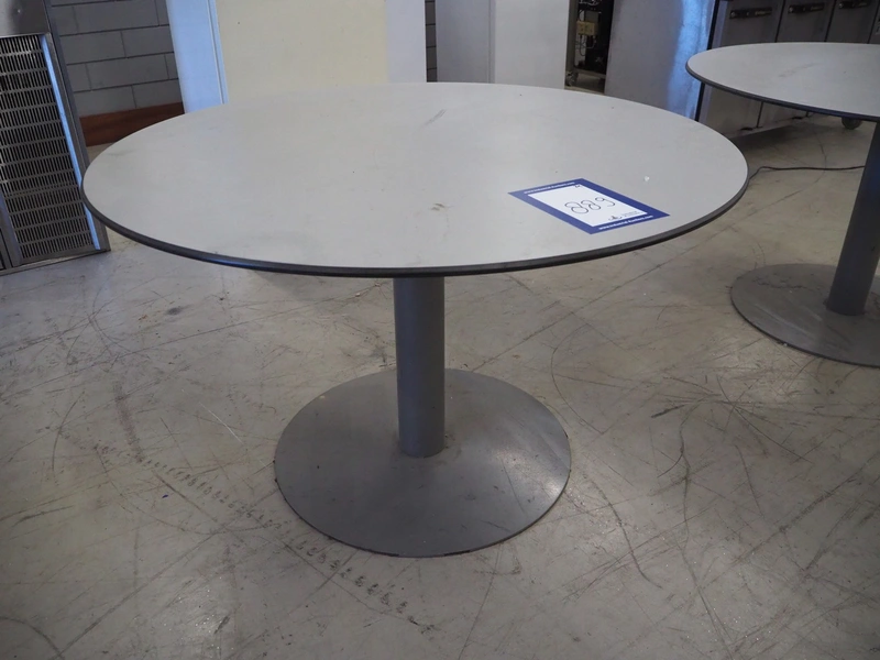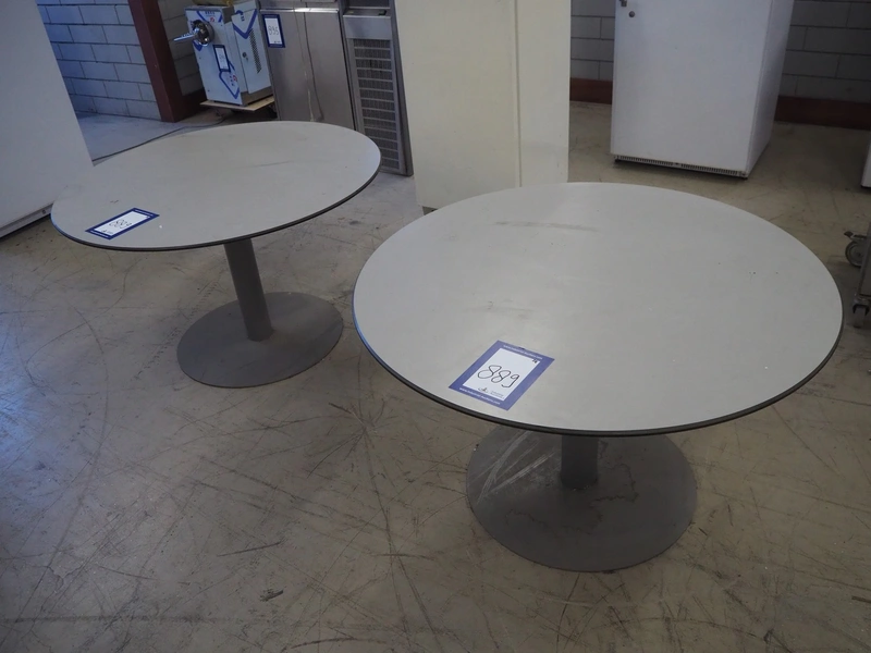 2 tables, steel frame, wooden top, dimensions: (2x) Ø 1190 mm x 740 mm.