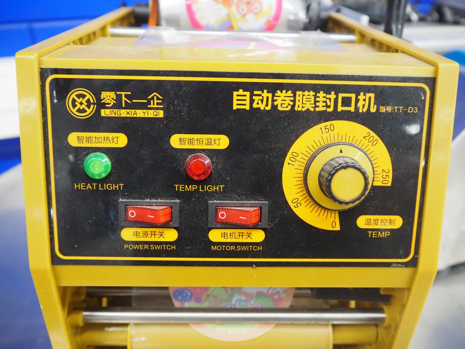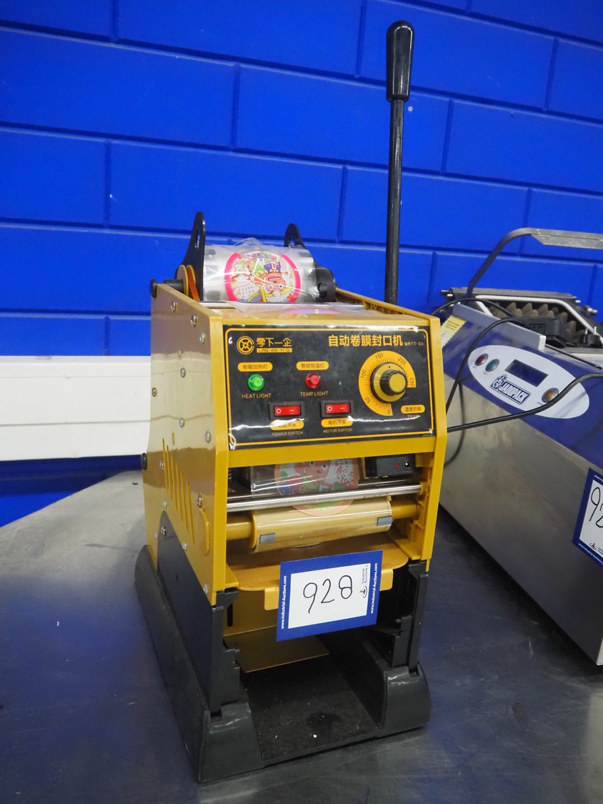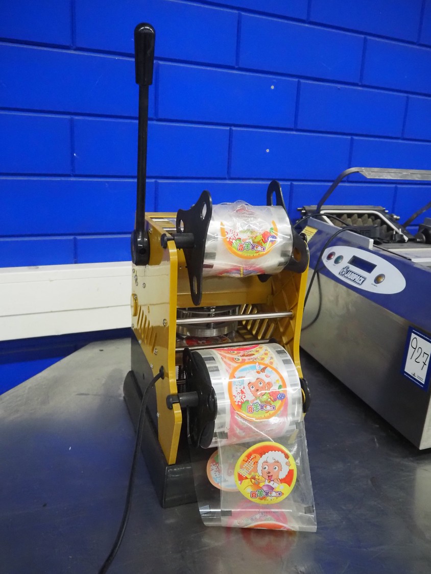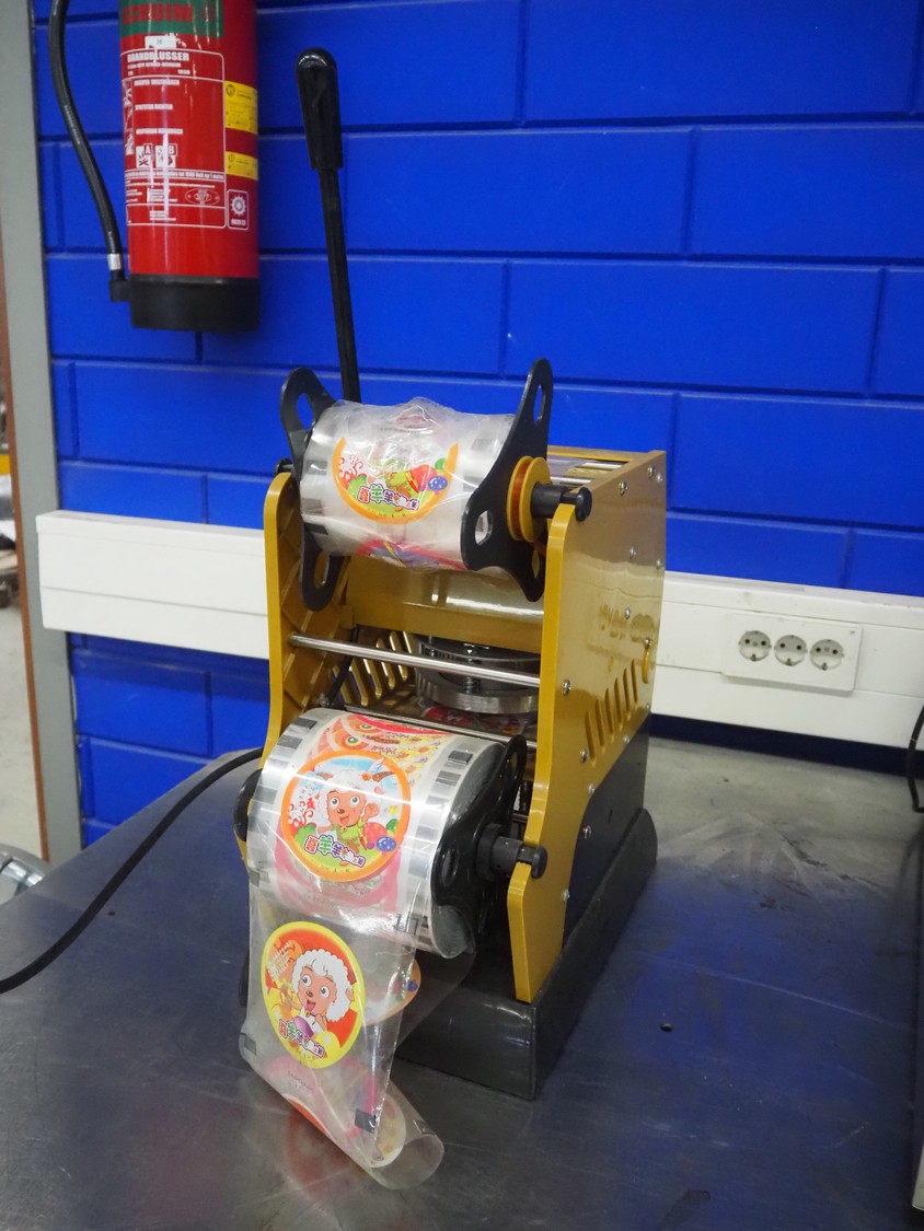 Ling Xia Yi Qi traysealer, diameter dye: 90 mm, total dimensions: 450 mm x 250 mm x 700 mm. With 2 boxes with cups and seals.