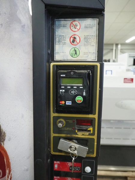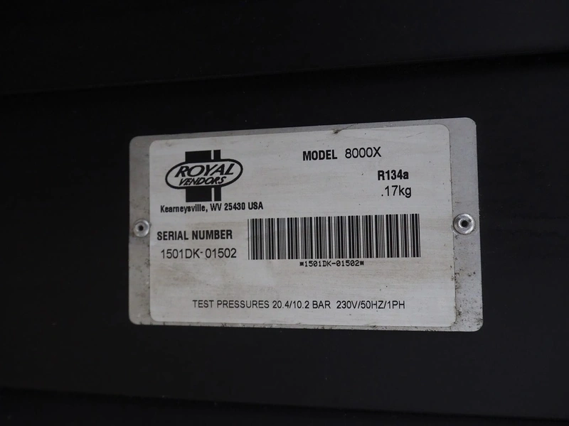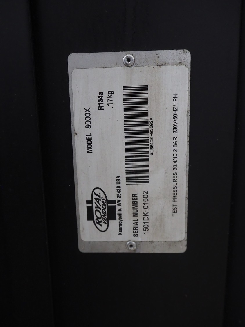 Royal Vendors vending machine, model: 8000X, serial number: 1501DK-01502, 230 V, 1 Ph, 50 Hz, refrigerant: R134a, 0.17 kg, dimensions: 950 mm x 880 mm x 2130 mm.