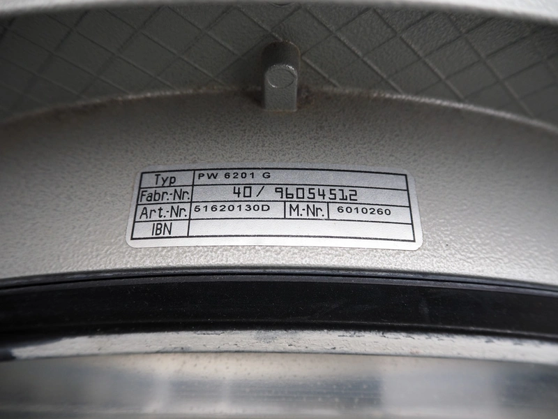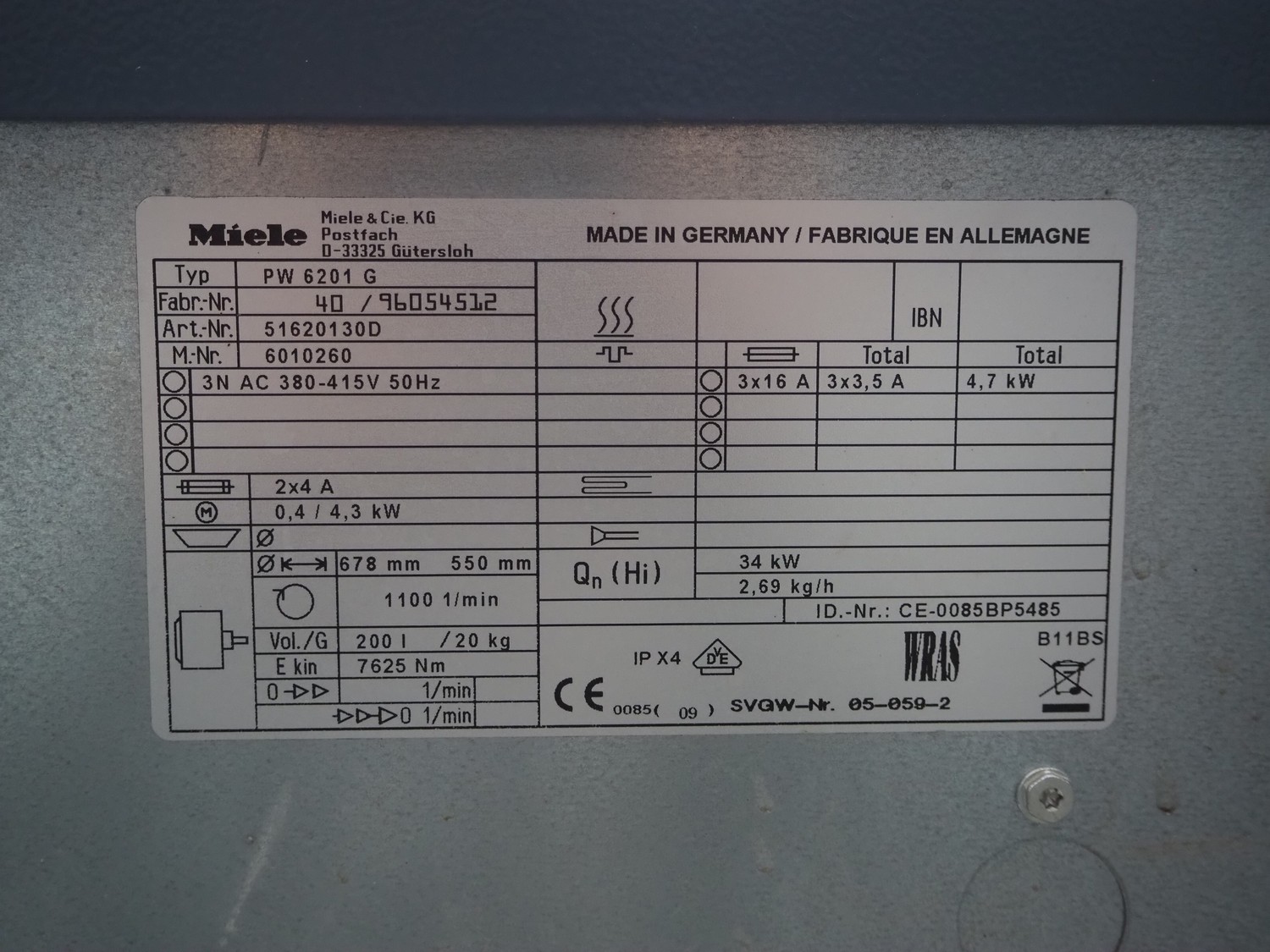 Miele washing machine, type: PW 6201 G, fabrication number: 40/96054512, 380/415 V, 3 Ph, 50 Hz, 3.5 A, 4.7 kW, volume: 200 liter, dimensions: 1500 mm x 900 mm x 1400 mm.