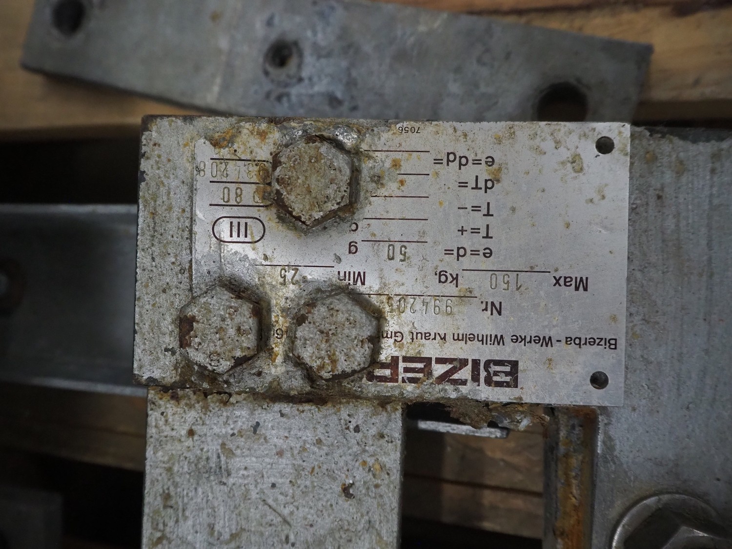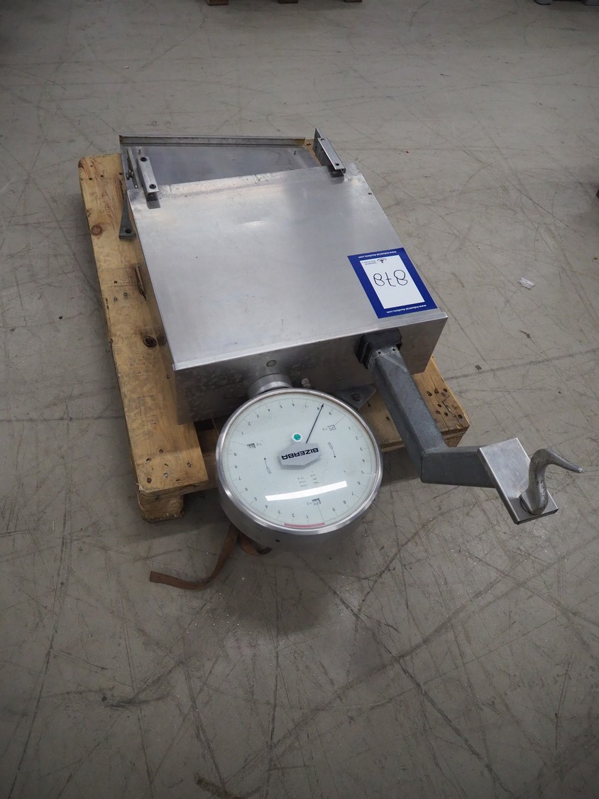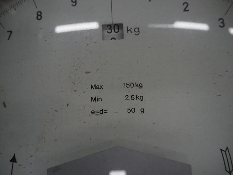 Bizerba weighing scale, number: 994205, weighing range: 2.5-30 kg, e=d= 50g, dimensions: 1250 mm x 600 mm x 250 mm.