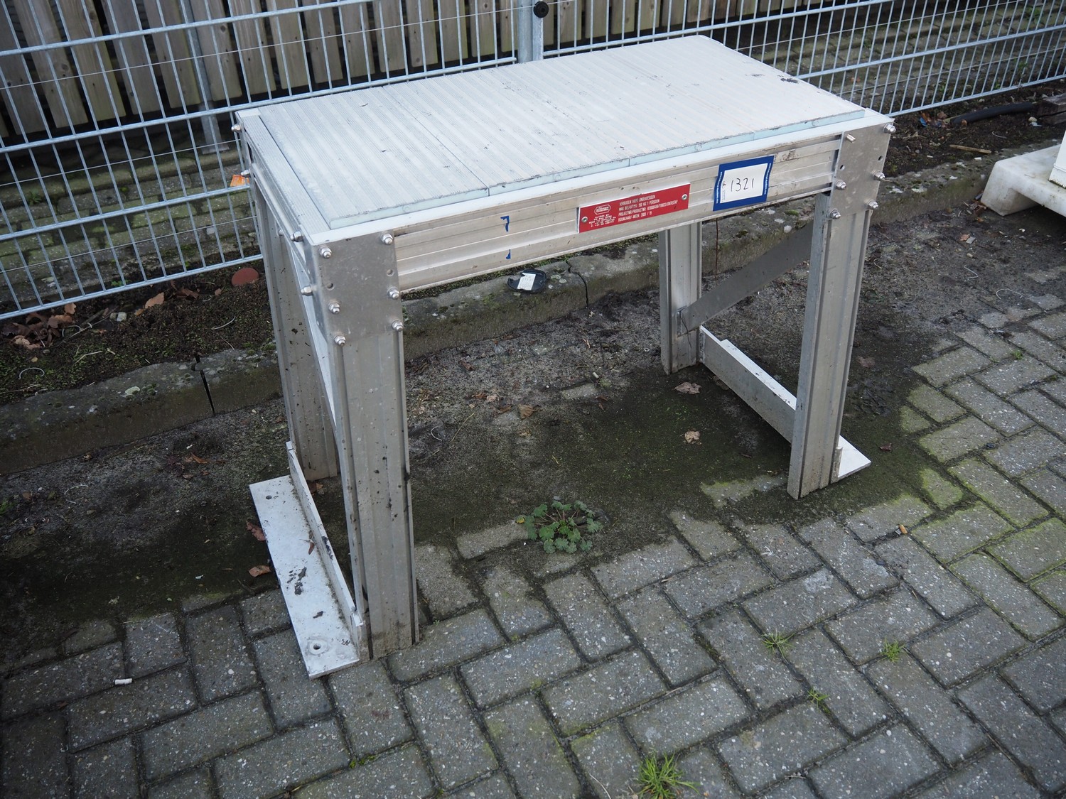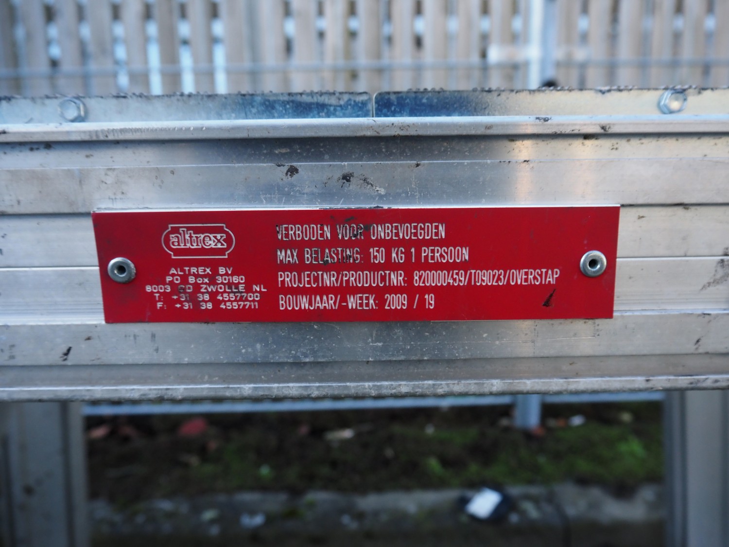 Altrex working platform, product number: 820000459/T09023/OVERSTAP, year of construction: 04/2009, max capacity: 150 kg, working height: 820 mm, total dimensions: 1230 mm x 540 mm x 820 mm.