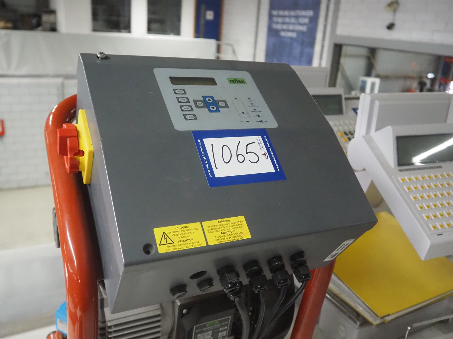 Reflex Winkelmann GmbH control unit, type: GSM 150, number: 202 153 0000, year of construction: 2008, 400 V, 50 Hz, 3.1 A, 1.1 kW, dimensions: 410 mm x 390 mm x 610 mm.