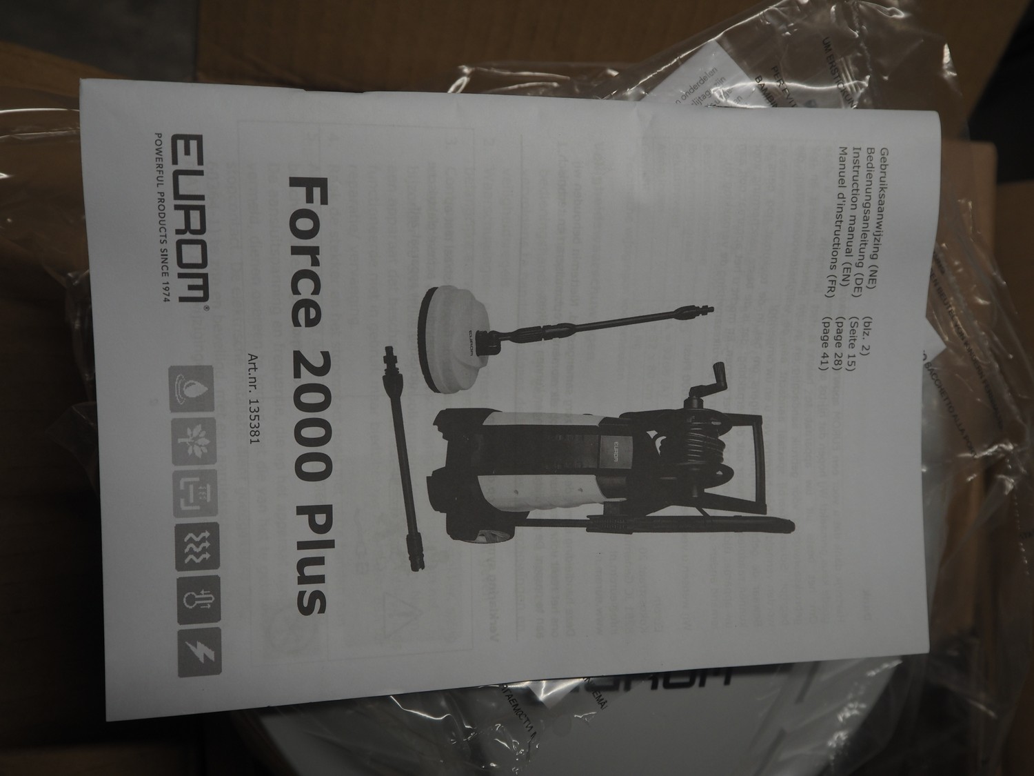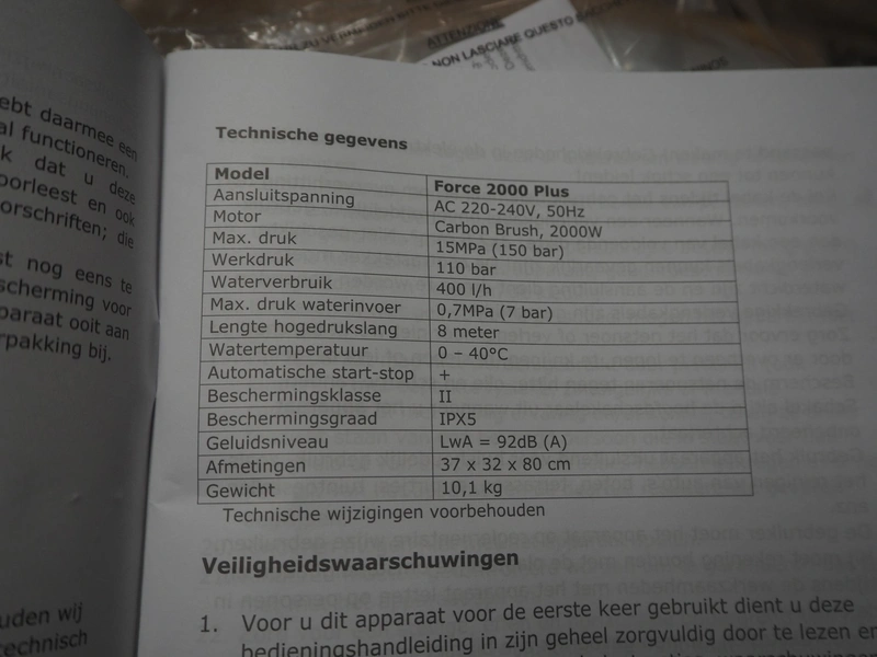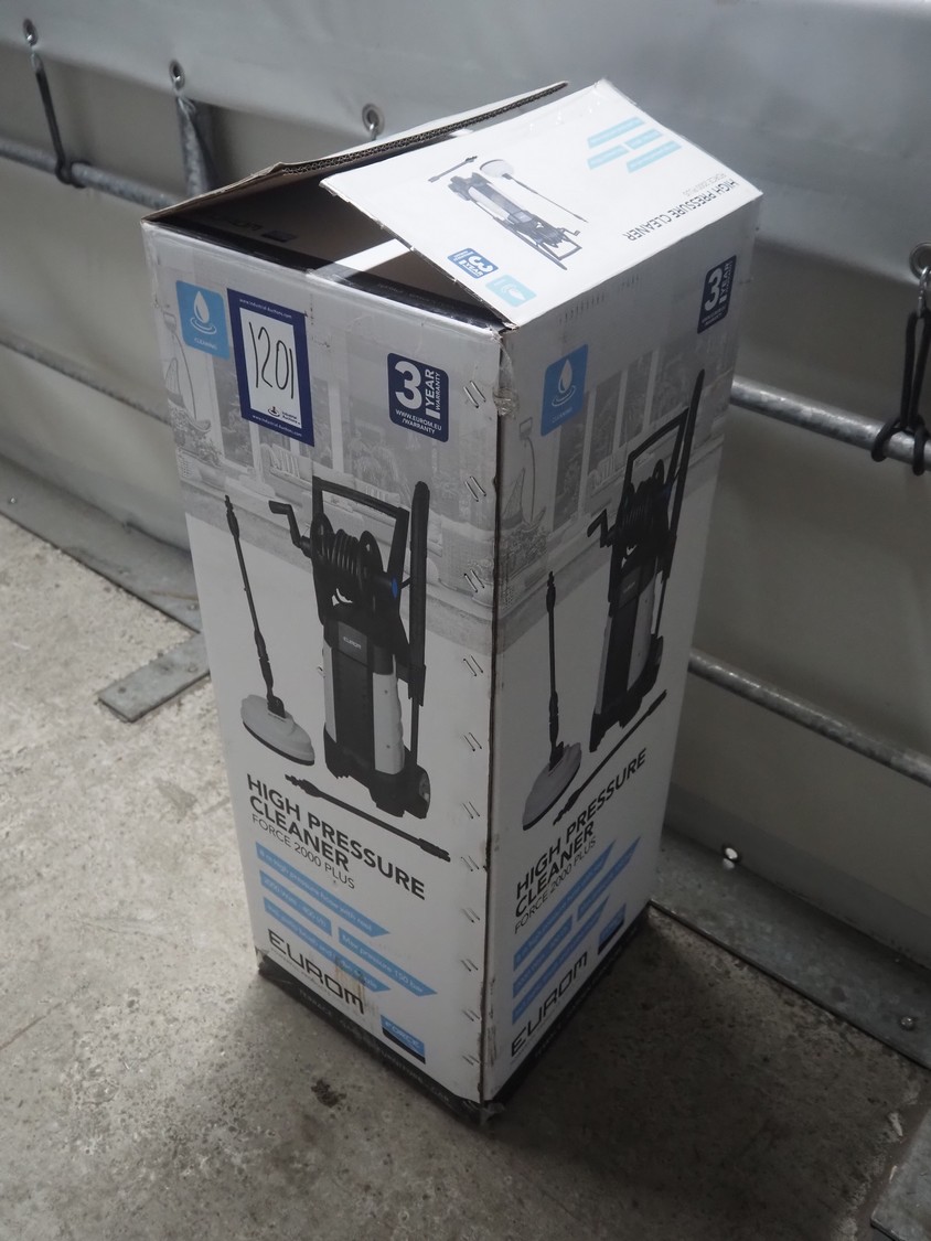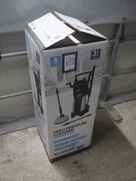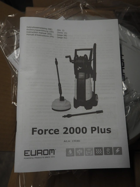 Eurom high pressure cleaner, model: Force 2000 Plus, number: 135381, 220/240 V, 1 Ph, 50 Hz, 2000 W, weight: 10 kg, dimensions: 870 mm x 340 mm x 330 mm.