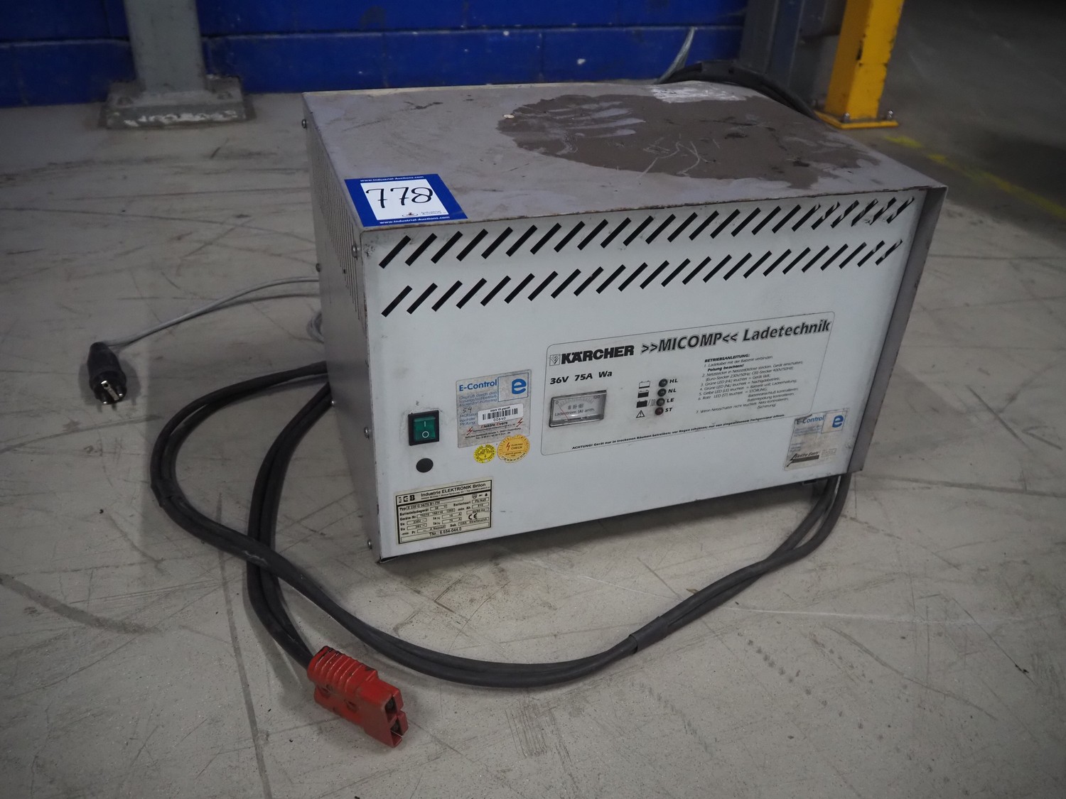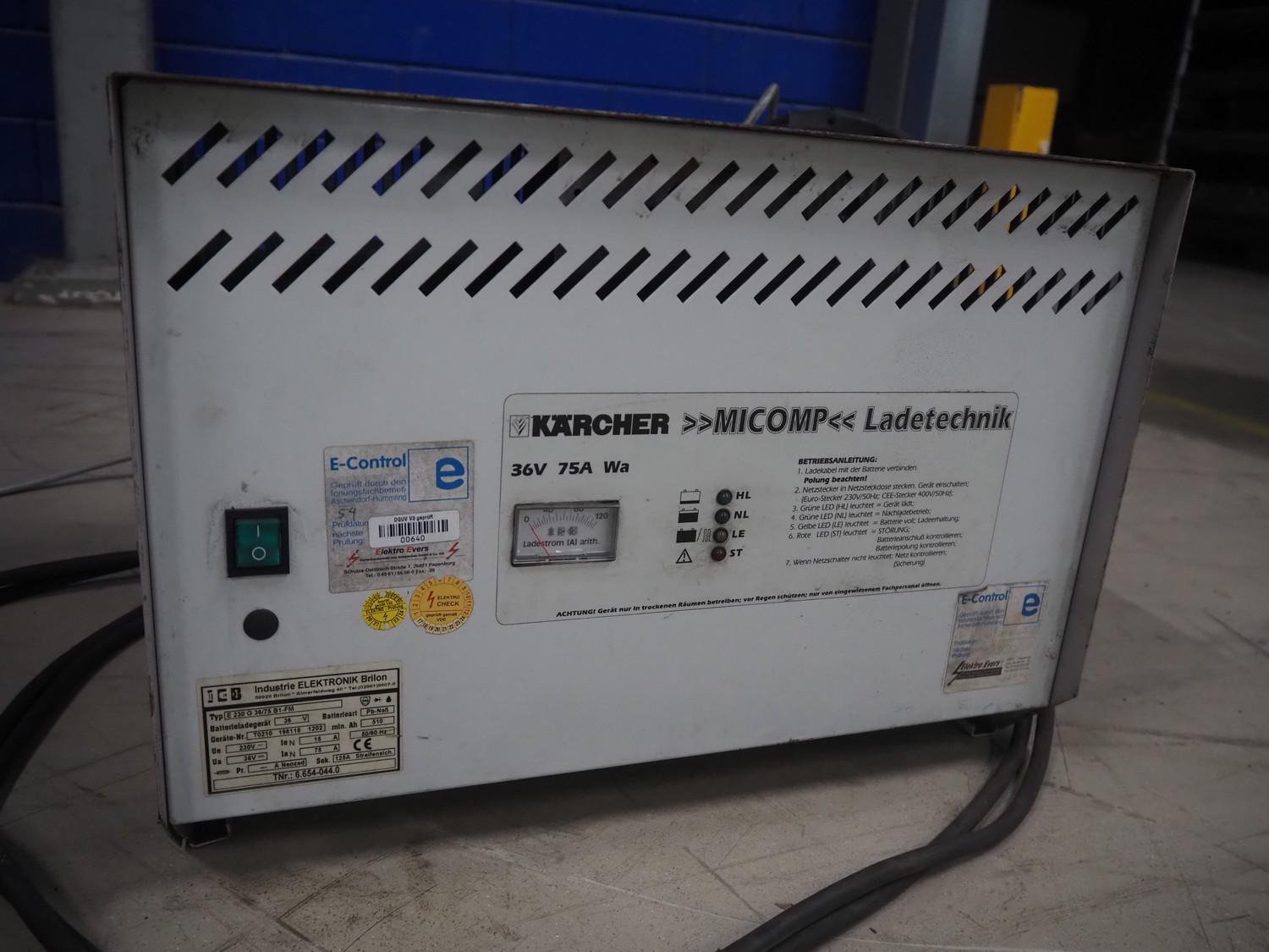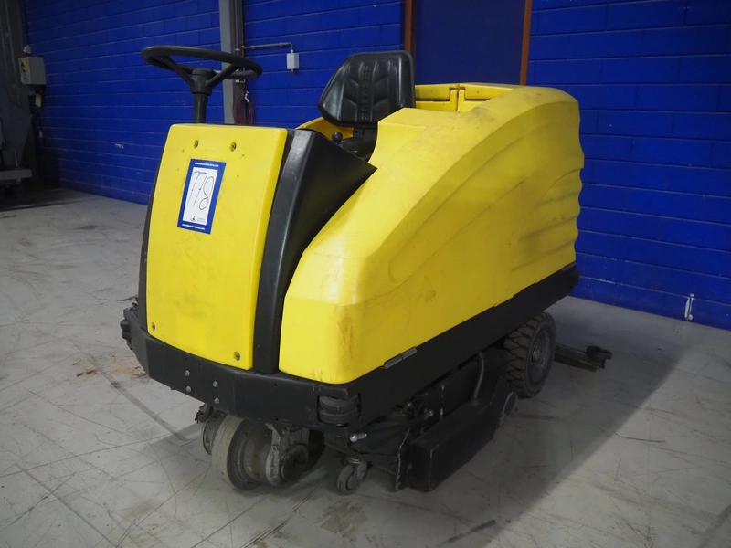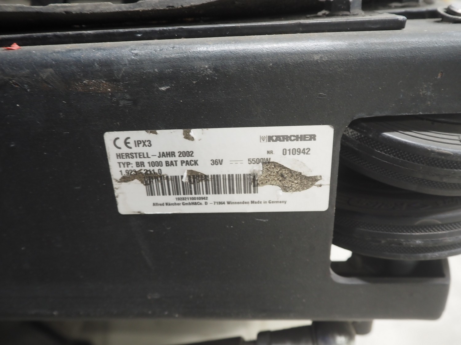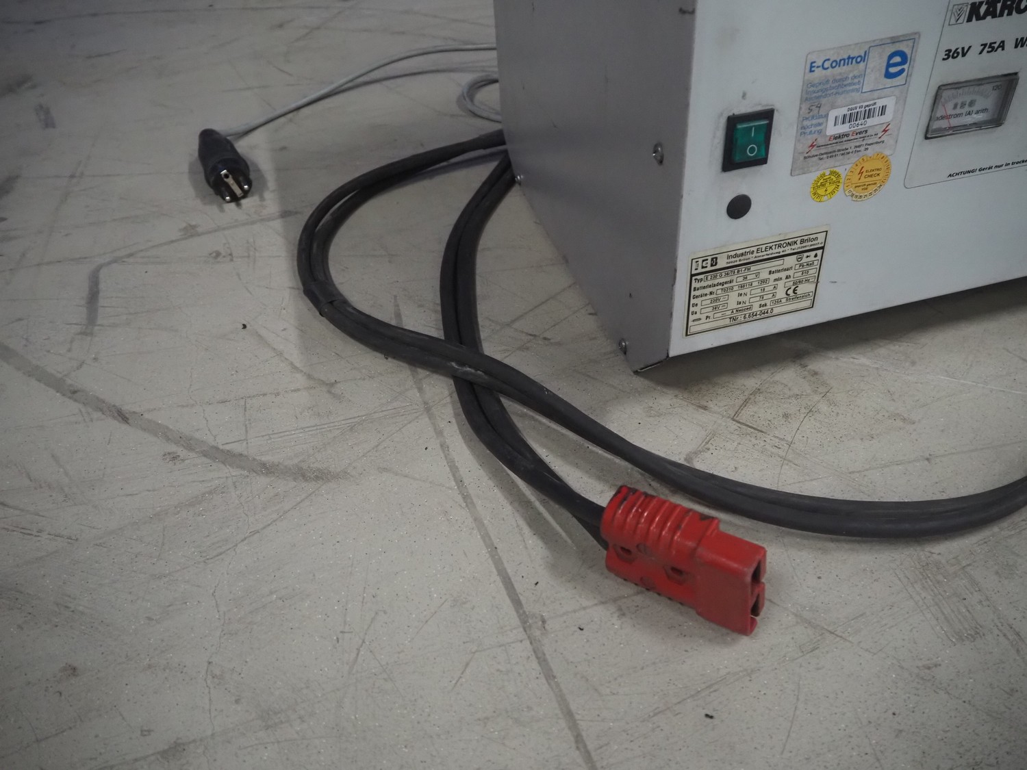 Kärcher floor scrubbing machine, model: BR 1000 bat pack, number: 010942, year of construction: 2002, 36 V, 5500 W, dimensions: 2000 mm x 1380 mm x 1450 mm. Including battery charger, type: E 230 G 36/75 B1-FM, 230 V, 1 Ph, 50/60 Hz, 15/75 A, dimensions: 500 mm x 380 mm x 360 mm.