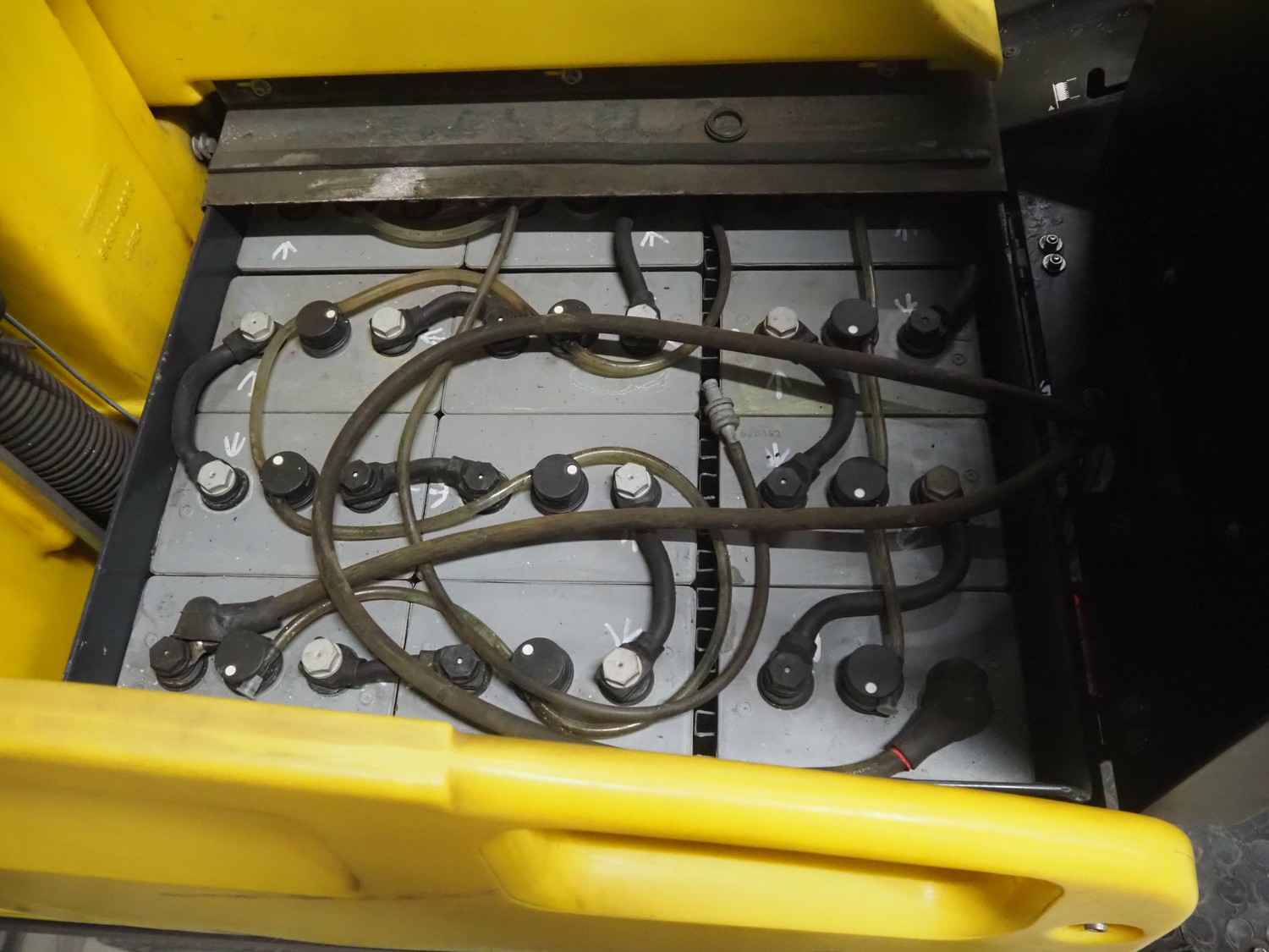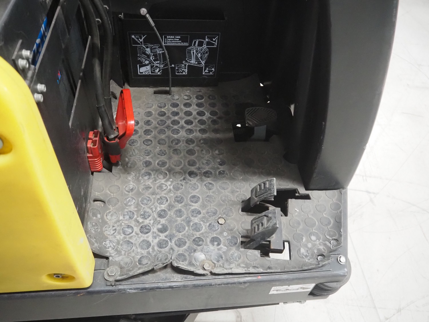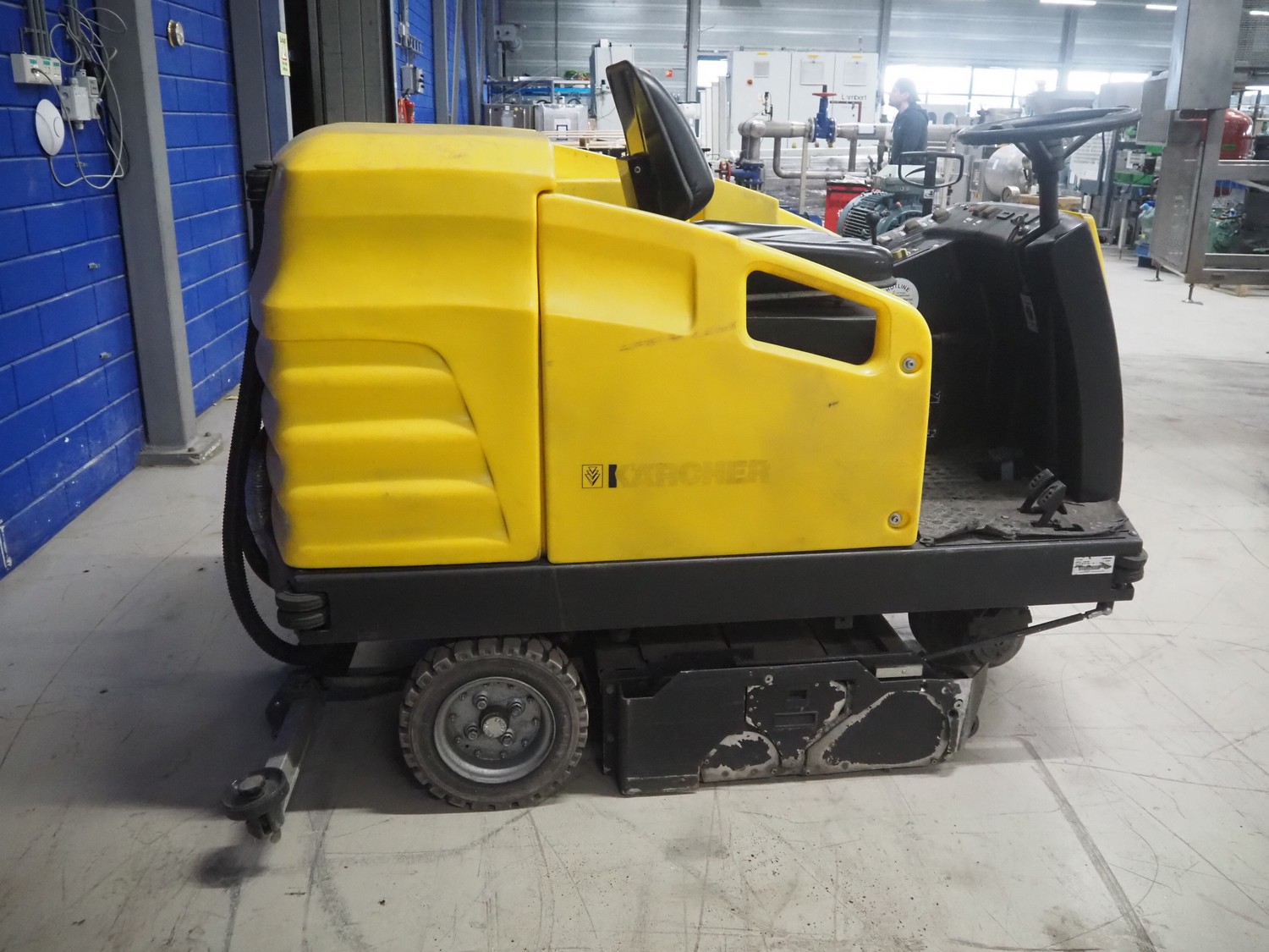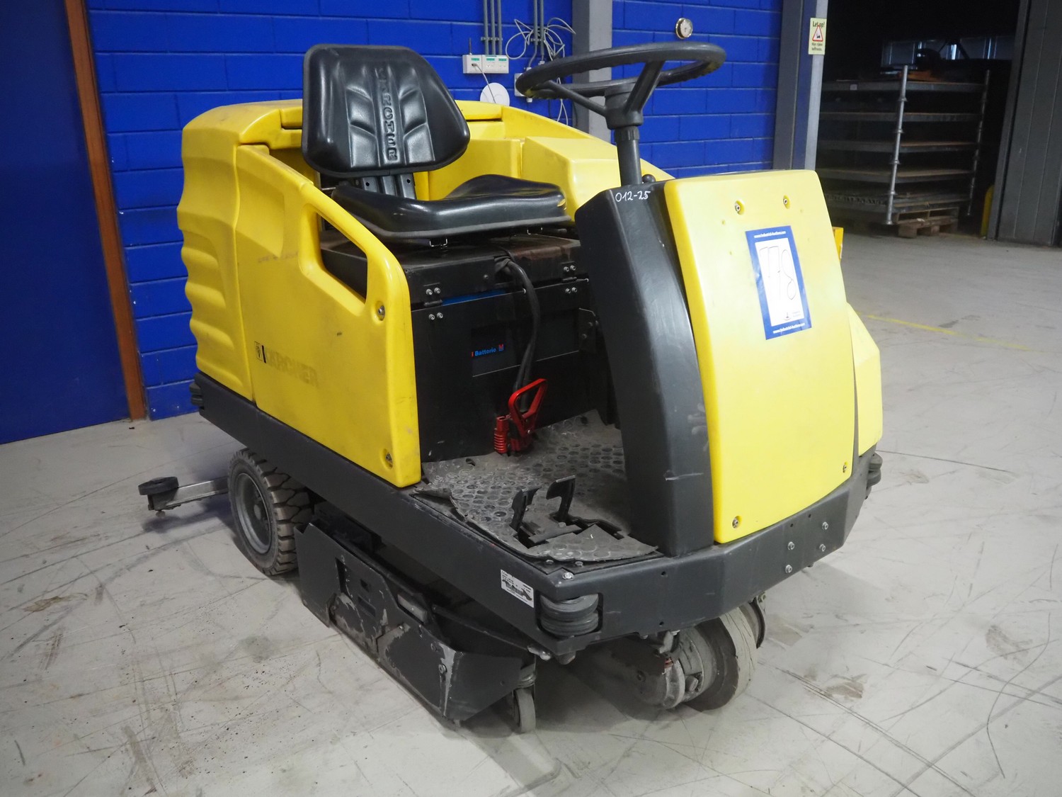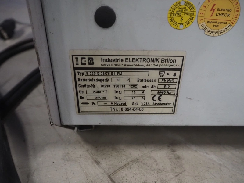 Kärcher floor scrubbing machine, model: BR 1000 bat pack, number: 010942, year of construction: 2002, 36 V, 5500 W, dimensions: 2000 mm x 1380 mm x 1450 mm. Including battery charger, type: E 230 G 36/75 B1-FM, 230 V, 1 Ph, 50/60 Hz, 15/75 A, dimensions: 500 mm x 380 mm x 360 mm.