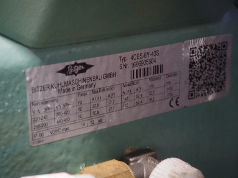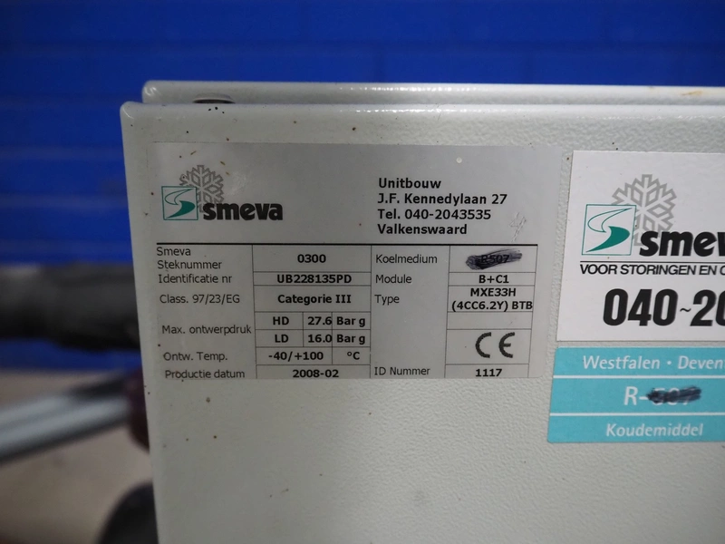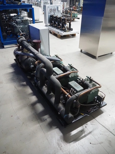 Smeva compressor rack with 3 Bitzer Kühlmaschinenbau GmbH cooling compressors, compressor rack type: MXE33H (4CC6.2Y) BTB, number: 1117, year of construction: 02/2008, compressor type: (2x) 4CC-6.2Y-40S, capacity: 32.5/39.2 m³ per hour, (1x) 4CES-6Y-40S, capacity: 32.5/39.2 m³ per hour, dimensions: 2250 mm x 740 mm x 860 mm.