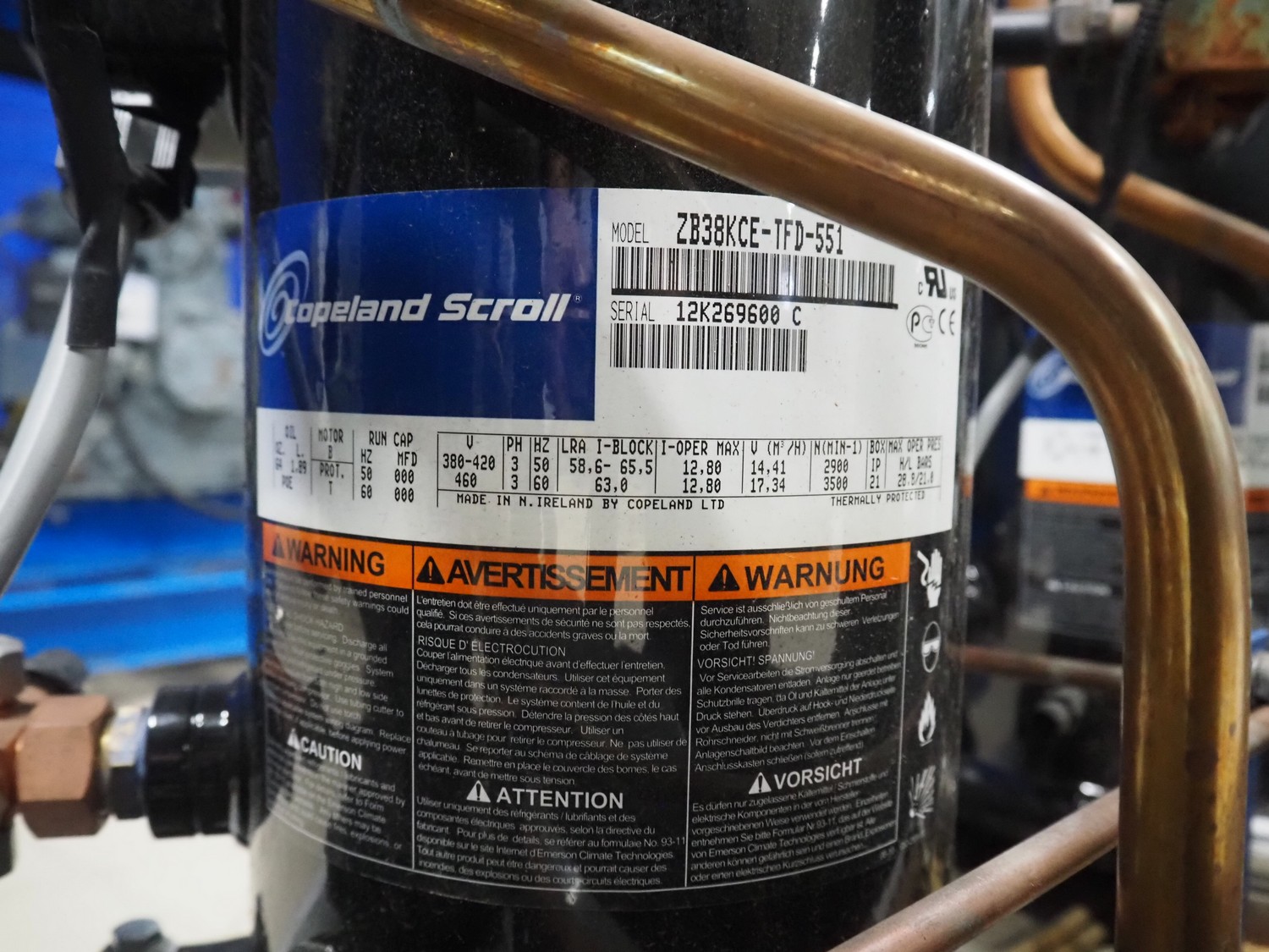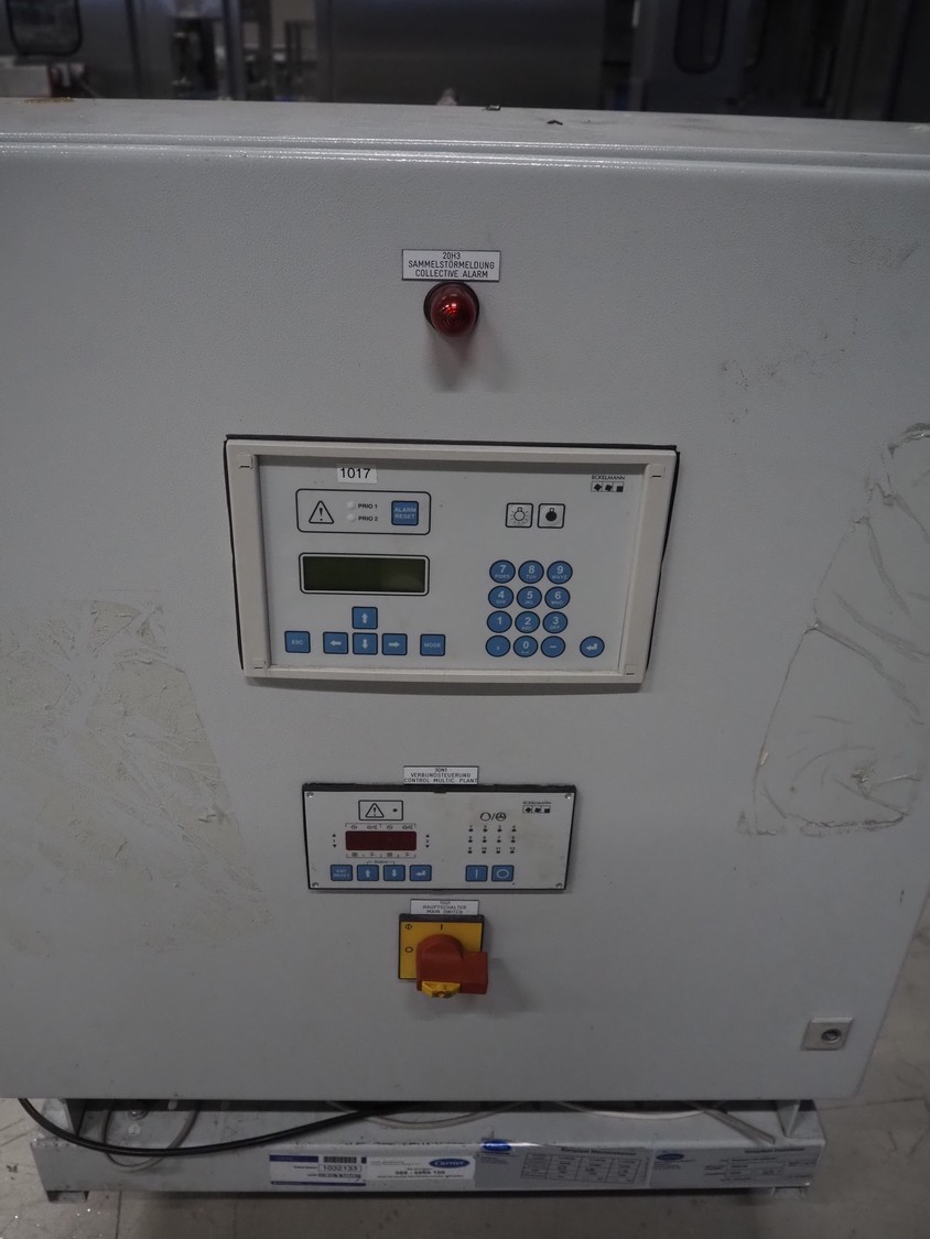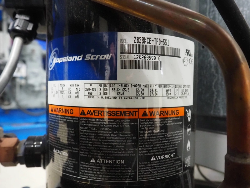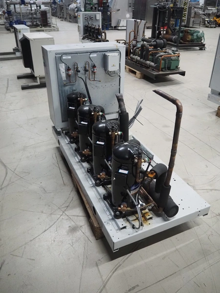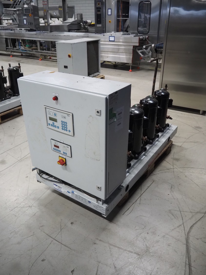 Carrier compressor rack with 4 Copeland scroll cooling compressors, compressor rack type: INNO BASIC VPP460-2340 4039659, serial number: 159637/135/15214, year of construction: 2012, 400 V, 3 Ph, 50 Hz, refrigerant: R404A, Copeland scroll compressor type: (4x) ZB38KCE-TFD-551, capacity: 14.41/17.34 m³ per hour, dimensions: 1700 mm x 800 mm x 1000 mm.