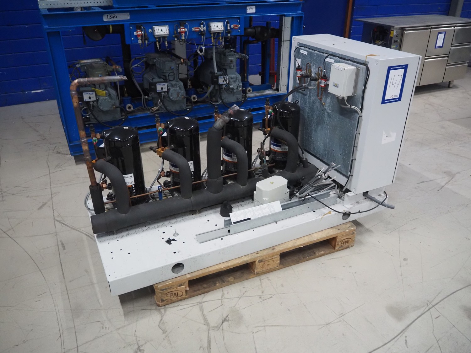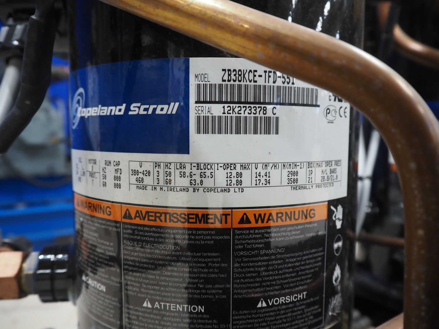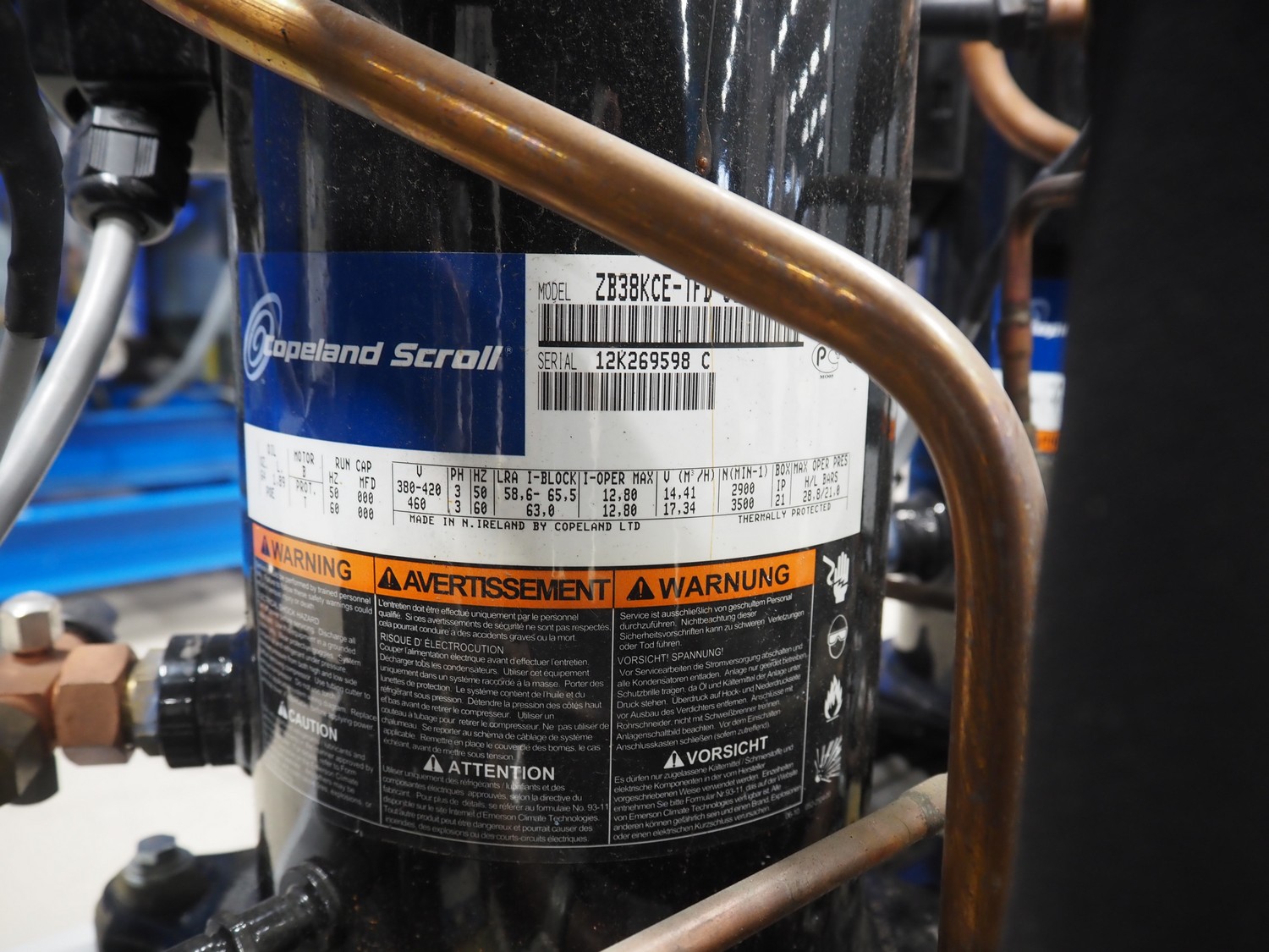 Carrier compressor rack with 4 Copeland scroll cooling compressors, compressor rack type: INNO BASIC VPP460-2340 4039659, serial number: 159637/135/15214, year of construction: 2012, 400 V, 3 Ph, 50 Hz, refrigerant: R404A, Copeland scroll compressor type: (4x) ZB38KCE-TFD-551, capacity: 14.41/17.34 m³ per hour, dimensions: 1700 mm x 800 mm x 1000 mm.