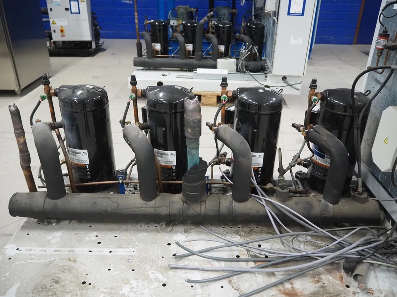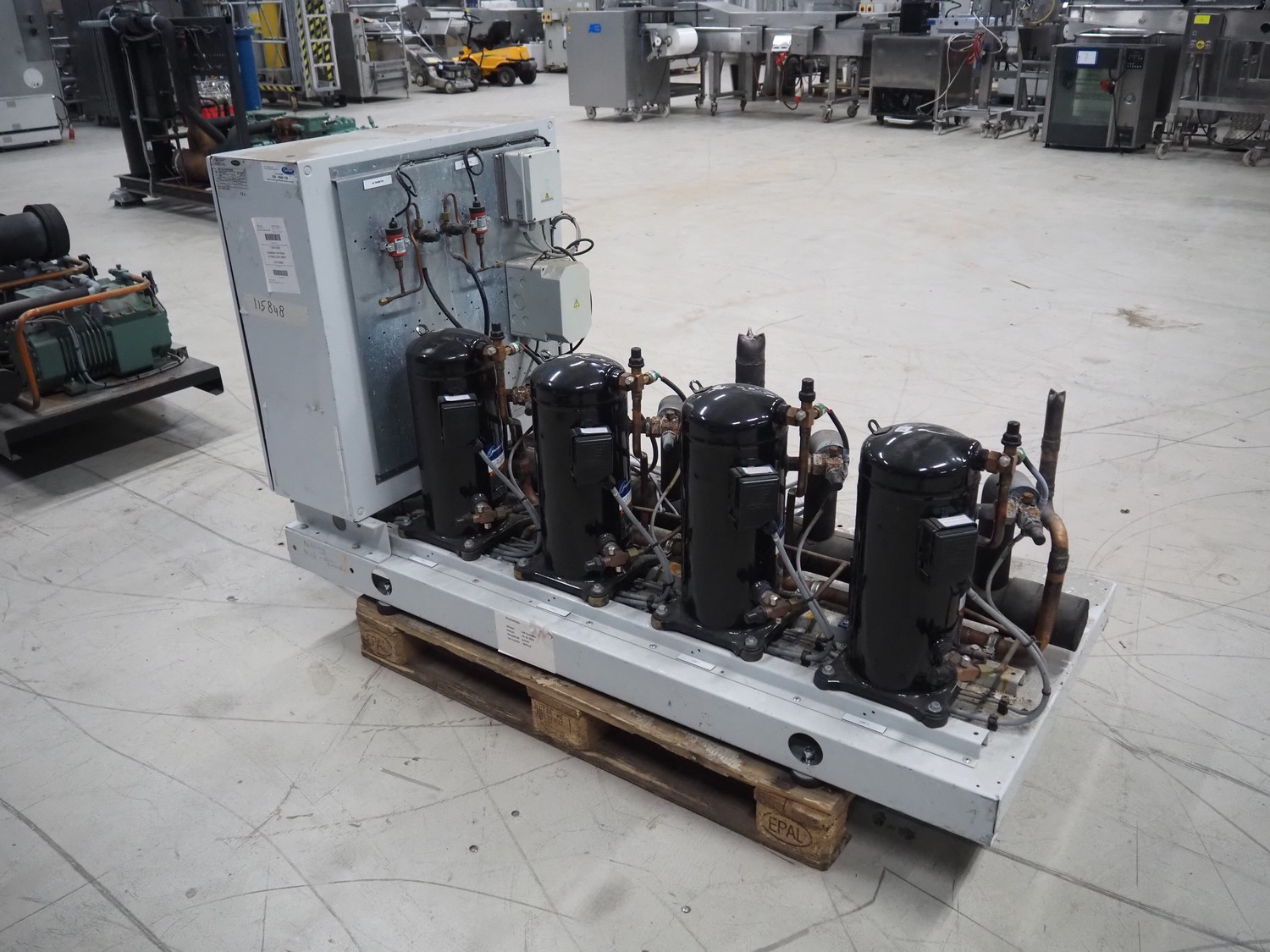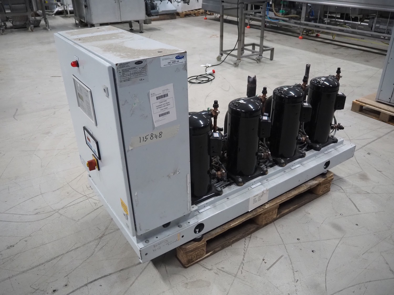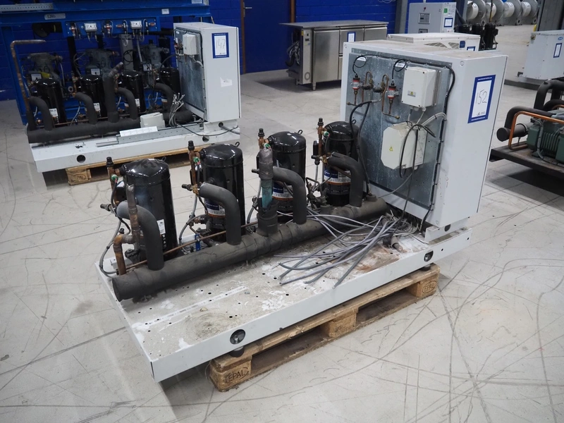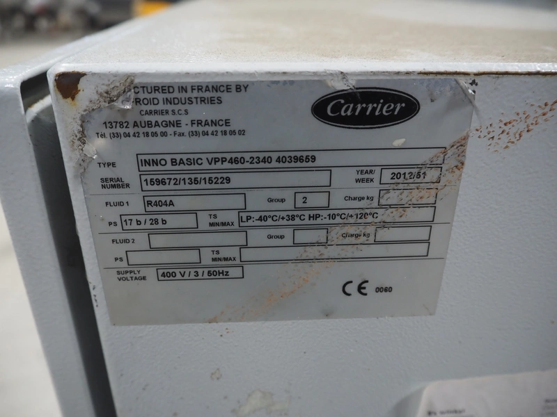 Carrier compressor rack with 4 Copeland scroll cooling compressors, compressor rack type: INNO BASIC VPP460-2340 4039659, serial number: 159672/135/15229, year of construction: 2012, 400 V, 3 Ph, 50 Hz, refrigerant: R404A, Copeland scroll compressor type: (4x) ZB38KCE-TFD-551, capacity: 14.41/17.34 m³ per hour, dimensions: 1700 mm x 800 mm x 1000 mm.