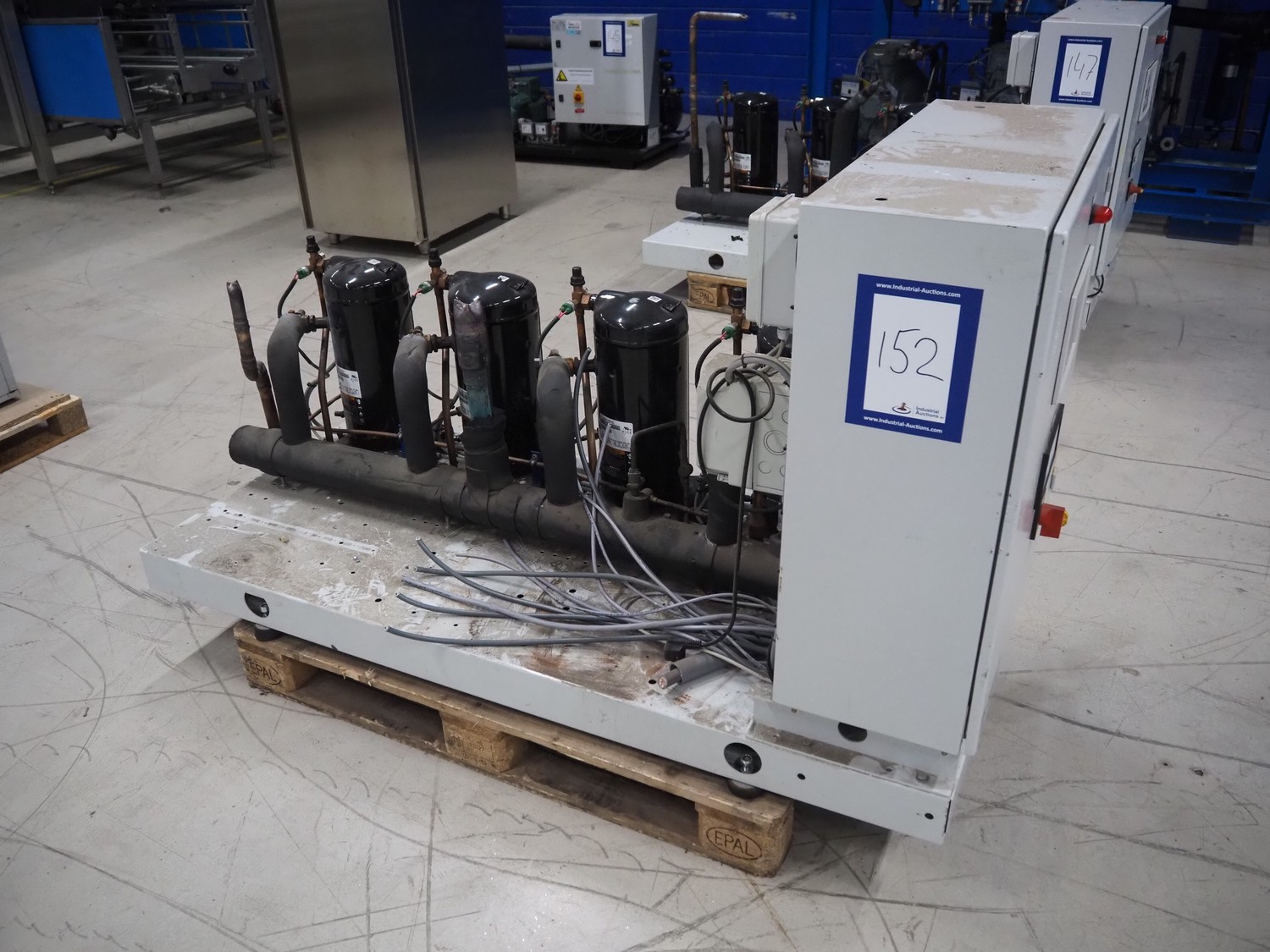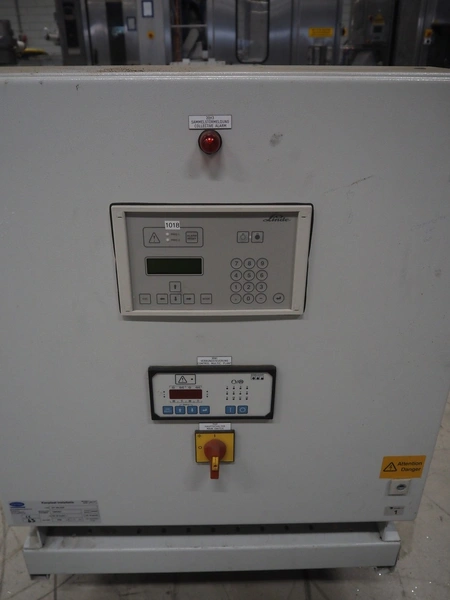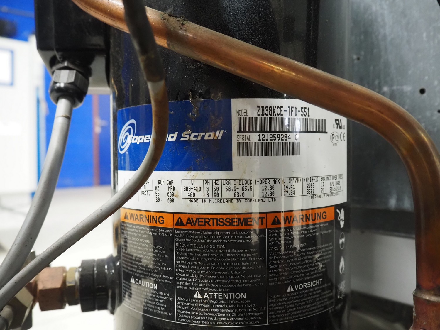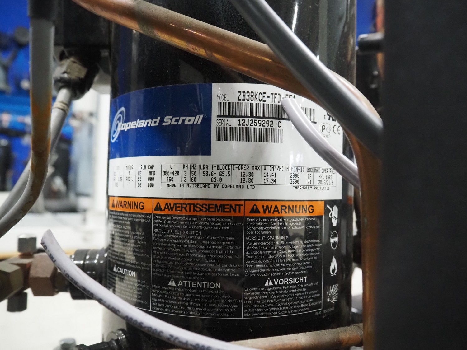 Carrier compressor rack with 4 Copeland scroll cooling compressors, compressor rack type: INNO BASIC VPP460-2340 4039659, serial number: 159672/135/15229, year of construction: 2012, 400 V, 3 Ph, 50 Hz, refrigerant: R404A, Copeland scroll compressor type: (4x) ZB38KCE-TFD-551, capacity: 14.41/17.34 m³ per hour, dimensions: 1700 mm x 800 mm x 1000 mm.