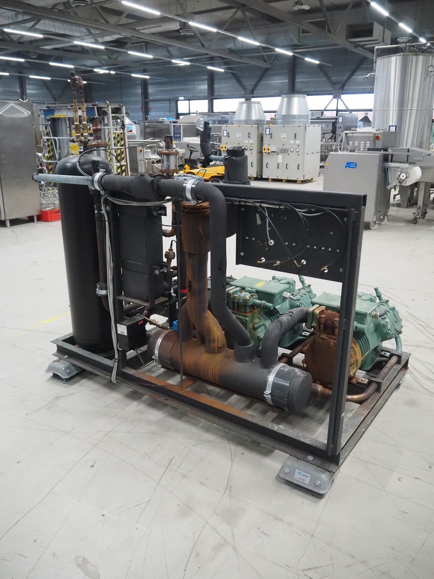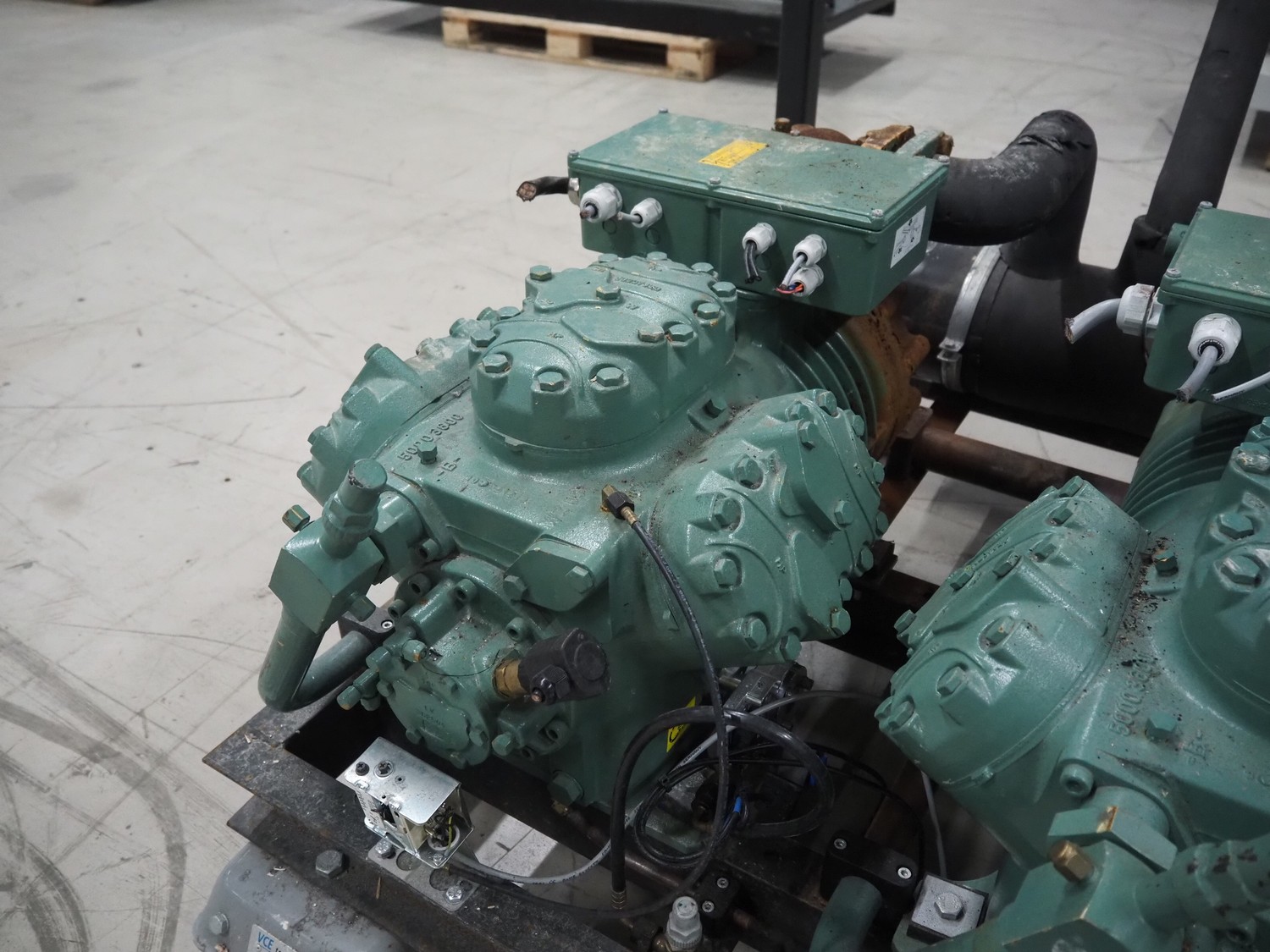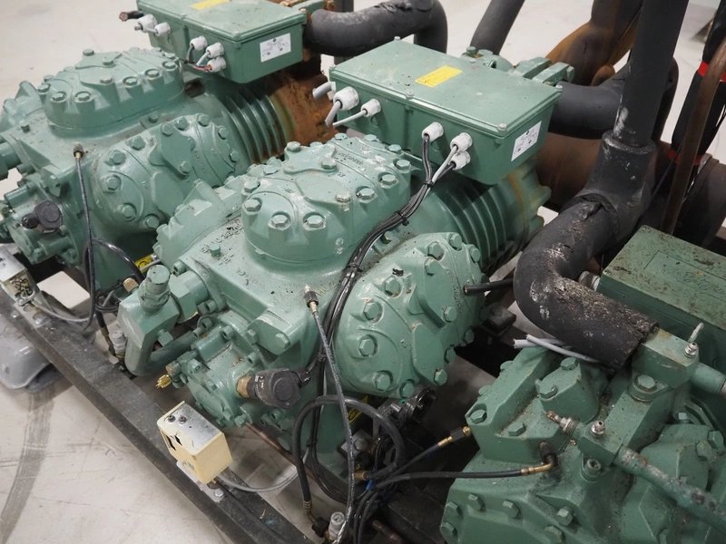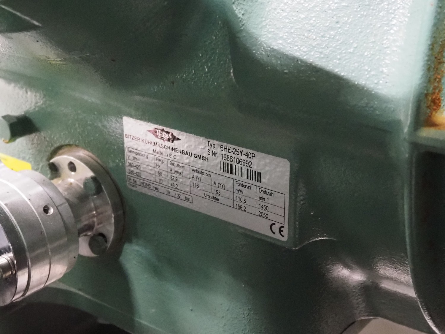 Bitzer Kühlmaschinenbau GmbH compressor rack with 3 cooling compressors, type: (2x) 6HE-25Y-40P, capacity: 110.5/156.2 m³ per hour, (1x) 4EES-6Y-40S, capacity: 22.7/27.4 m³ per hour, dimensions: 2000 mm x 1300 mm x 1850 mm.