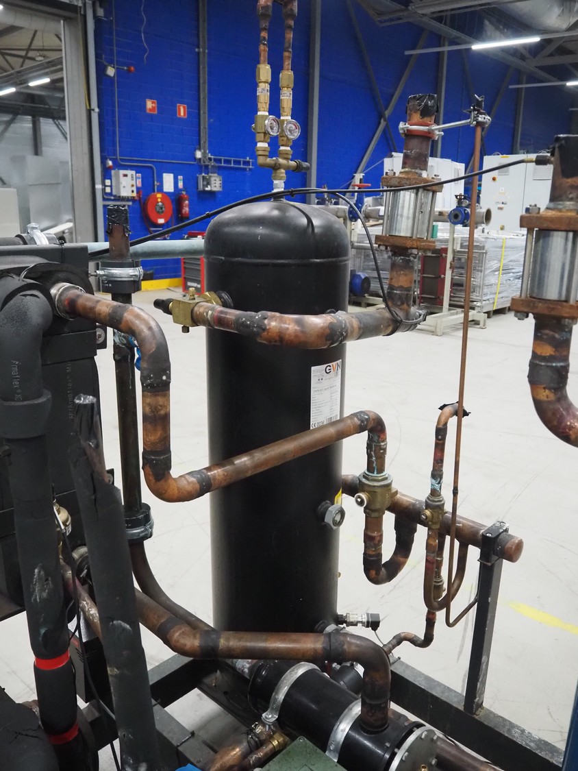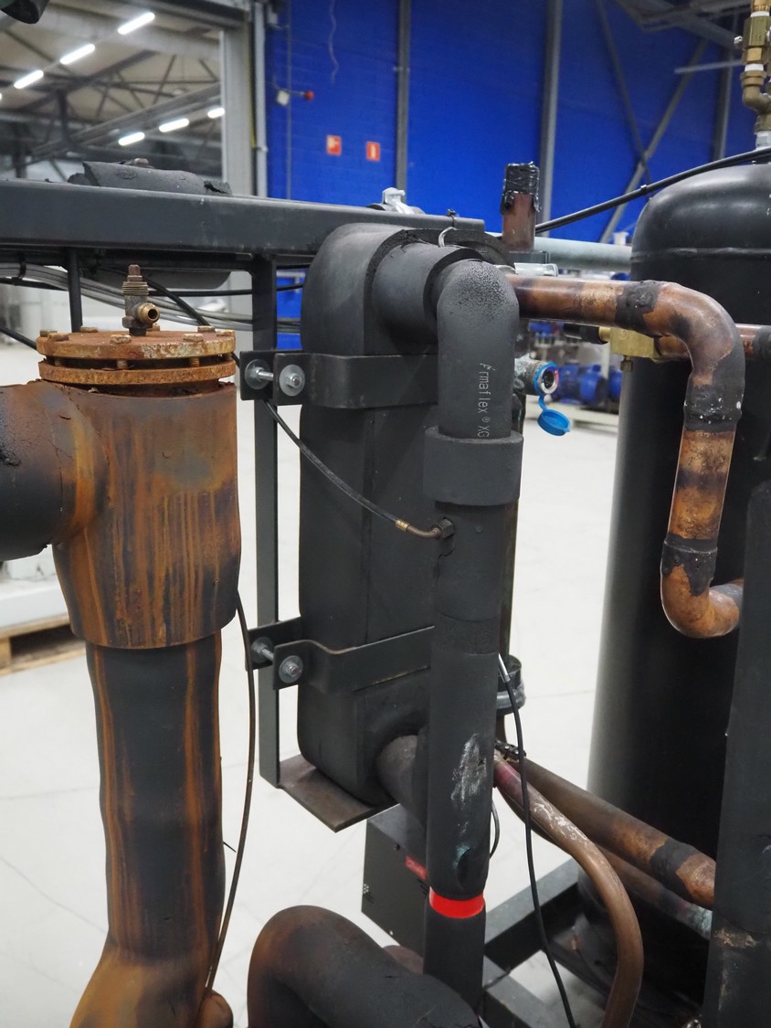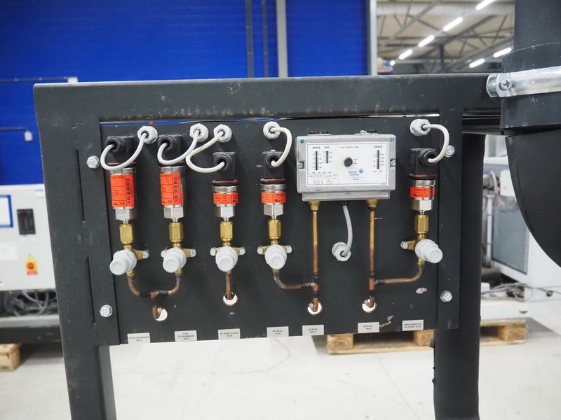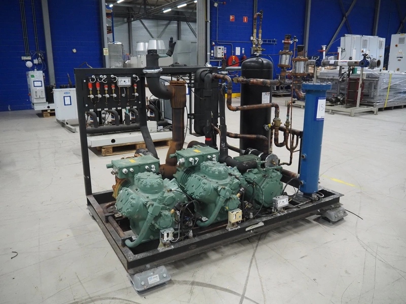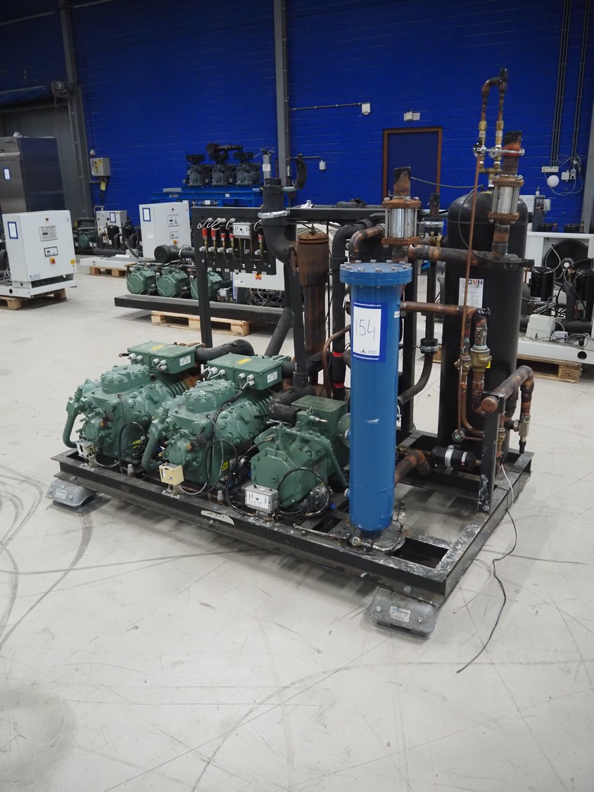 Bitzer Kühlmaschinenbau GmbH compressor rack with 3 cooling compressors, type: (2x) 6HE-25Y-40P, capacity: 110.5/156.2 m³ per hour, (1x) 4EES-6Y-40S, capacity: 22.7/27.4 m³ per hour, dimensions: 2000 mm x 1300 mm x 1850 mm.