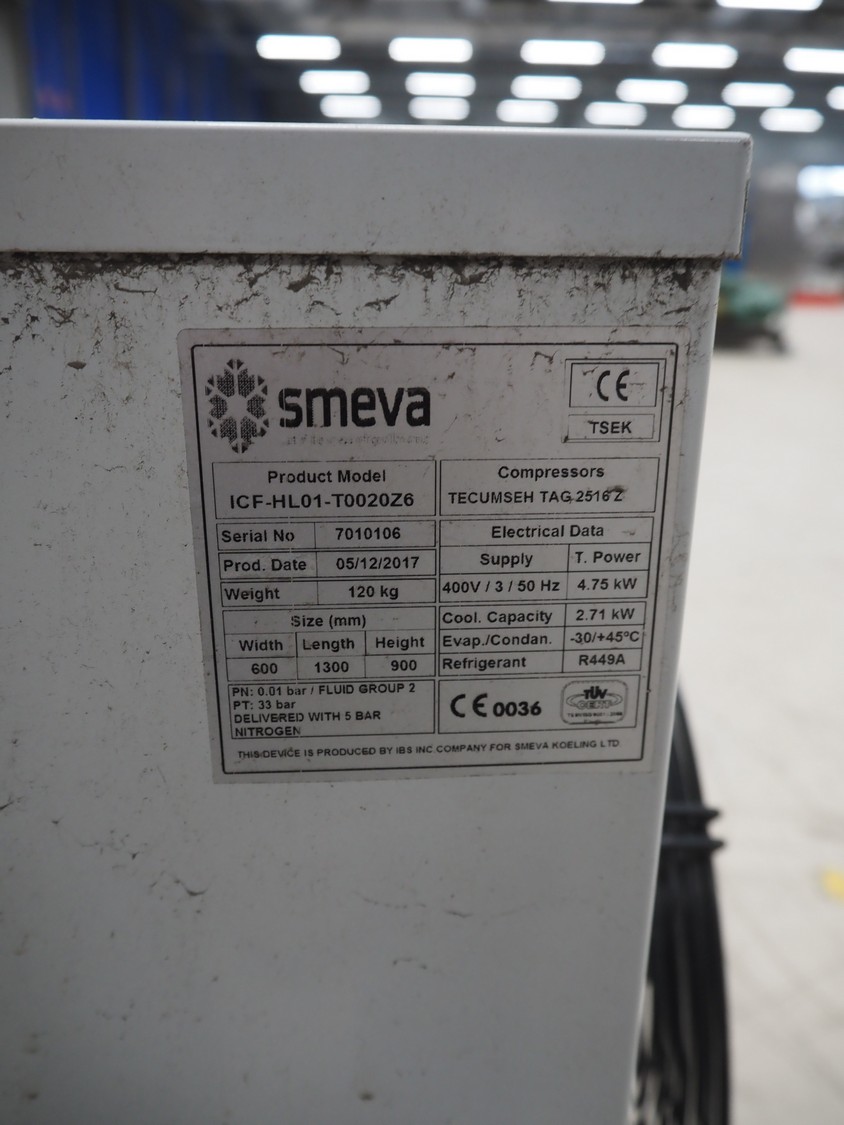 Smeva condensing unit with Tecumseh cooling compressor, type: condensing unit: ICF-HL01-T0020Z6, serial number: 7010106, year of construction: 05/12/2017, type Tecumseh cooling compressor: Tag 2516 Z, 400 V, 3 Ph, 50 Hz, 4.75 W, refrigerant: R4490, dimensions: 1150 mm x 550 mm x 850 mm.