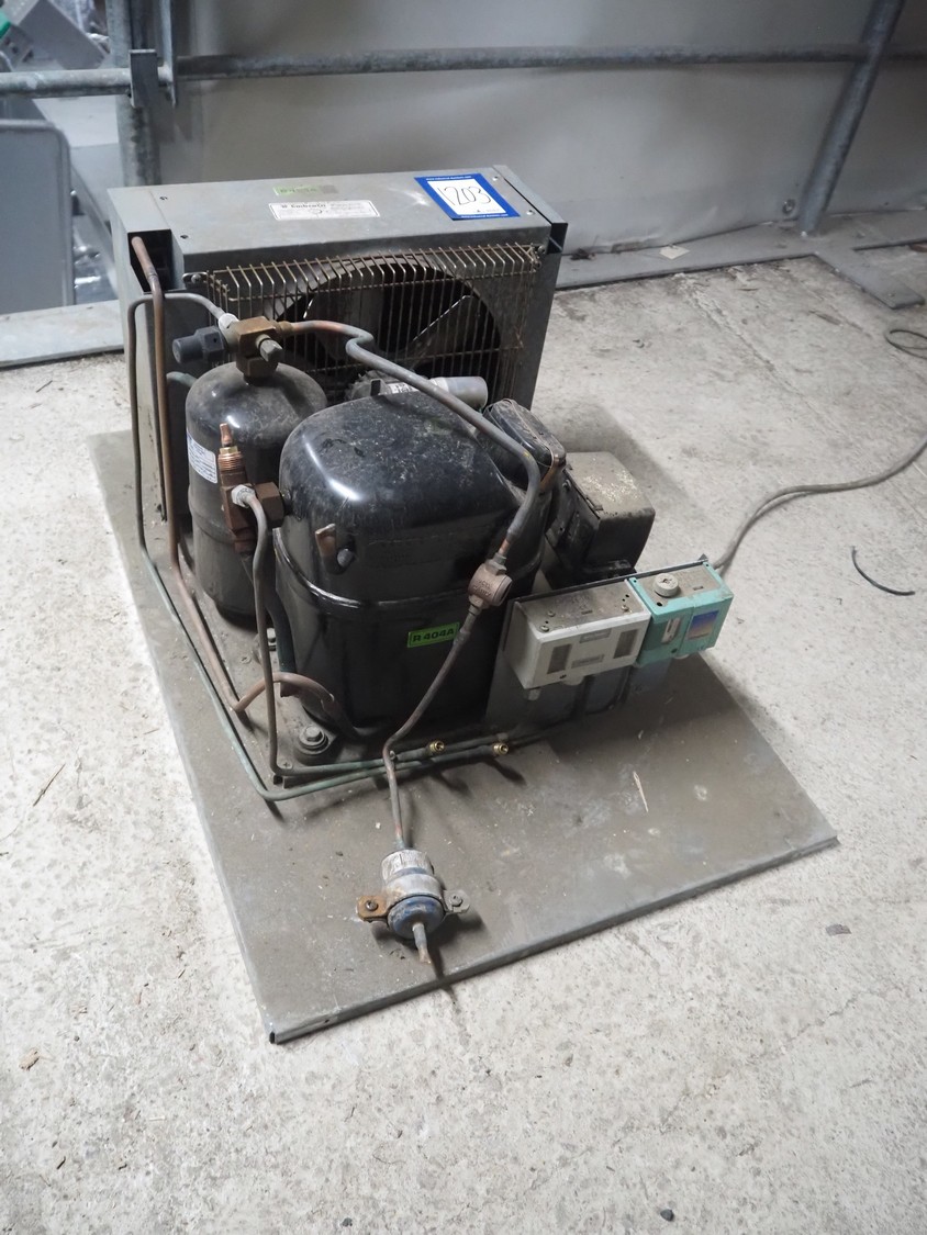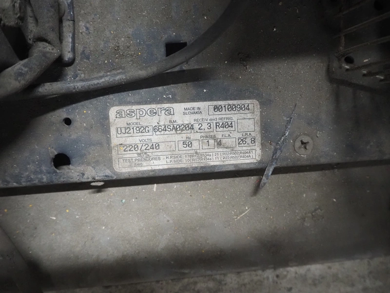 Aspera cooling compressor, model: UJ2192G, 220/240 V, 1 Ph, 50 Hz, refrigerant: R404, dimensions: 530 mm x 760 mm x 360 mm.