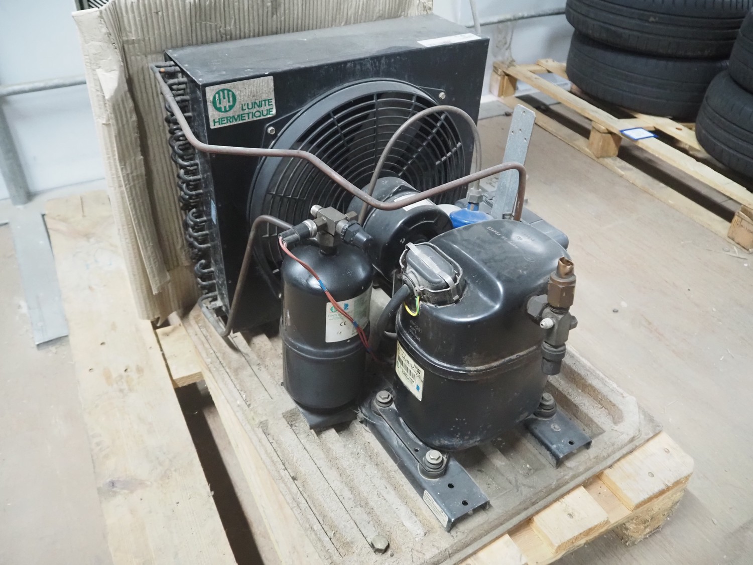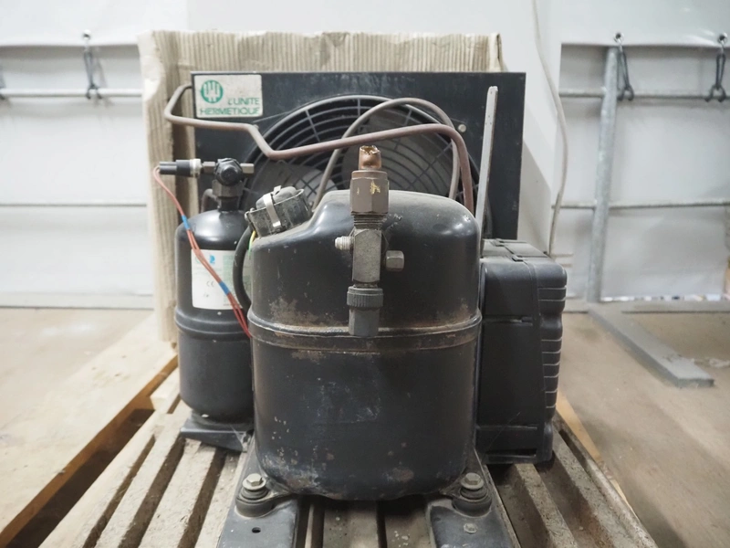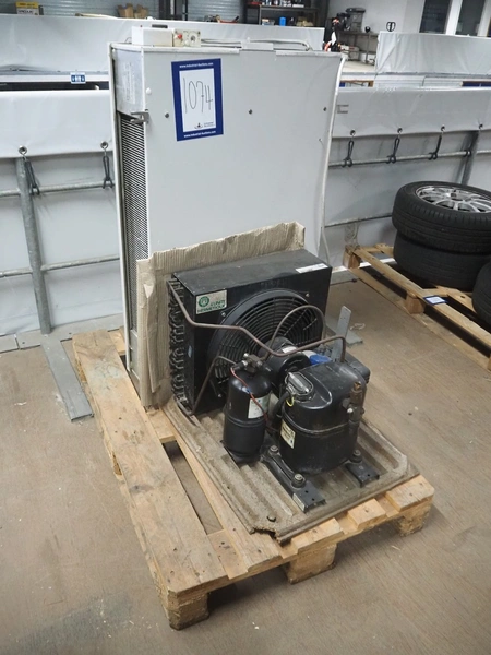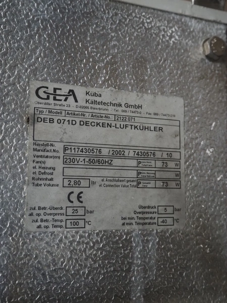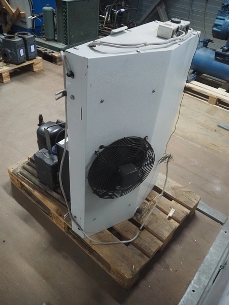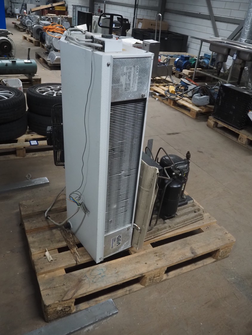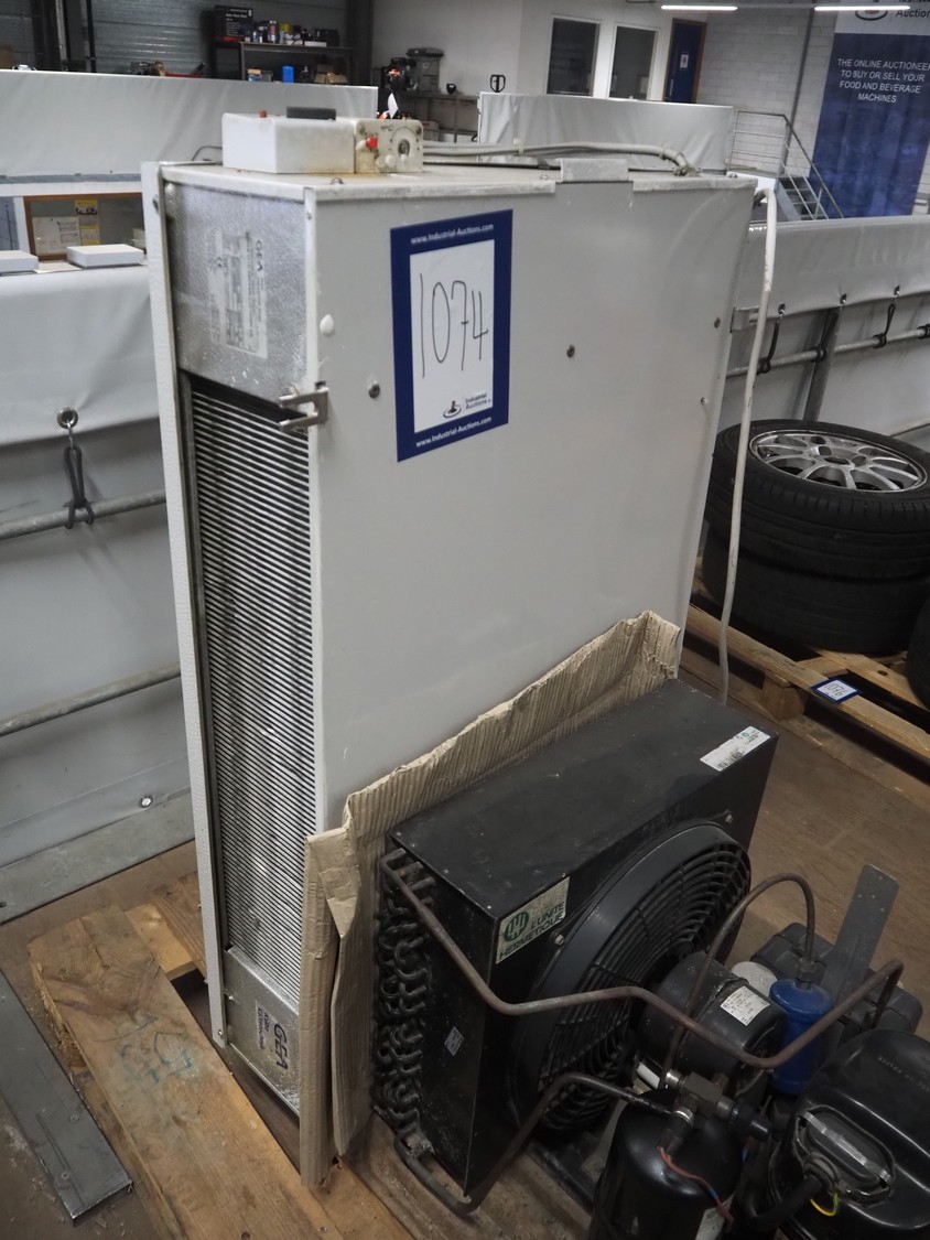 GEA evaporator, type: DEB 071D Decken-Luftkühler, number: P117430576, year of construction: 2002, 230 V, 1 Ph, 50/60 Hz, dimensions: 670 mm x 1050 mm x 240 mm with L'unite Hermetique cooling compressor, dimensions: 700 mm x 600 mm x 500 mm.